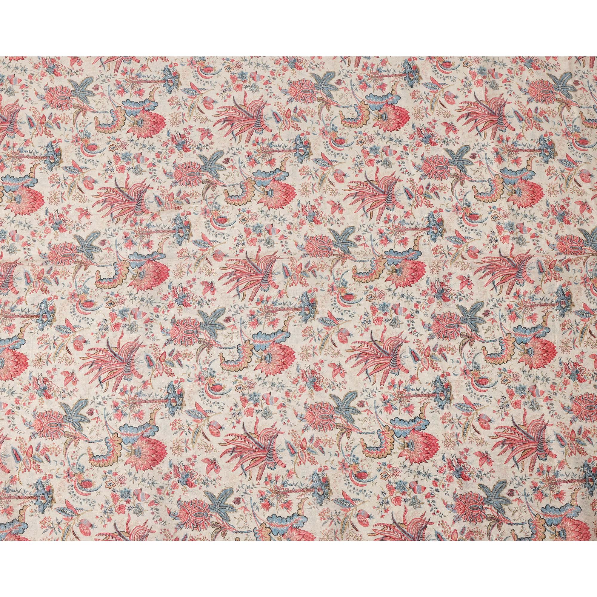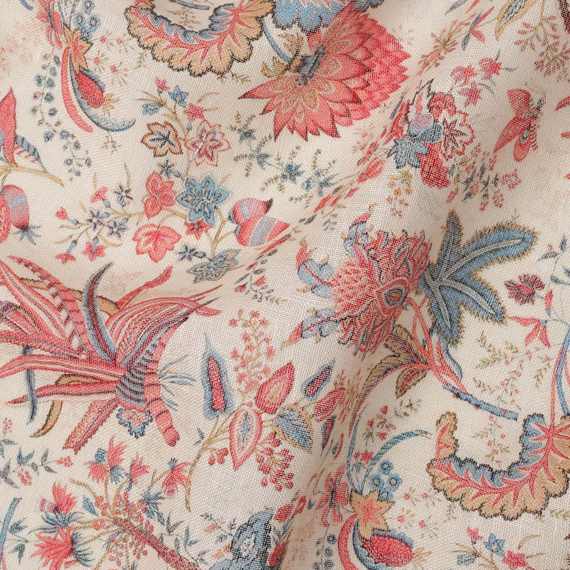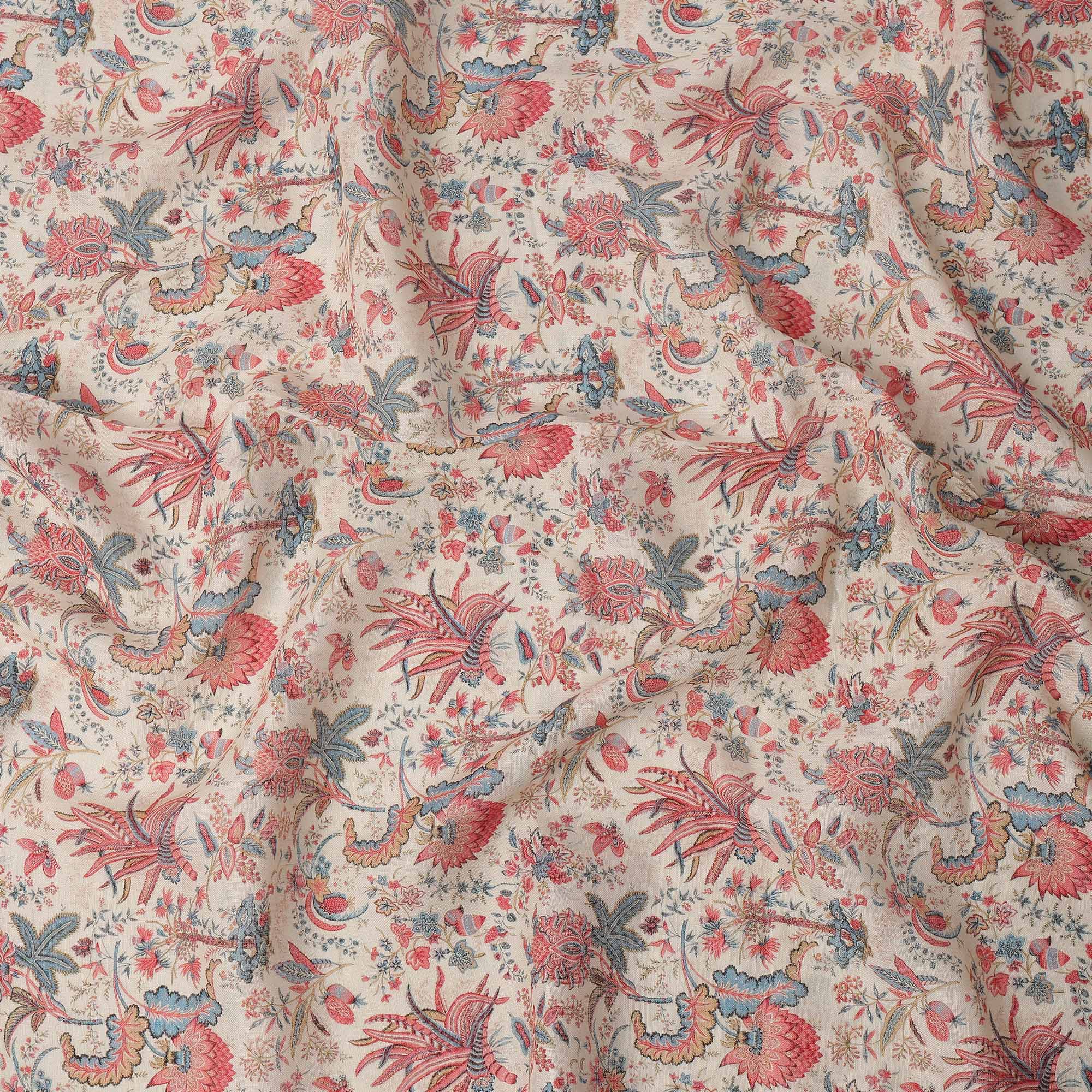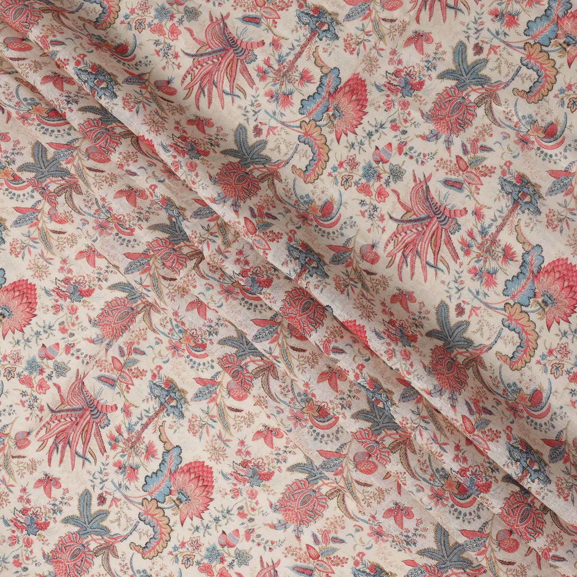 Beige Red Blue Floral Kalamkari Print Blended Linen Fabric, 110 Cms Width, Made in India-D26174
