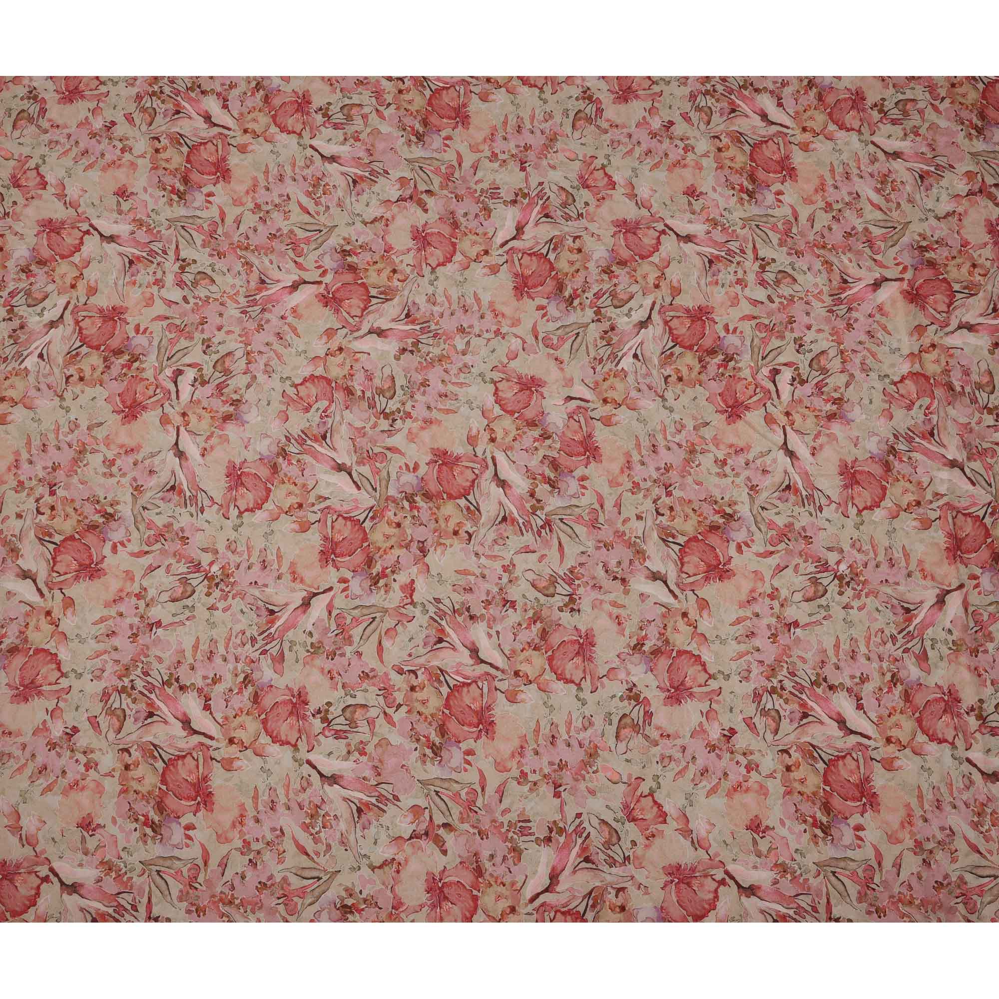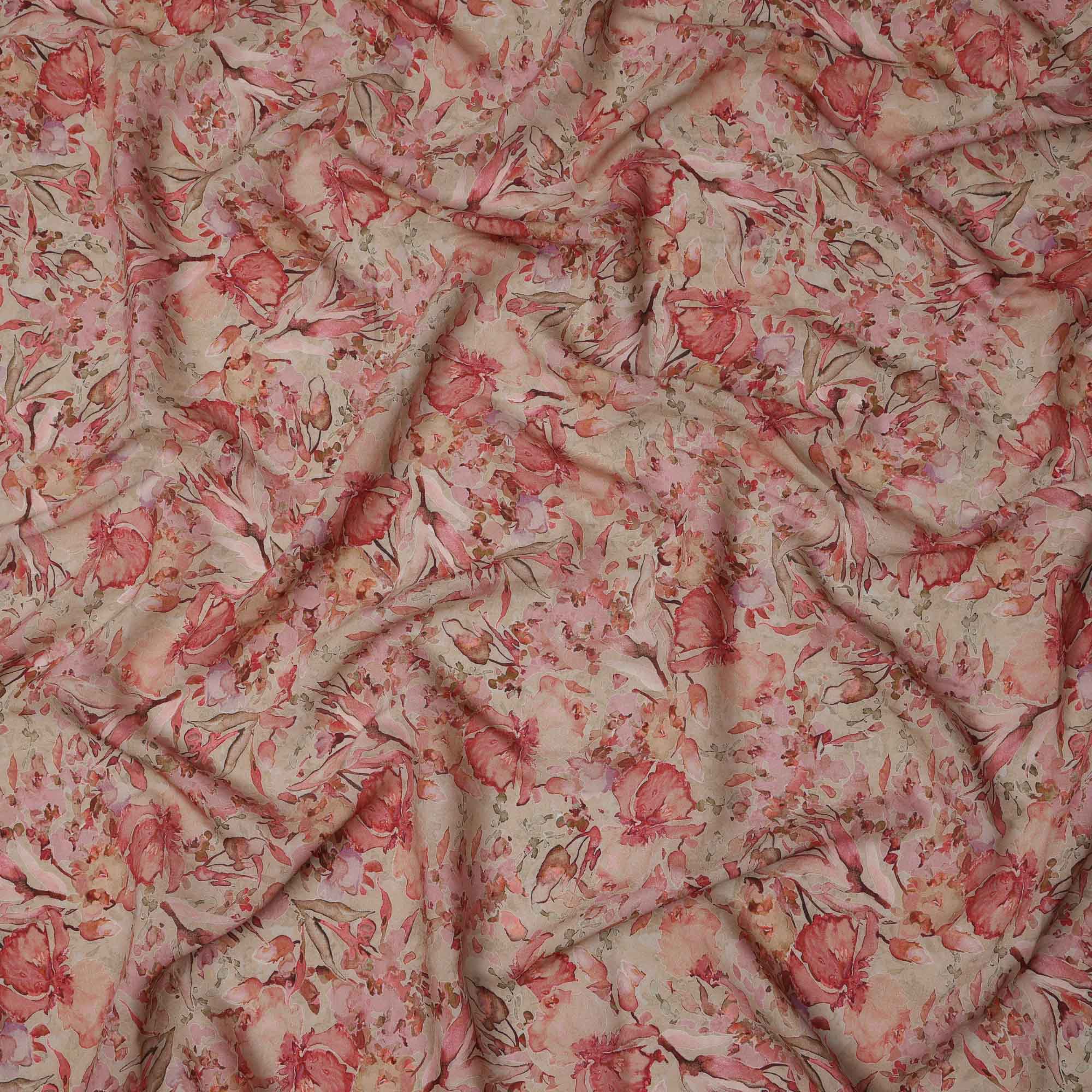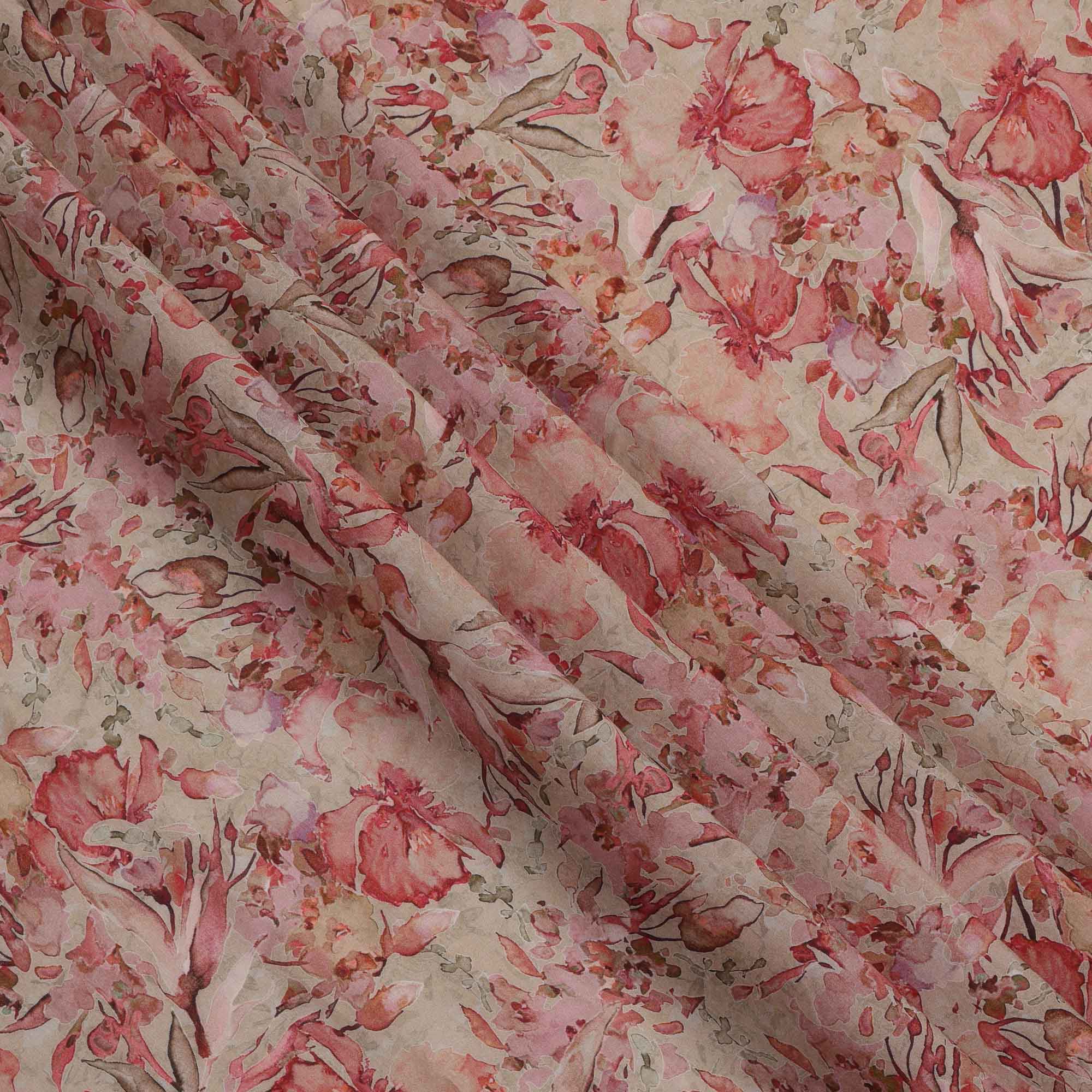 Beige Red Watercolor Floral Print Viscose Crepe Fabric, 110 Cms, India-D23471