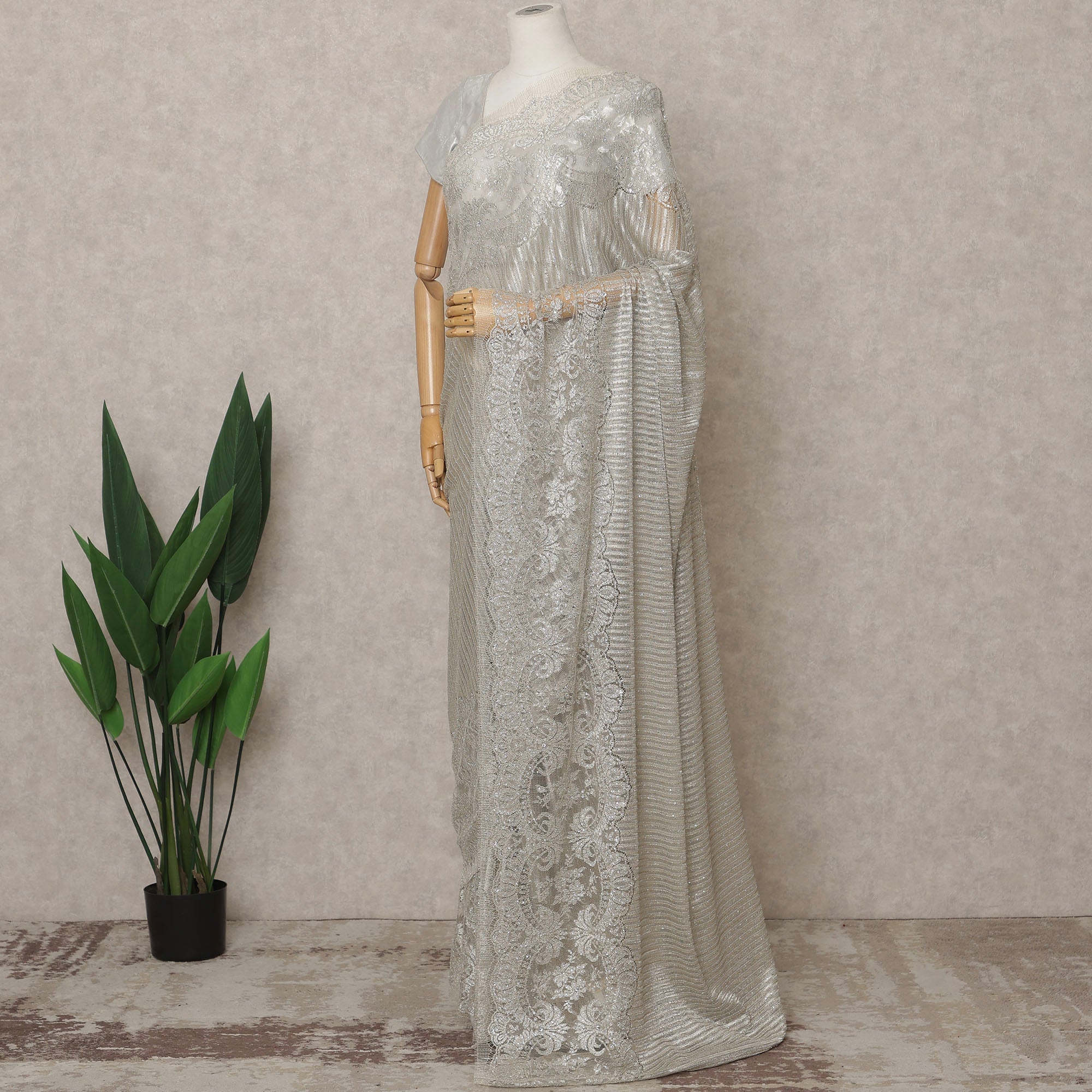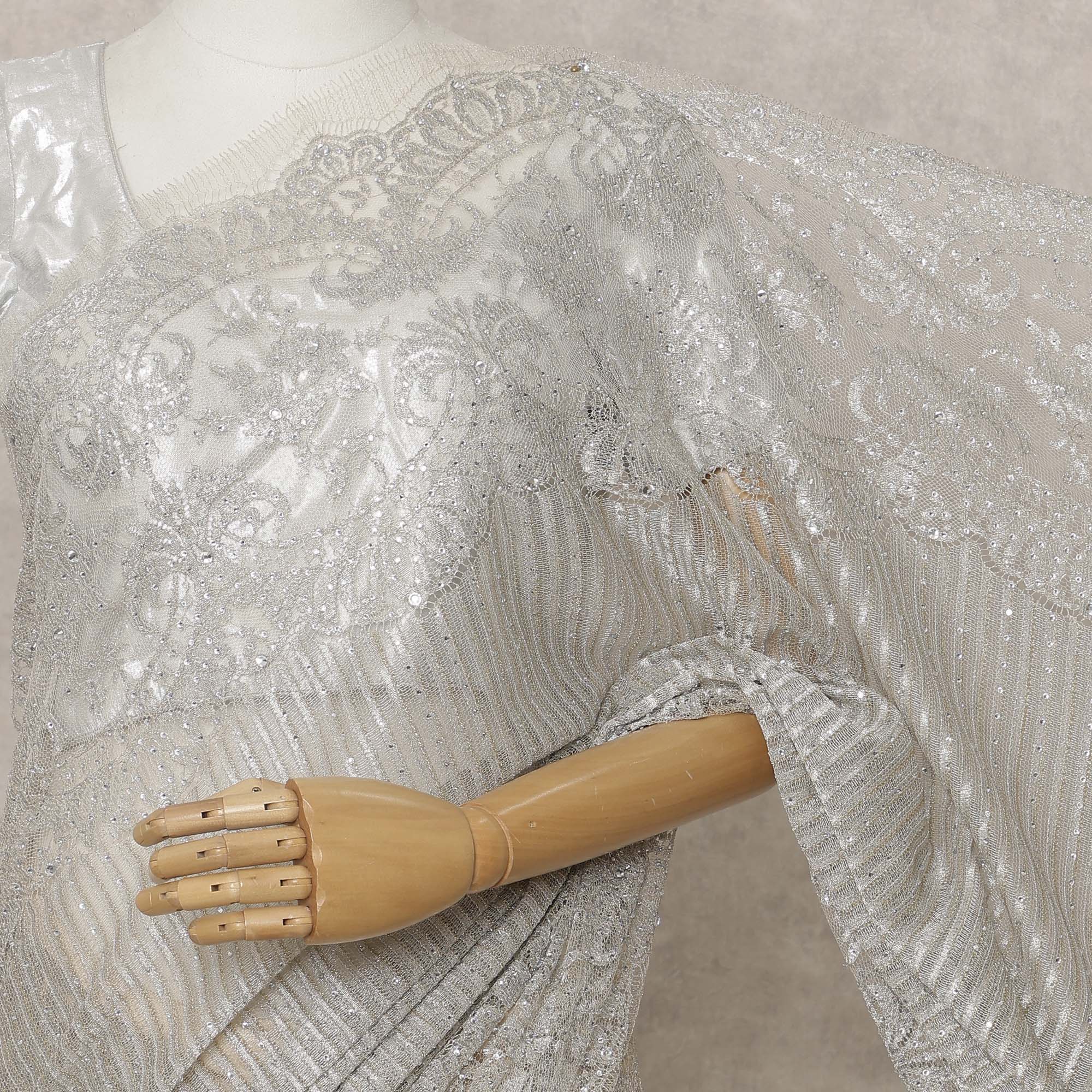 Beige Silver Premium French Metallic Chantilly Lace Saree with Stone Work, Width 110 Cms, 5.5 Mtrs, France-D25593