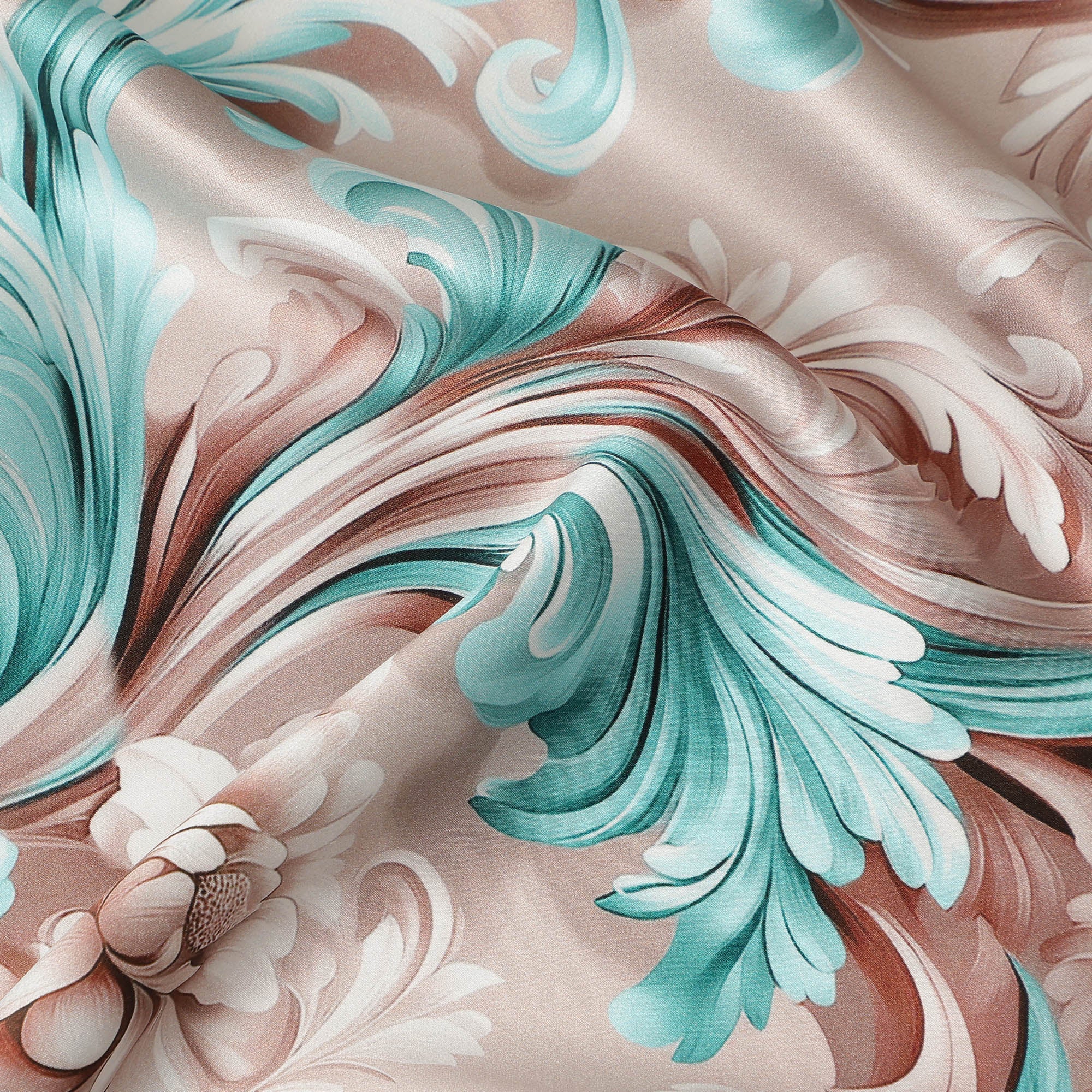 This premium pure silk satin fabric features a soft beige base highlighted with elegant teal and brown baroque floral swirls,... Read more Read more