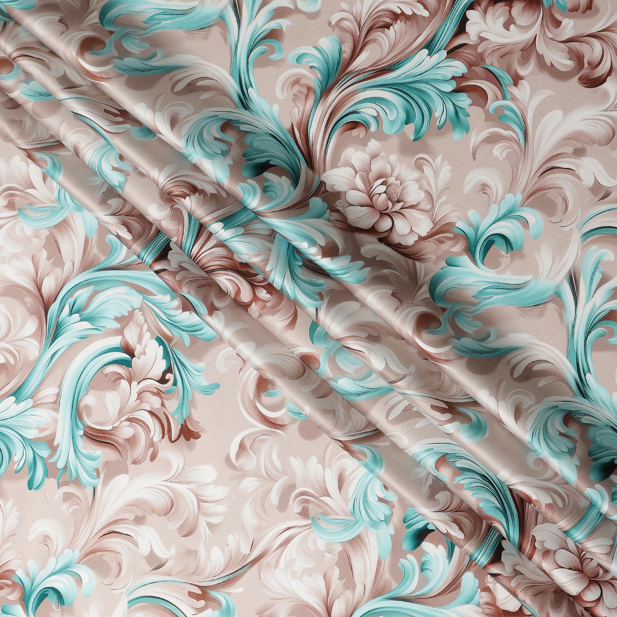 Beige Teal Baroque Floral Printed Premium Pure Silk Satin Fabric Smooth Lustrous Designer Finish 140 Cms Width, 3.5 Mtrs Piece and Made in Italy-D27198