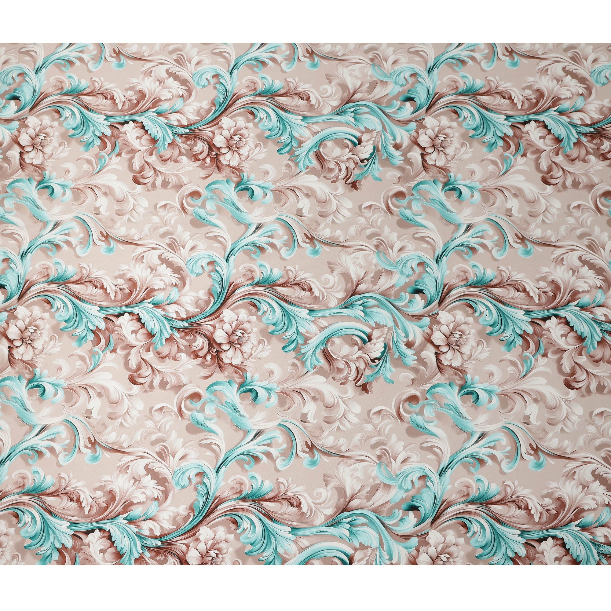 Beige base with teal baroque floral print offers a refined and luxurious designer look.