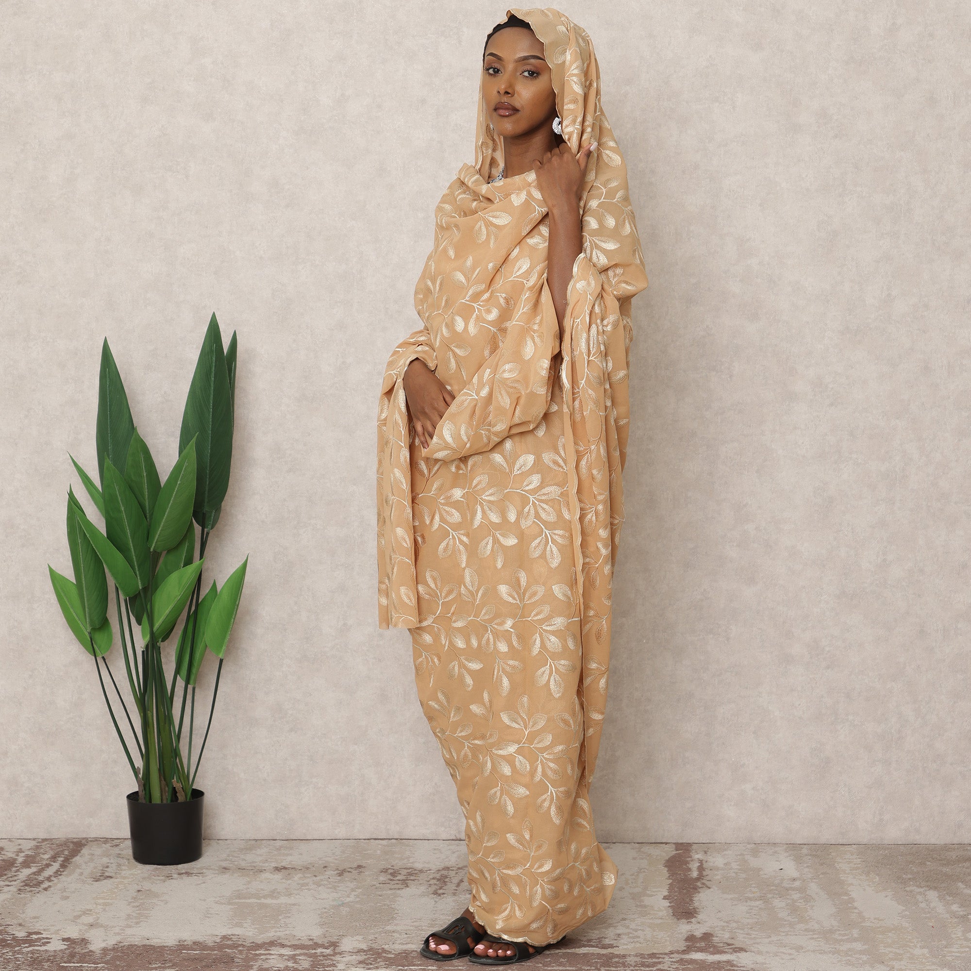 Step into graceful tradition with this Beige Traditional Sudanese Thobe, exquisitely crafted from premium pure cotton voile and beautifully embroidered with shimmering golden leaf motifs that lend a refined yet radiant touch. Measuring 4.5 meters in length and 140 cm in width, this thobe provides generous coverage for traditional Sudanese draping while ensuring breathable comfort and a lightweight feel. The warm beige base paired with intricate golden embroidery gives it an understated luxury, making it suitable for prayer, cultural gatherings, or festive occasions. Designed and made in India, the fabric drapes effortlessly with a smooth texture that’s gentle on the skin, and its leaf-patterned embroidery adds elegance to every fold. With a simple hand wash, it maintains its brilliance and softness, making it both stylish and practical. Buy online now to bring home this modest yet eye-catching piece and celebrate the fusion of cultural artistry and Indian textile excellence—shop online for timeless ethnic elegance.