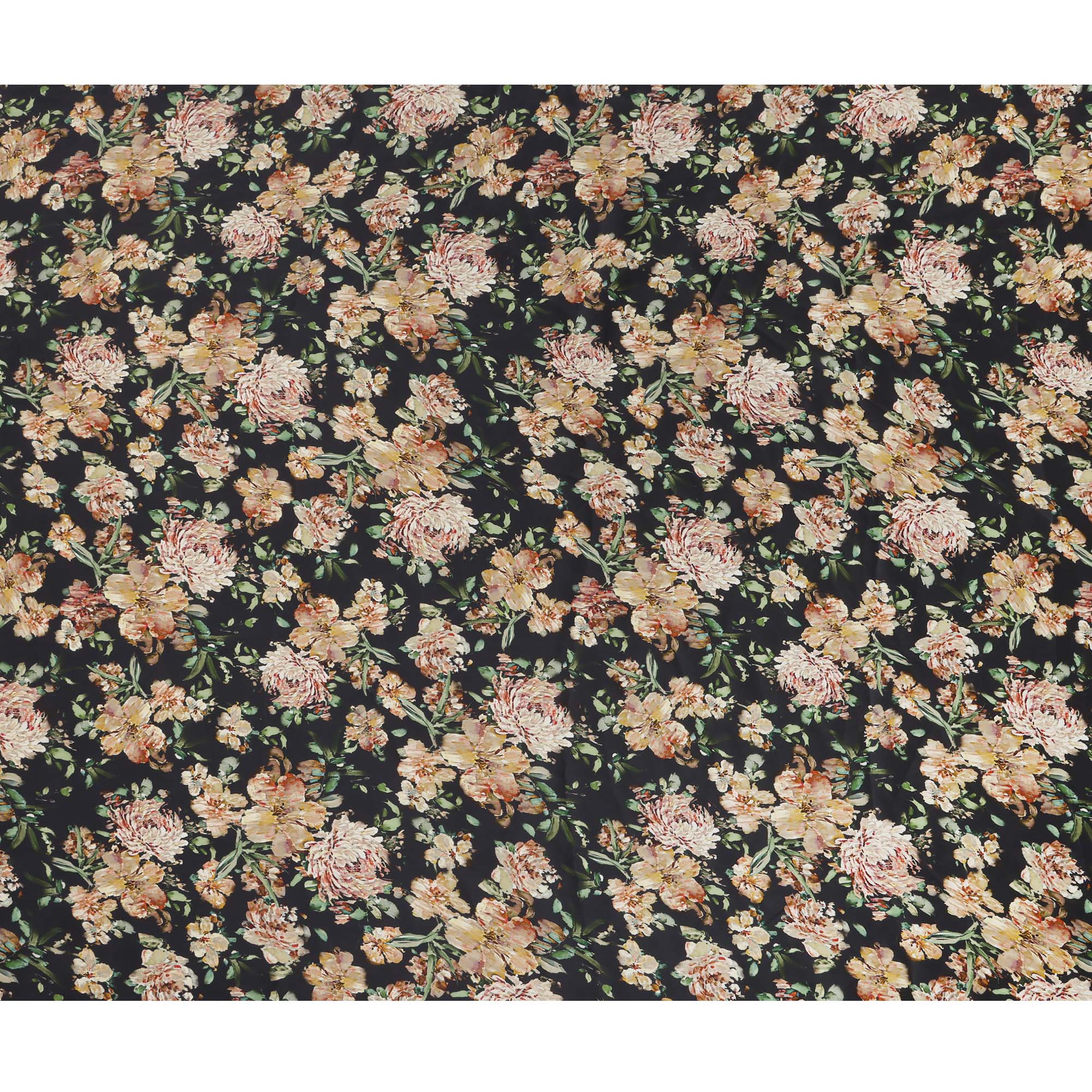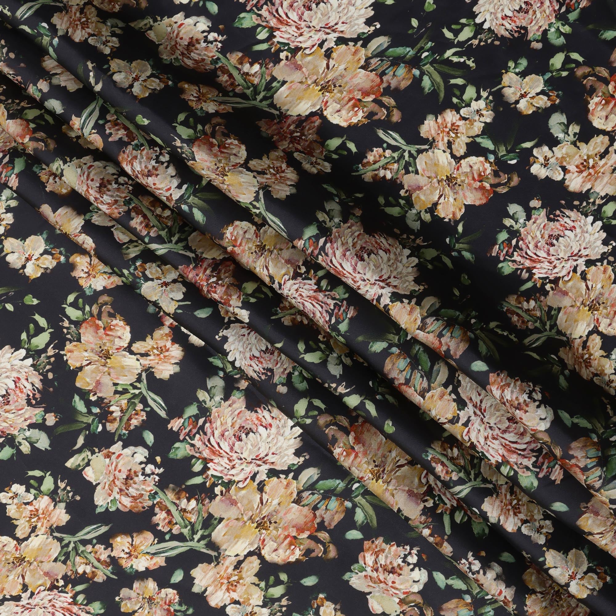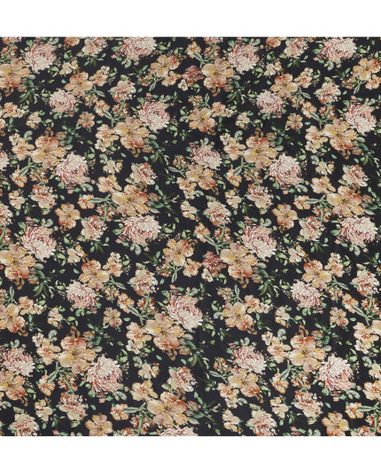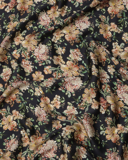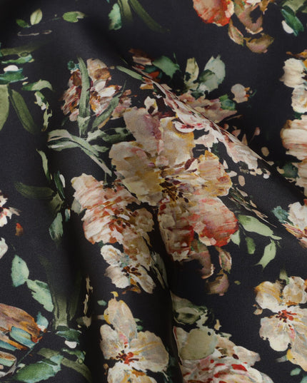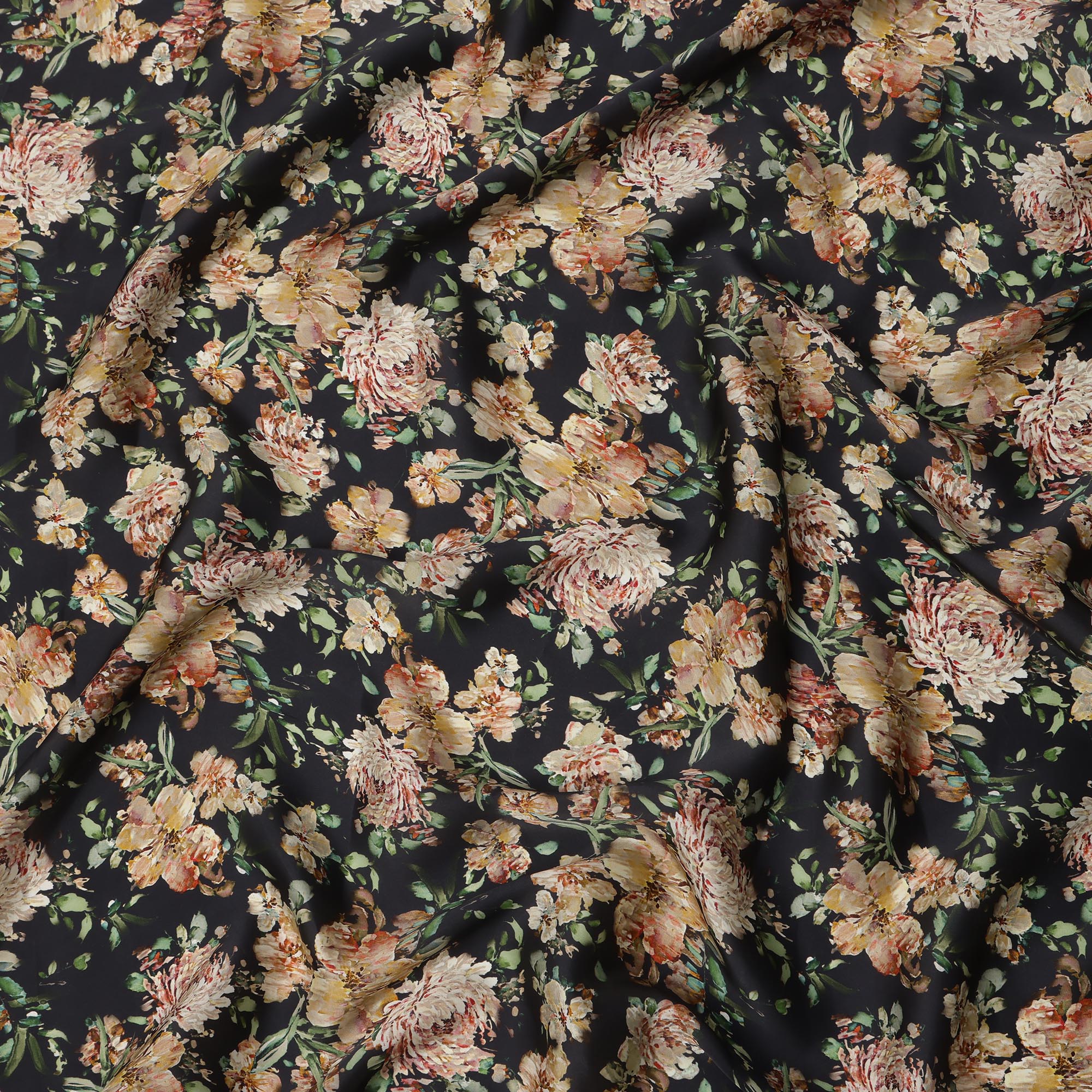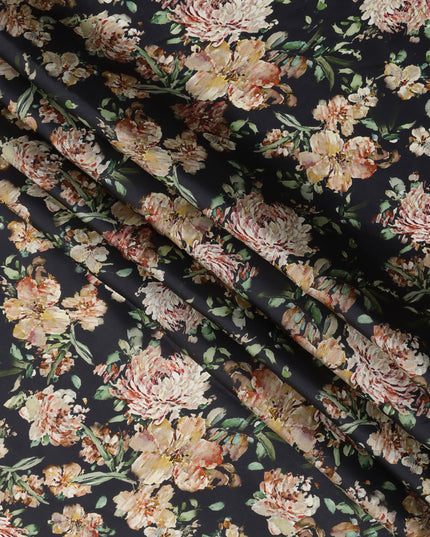 Enhance your designs with this black and beige floral synthetic satin fabric, featuring a beautifully detailed floral pattern in warm beige, cream, and green shades against a deep black background. The 110 cm wide fabric has a smooth, glossy texture that provides a luxurious drape, making it perfect for dresses, scarves, blouses, and elegant home décor. Its lightweight and breathable texture ensures comfort while maintaining durability and a sophisticated sheen. Whether for stylish fashion pieces or creative décor projects, this premium satin fabric offers versatility, elegance, and a flawless finish.