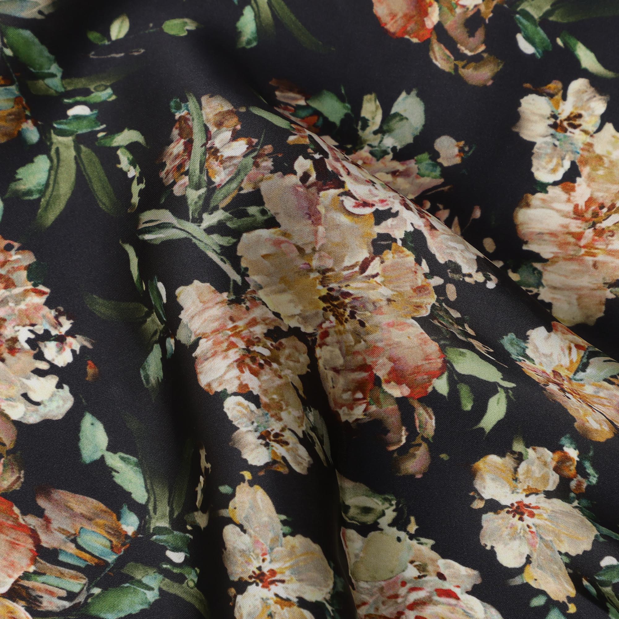 Black and Beige Floral Synthetic Satin Fabric – 110 cm Width, Soft & Lustrous-D21909