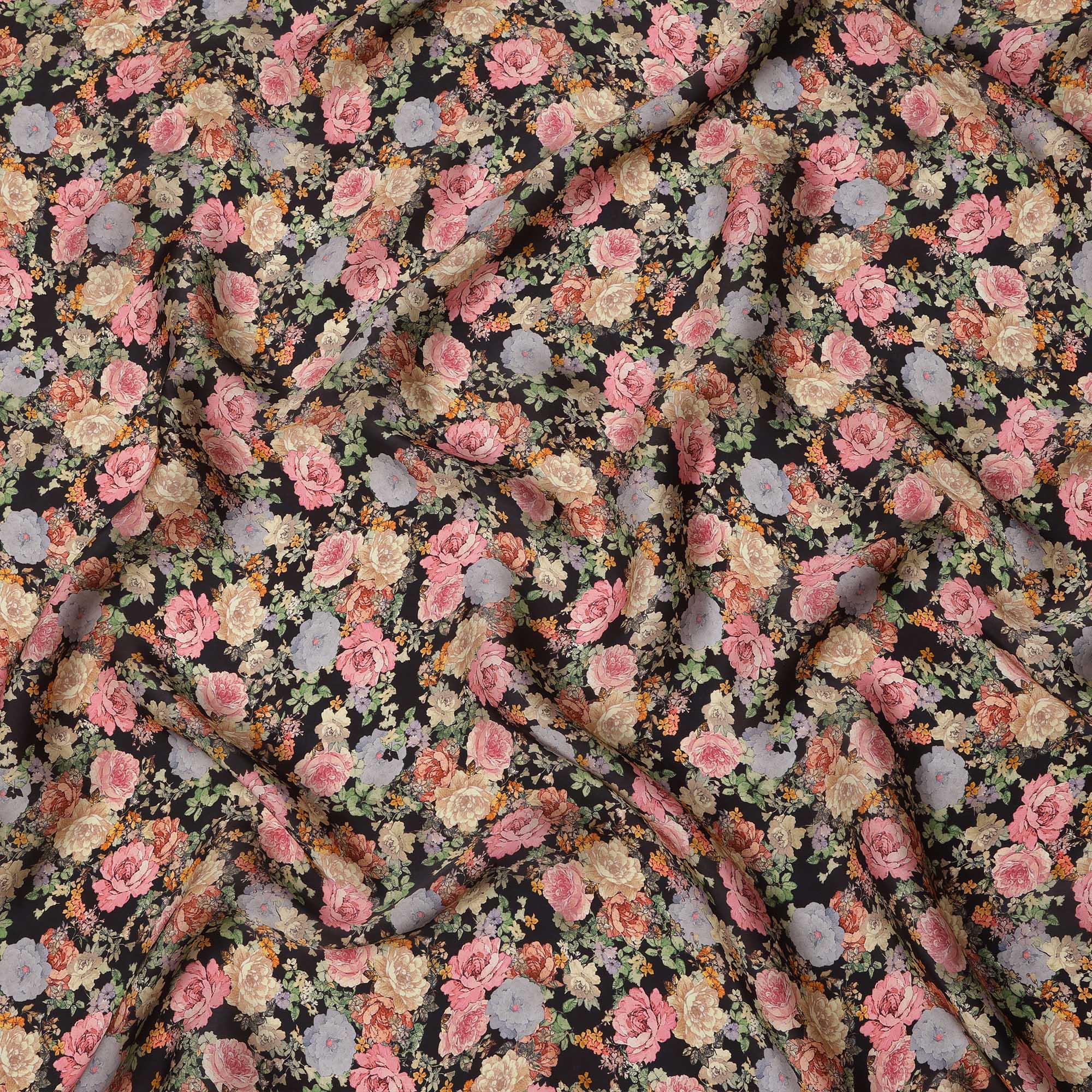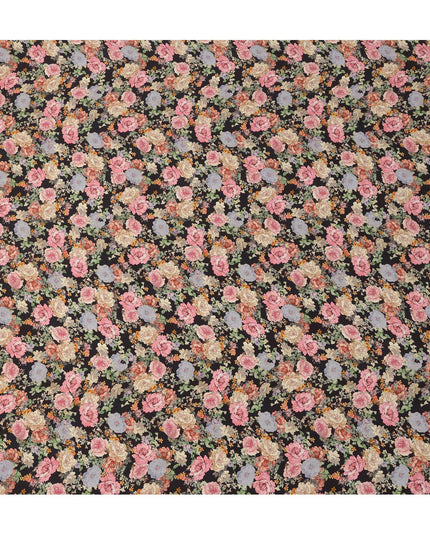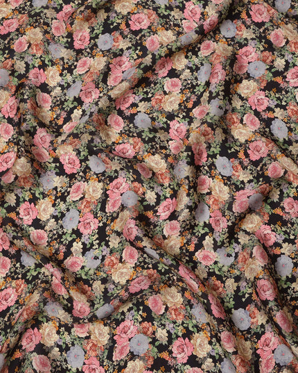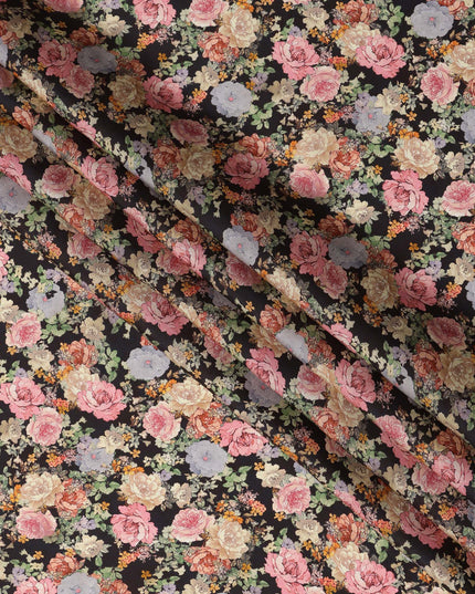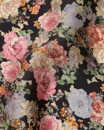 Black and Multicolor Floral Synthetic Satin Fabric – 110 cm Width, Soft & Lustrous-D21906