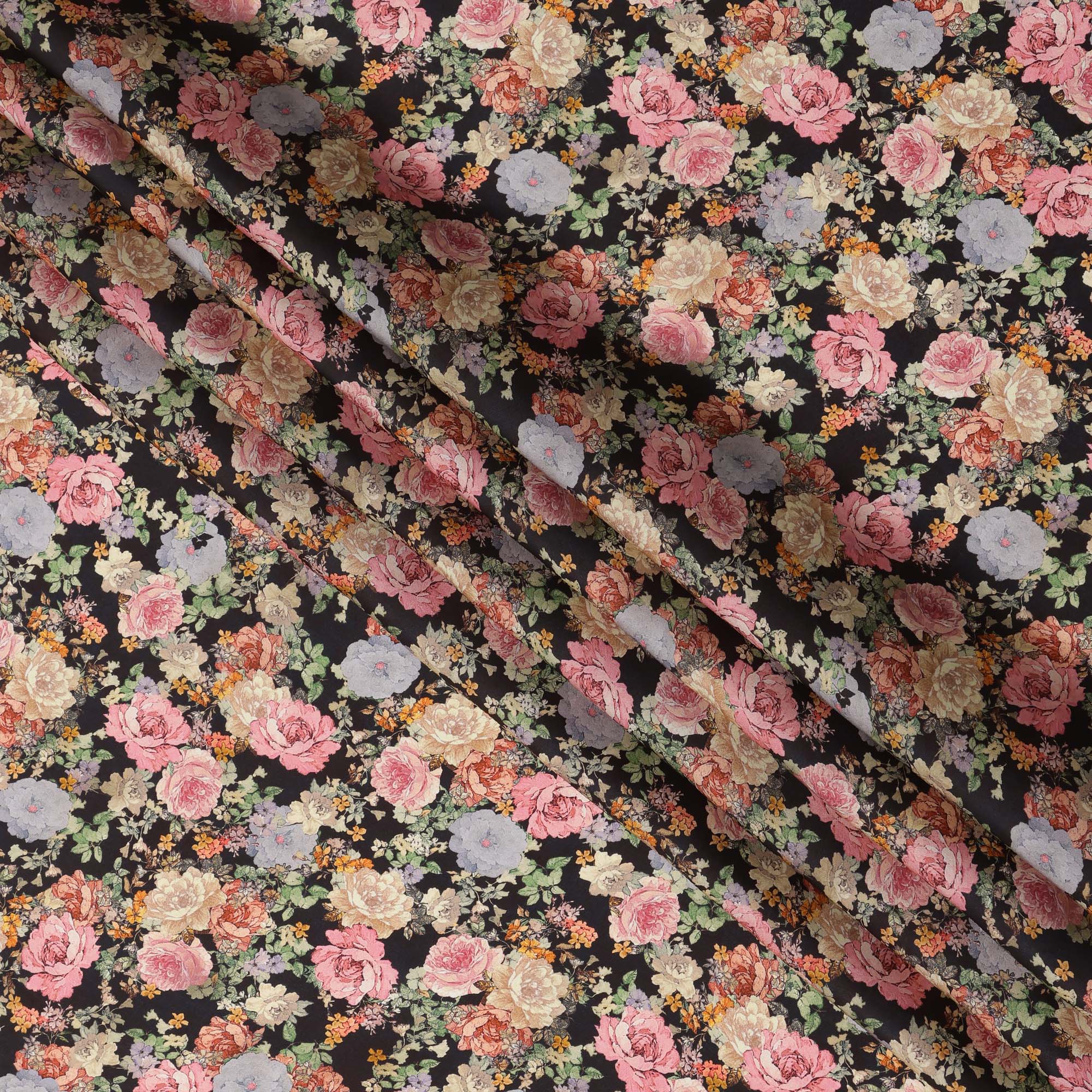 Enhance your wardrobe and décor with this black and multicolor floral synthetic satin fabric, featuring a rich floral design in... Read more Read more