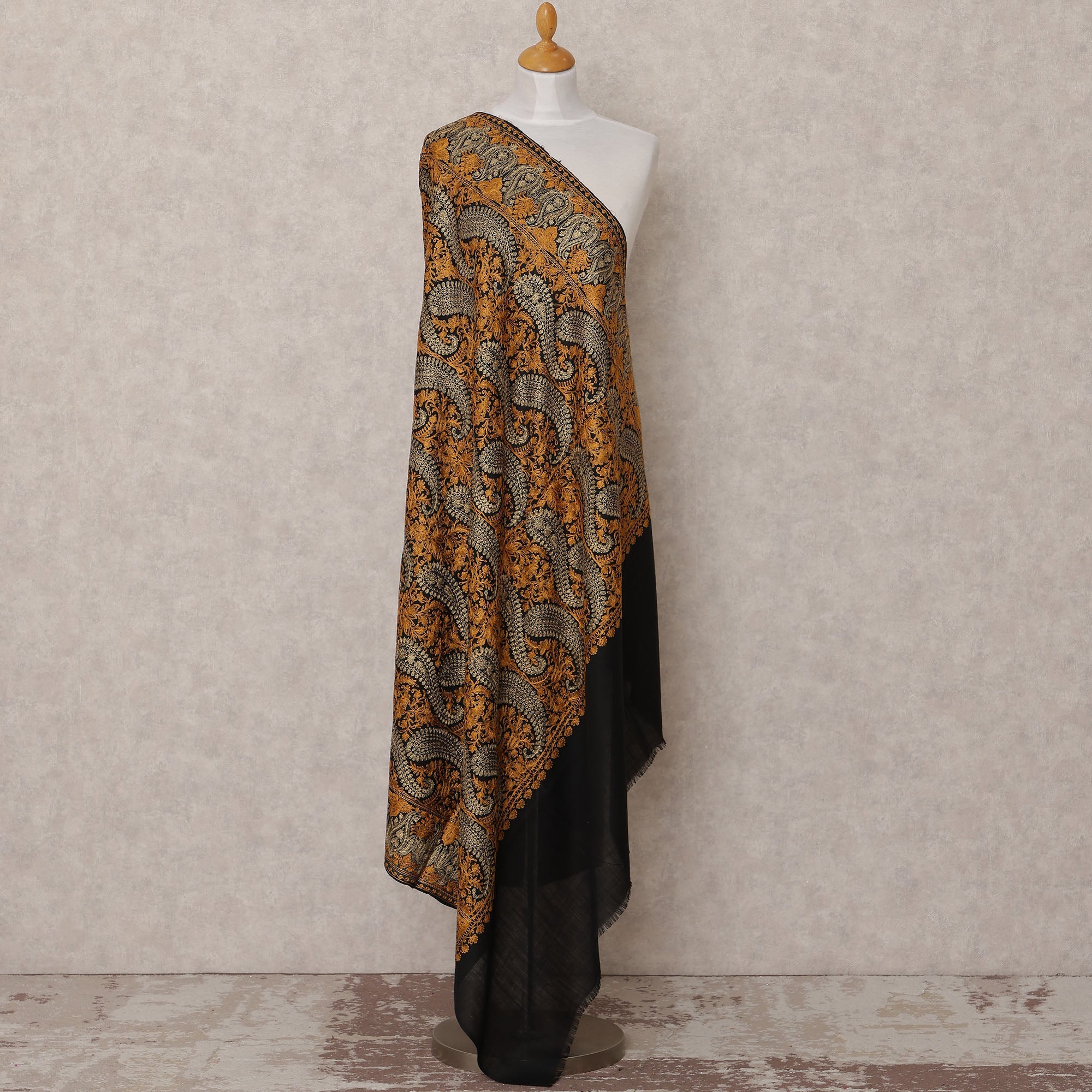 Black and mustard Kashmiri pashmina shawl with paisley and floral motifs