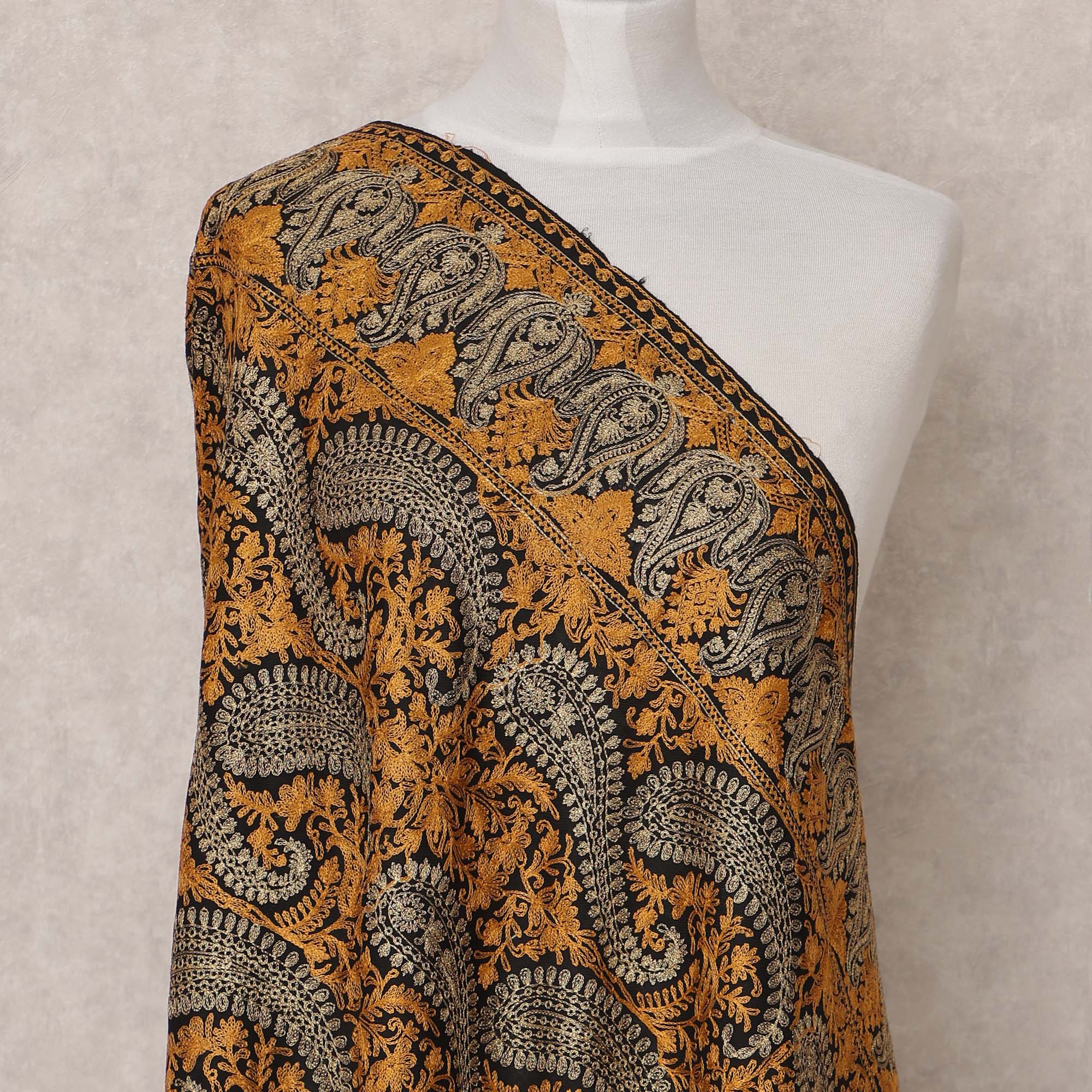 Black and Mustard Paisley and Floral Design Premium Kashmiri Pashmina Shawl with Traditional Weaving, Size 210X100 Cms, India-D24880