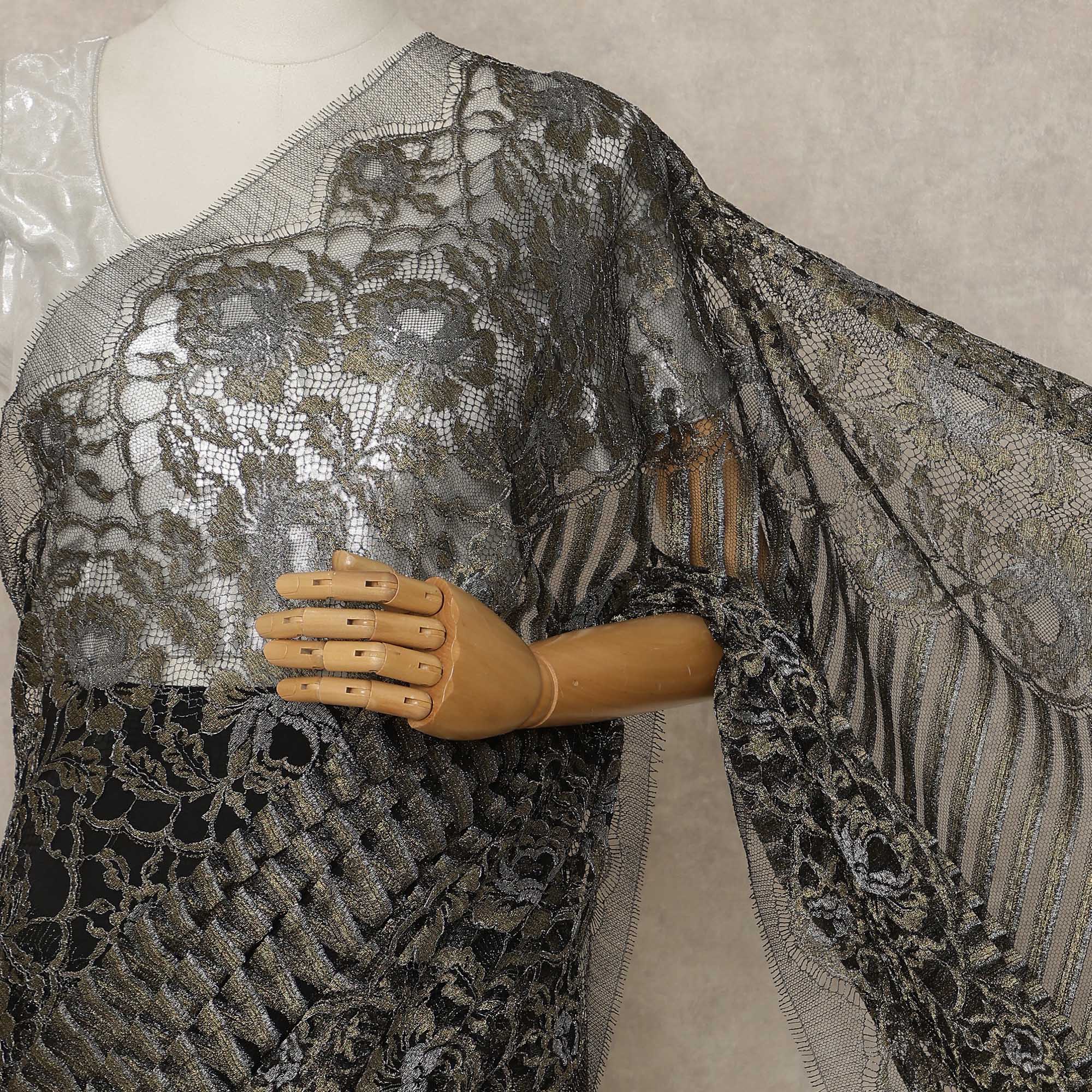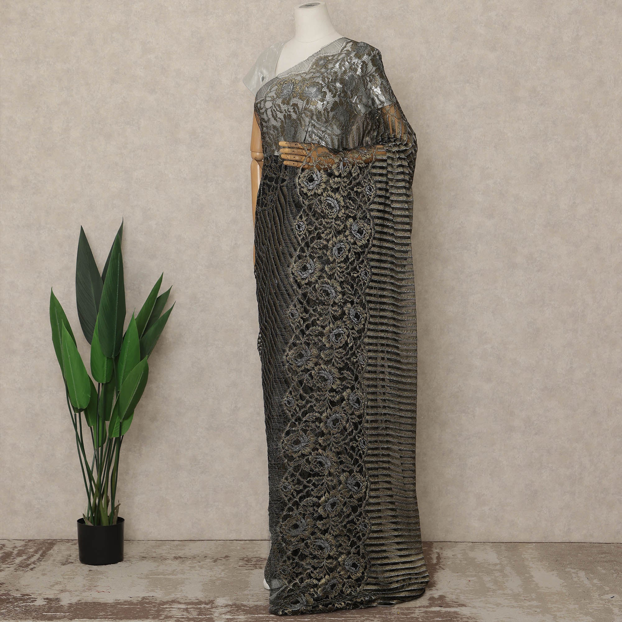 Striking black antique gold metallic Chantilly lace saree fabric with intricate woven patterns.