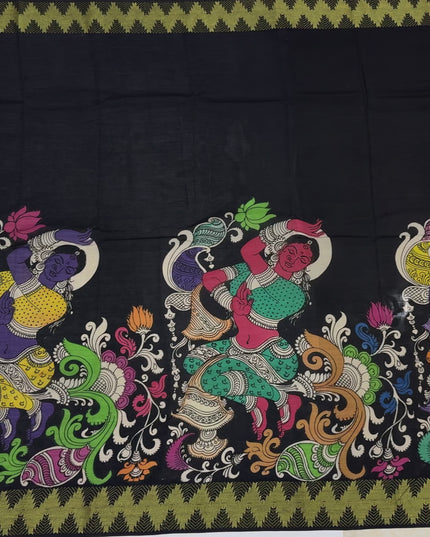 Black Bangalore Silk Pen Kalamkari Saree with Handpainted Mythological Art, Width 110 Cms, Origin: Sri Kalahasthi, India, 5.5 Mtrs with Blouse Piece-D22848
