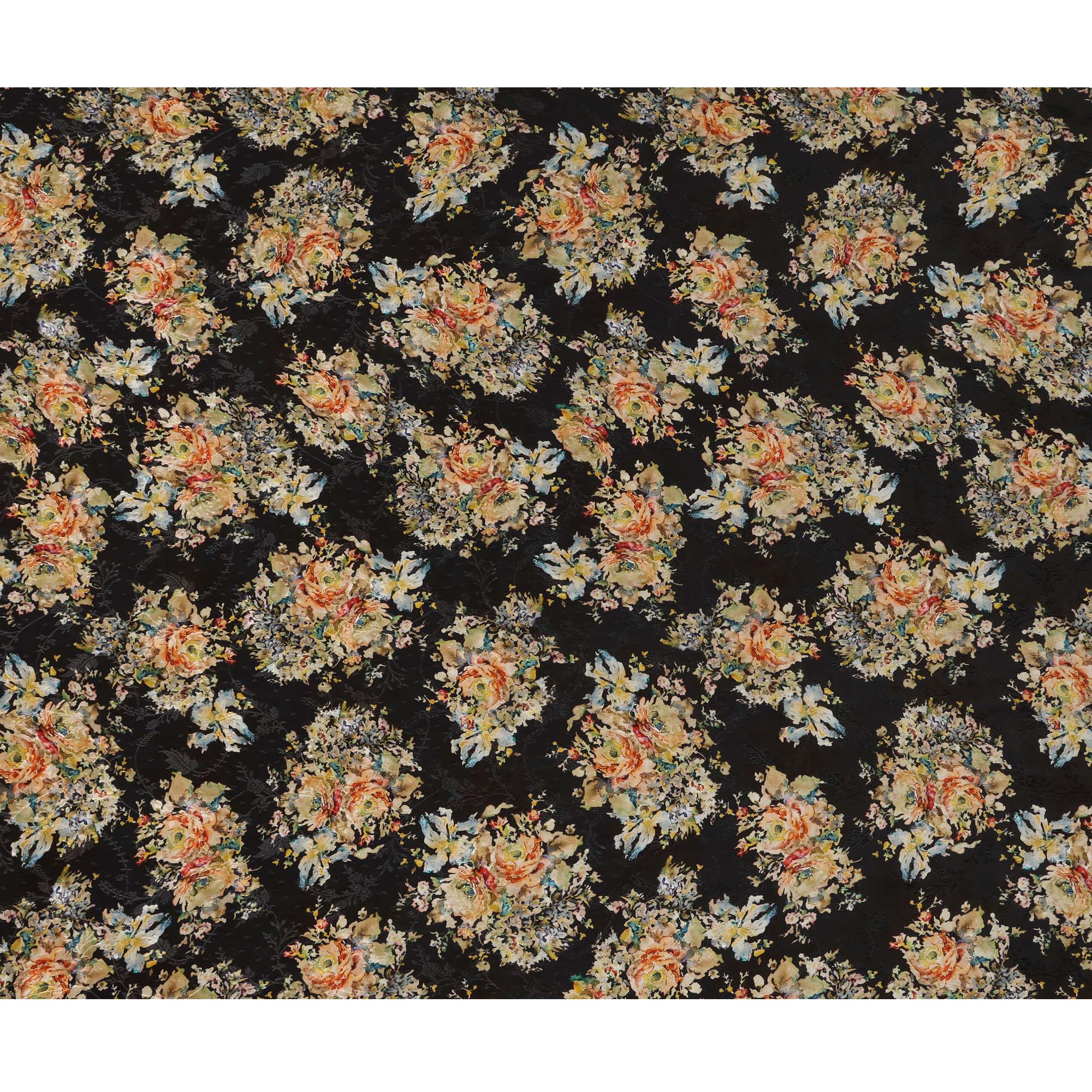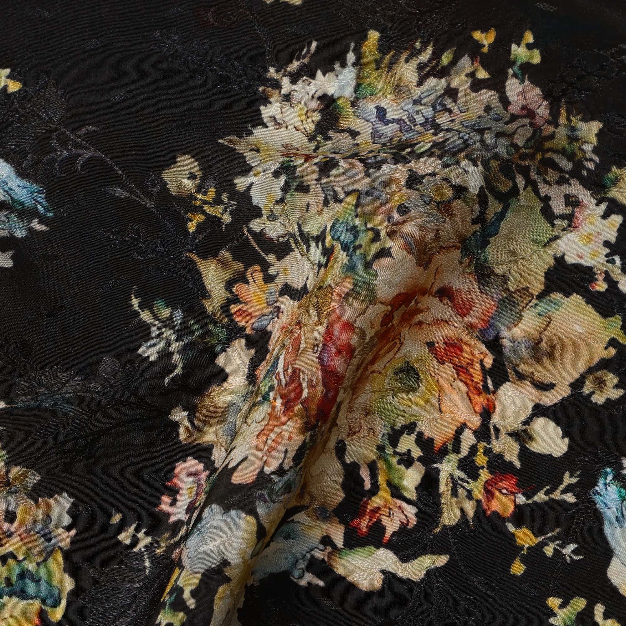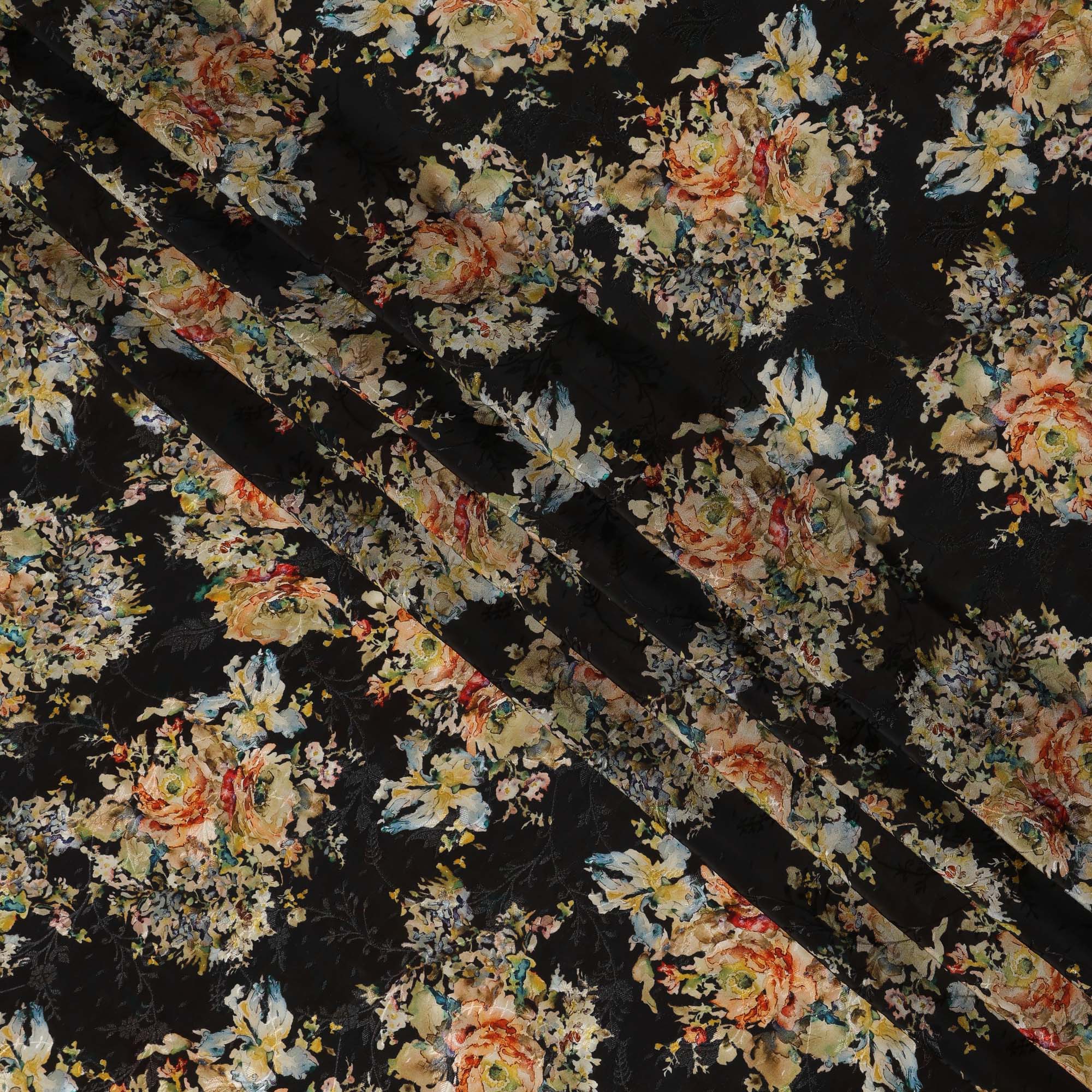 This black viscose crepe fabric is adorned with abstract multicolor floral motifs in a painterly style, featuring soft hues of... Read more Read more