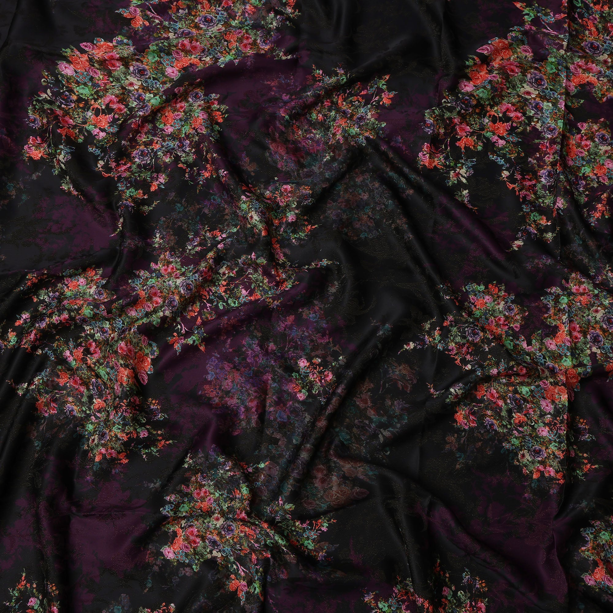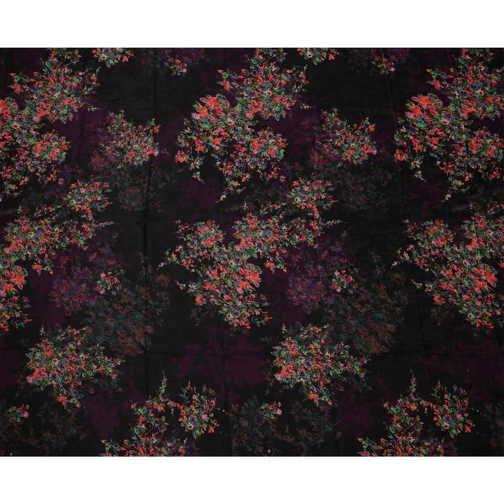 This black base multicolor floral bouquet printed pure silk satin fabric is a luxurious textile designed for elegance and sophistication.... Read more Read more