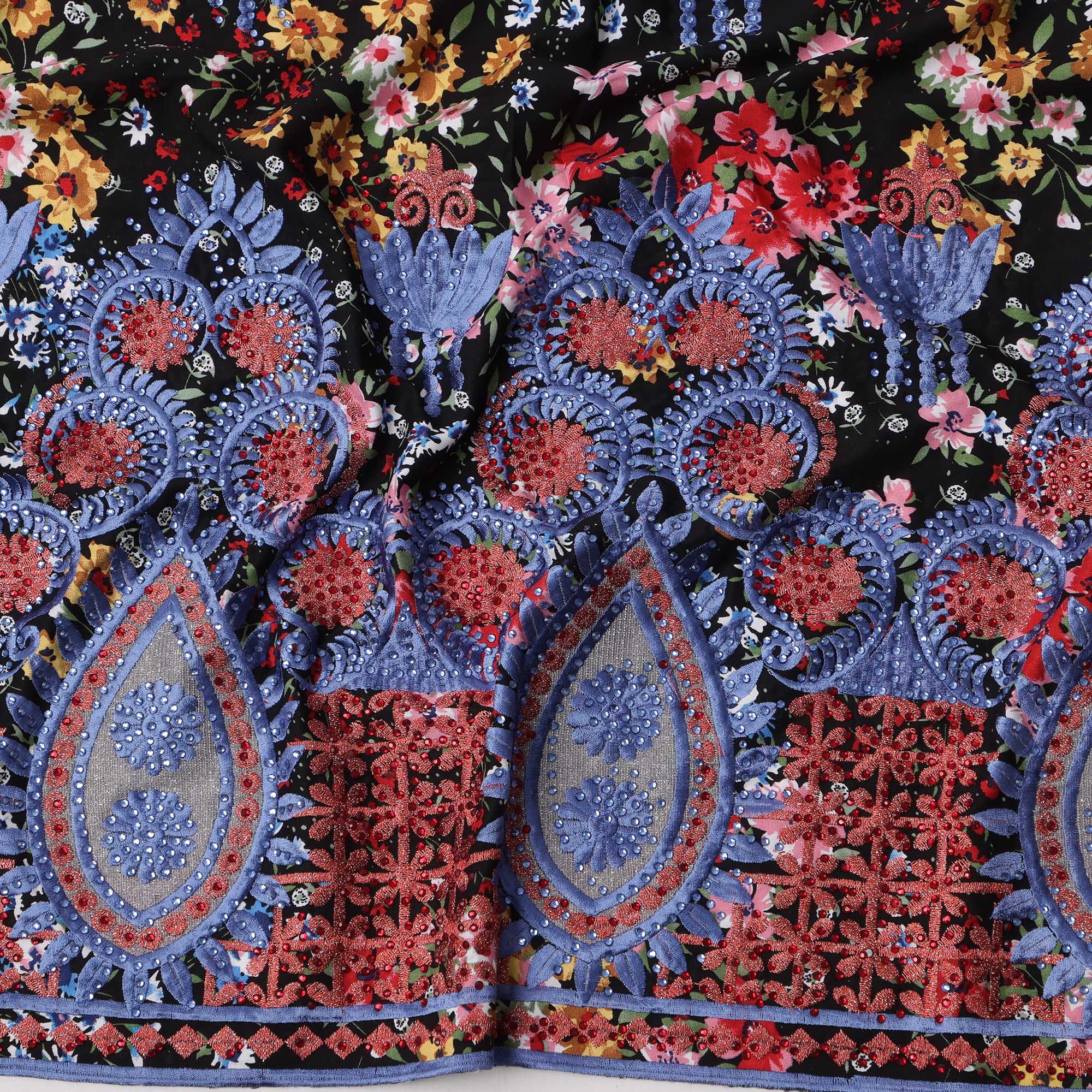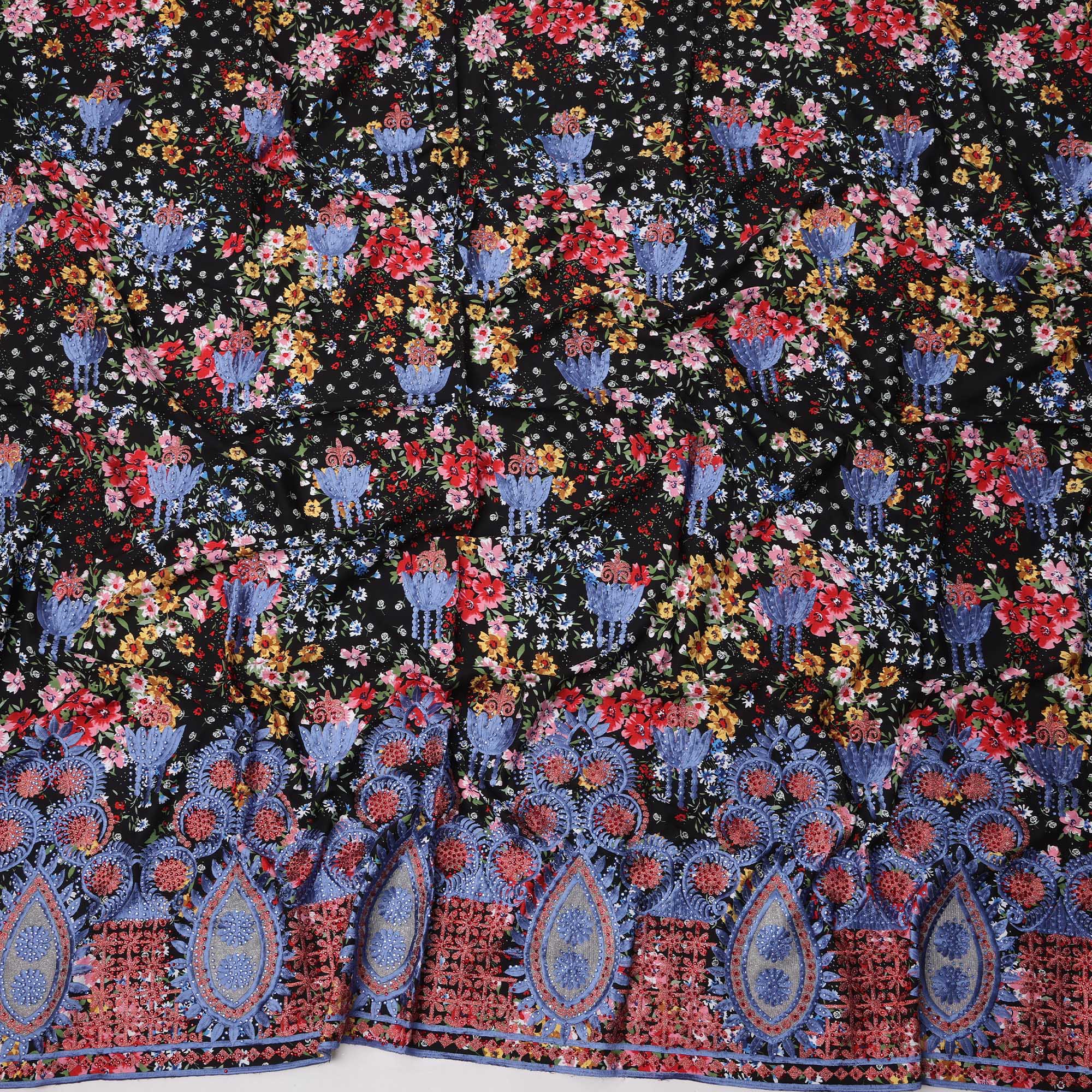 Black Base Multicolor Floral Print Cotton Fabric with Blue Embroidery and Heavy Ornamental Teardrop Border, 140 Cms Width, Made in India – 3 Meters Piece-D23708