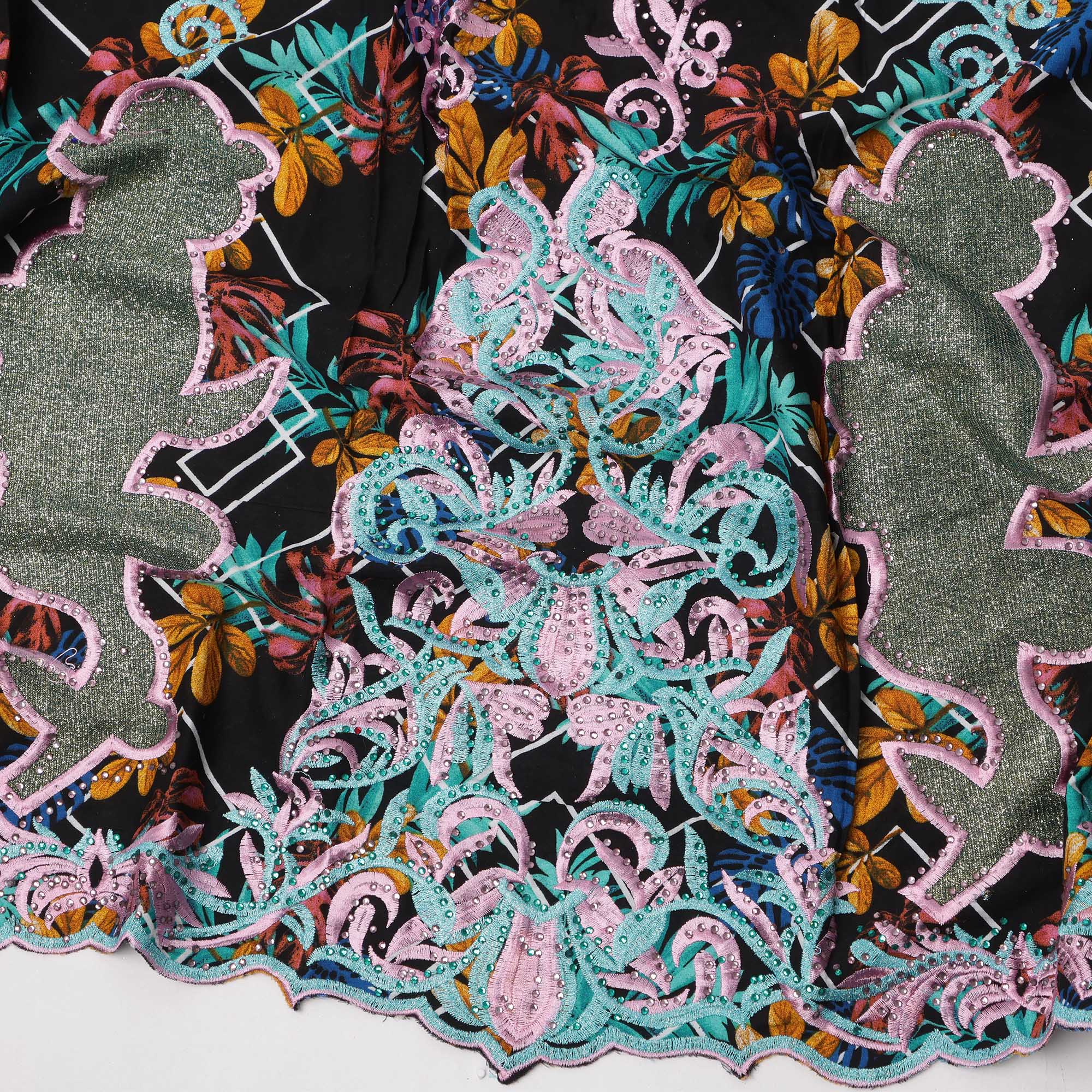 This dynamic black cotton fabric is a bold fusion of nature-inspired print and detailed embroidery, making it an ideal choice... Read more Read more