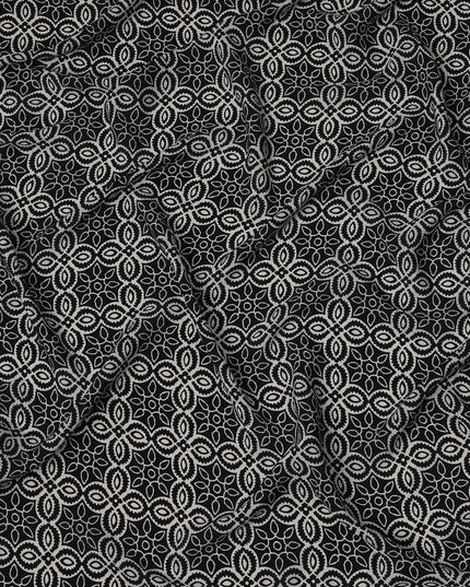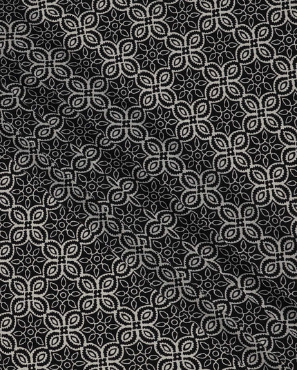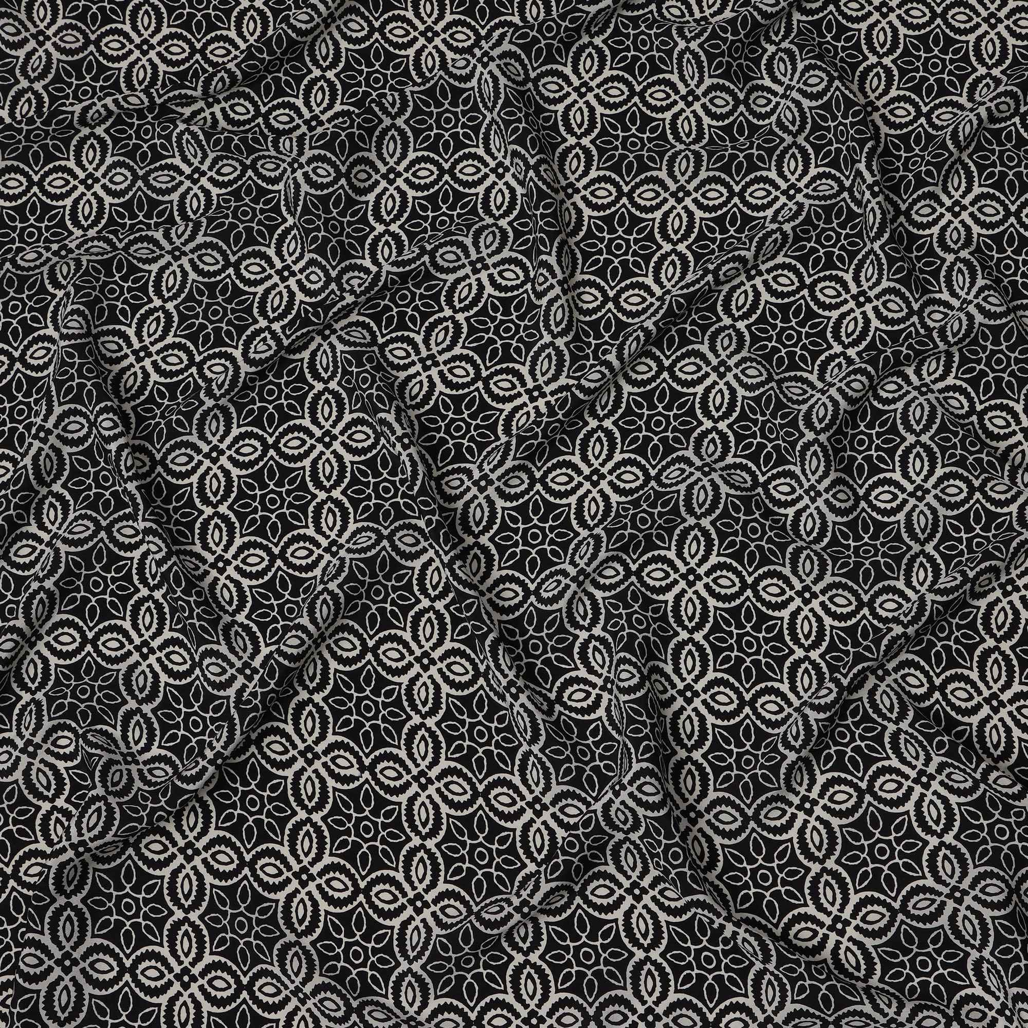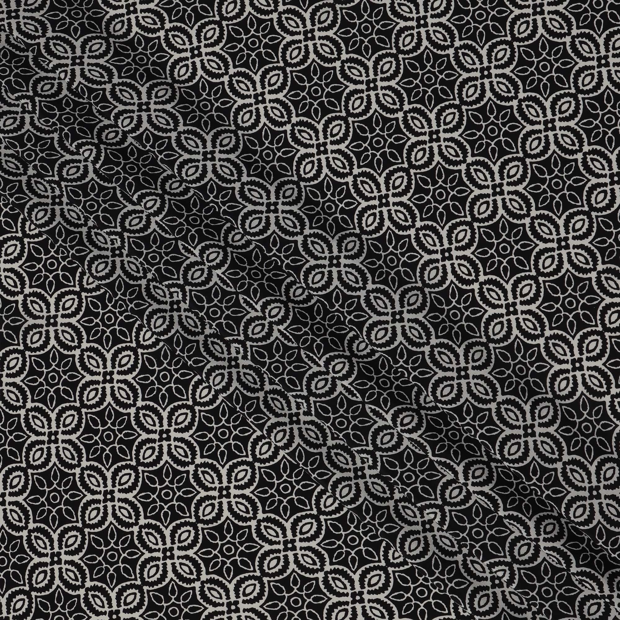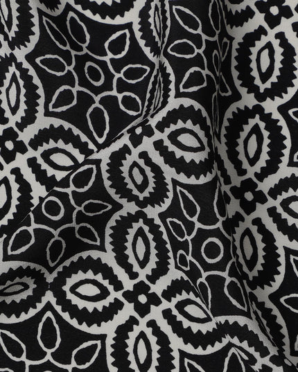 This elegant black base pure silk crepe fabric features a harmonious mandala-inspired print in soft beige and white tones, forming... Read more Read more