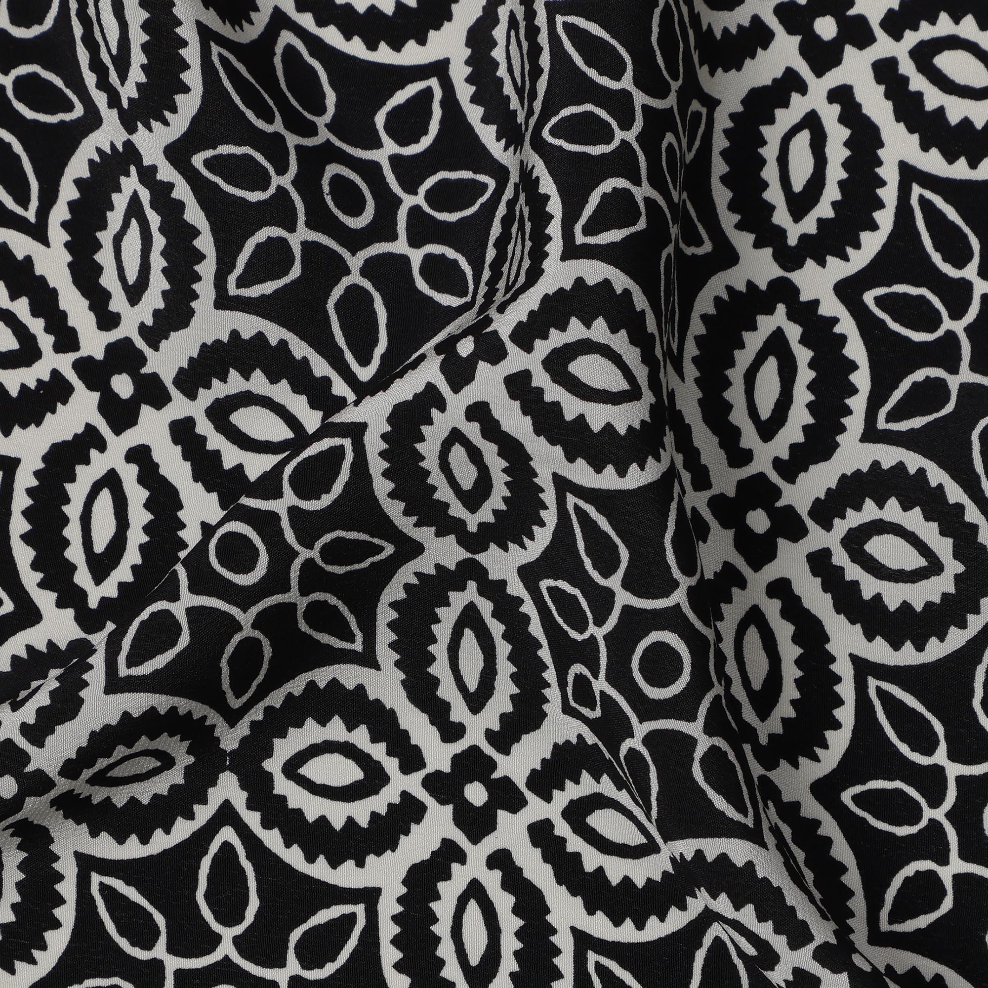 Black Base with Beige and White Ethnic Mandala Print Pure Silk Crepe Fabric, 110 Cms Width, Made in India-D23190