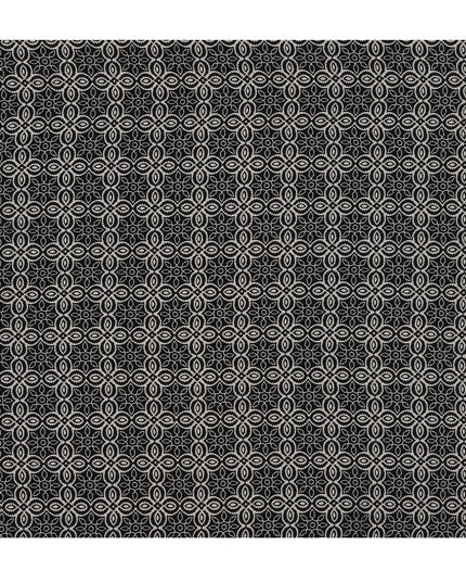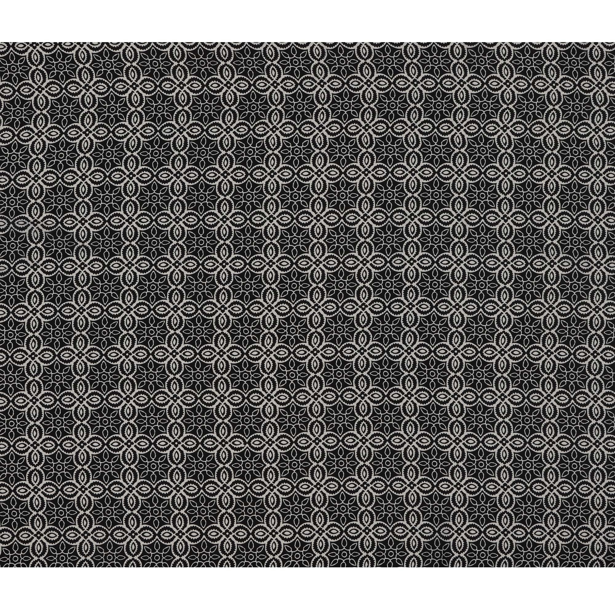 This elegant black base pure silk crepe fabric features a harmonious mandala-inspired print in soft beige and white tones, forming intricate geometric and floral patterns that radiate symmetry and artistic finesse. The circular motifs interlocked with petal and star-like designs offer a traditional yet contemporary appeal, making the fabric perfect for crafting stylish sarees, blouses, and Indo-western ensembles. With a fluid drape and a naturally lustrous finish, the premium silk crepe adds luxury and movement to your creations. The contrast between the deep black background and the light print enhances visual clarity and makes it suitable for both festive and formal wear. Designed and manufactured in India, this 110 cm wide fabric effortlessly blends cultural charm with modern sophistication for versatile high-fashion garments.