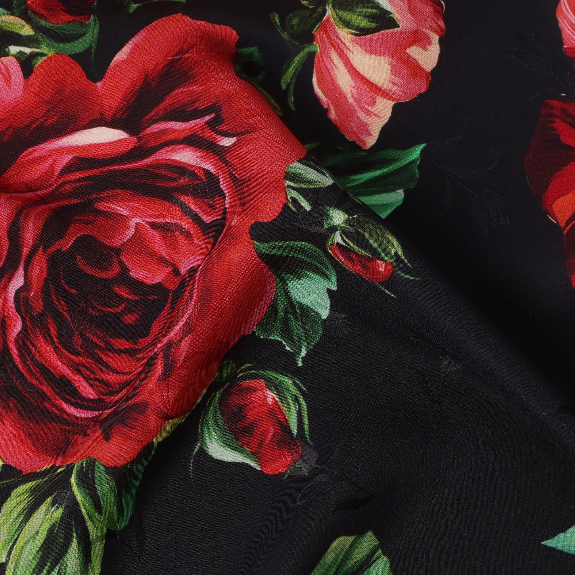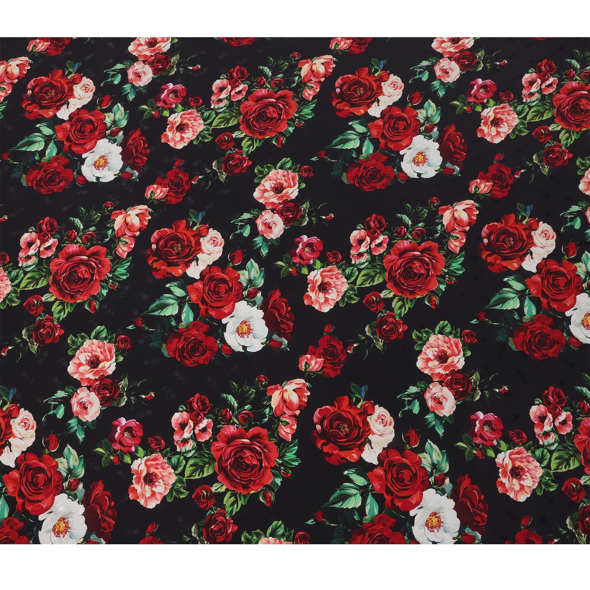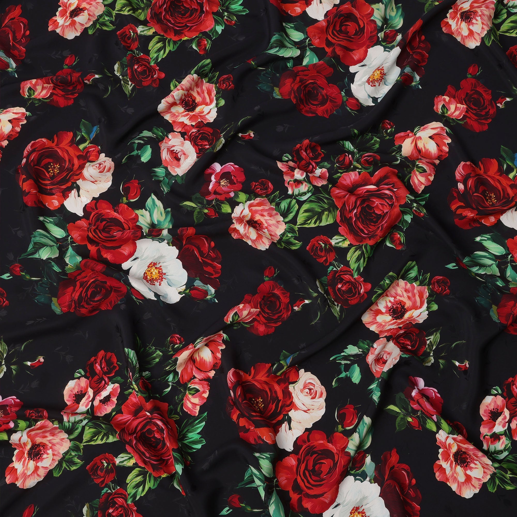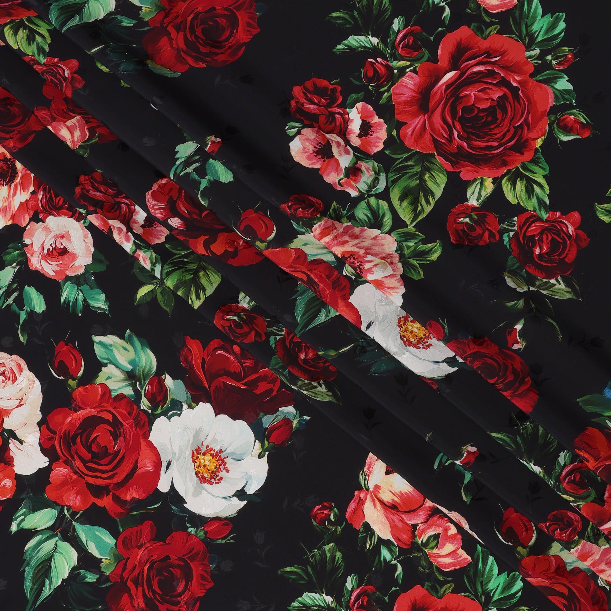 Black Base with Red, Peach & White Rose Floral Print Premium Italian Pure Silk Satin Fabric, 140 Cms Width, Made in Italy-D22984