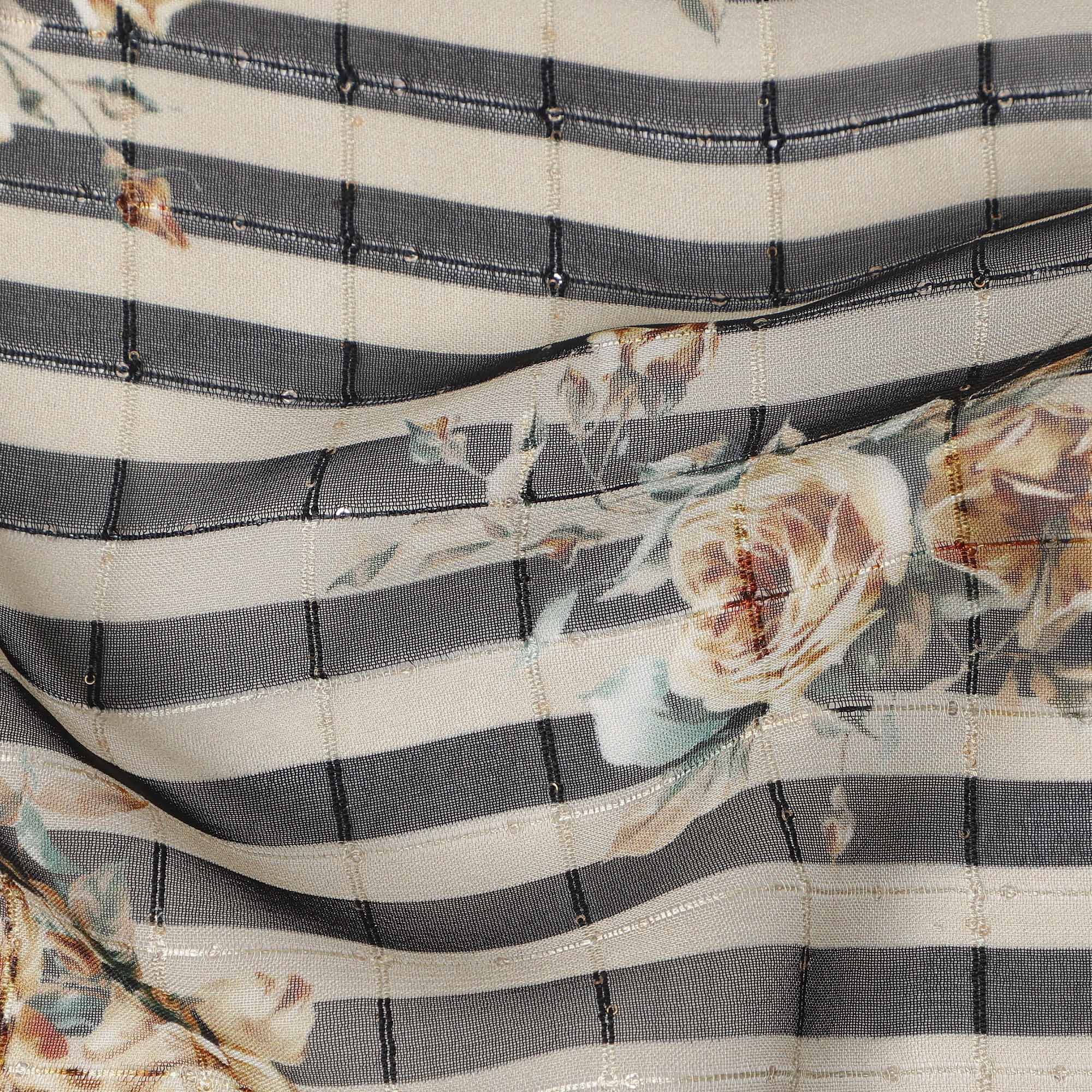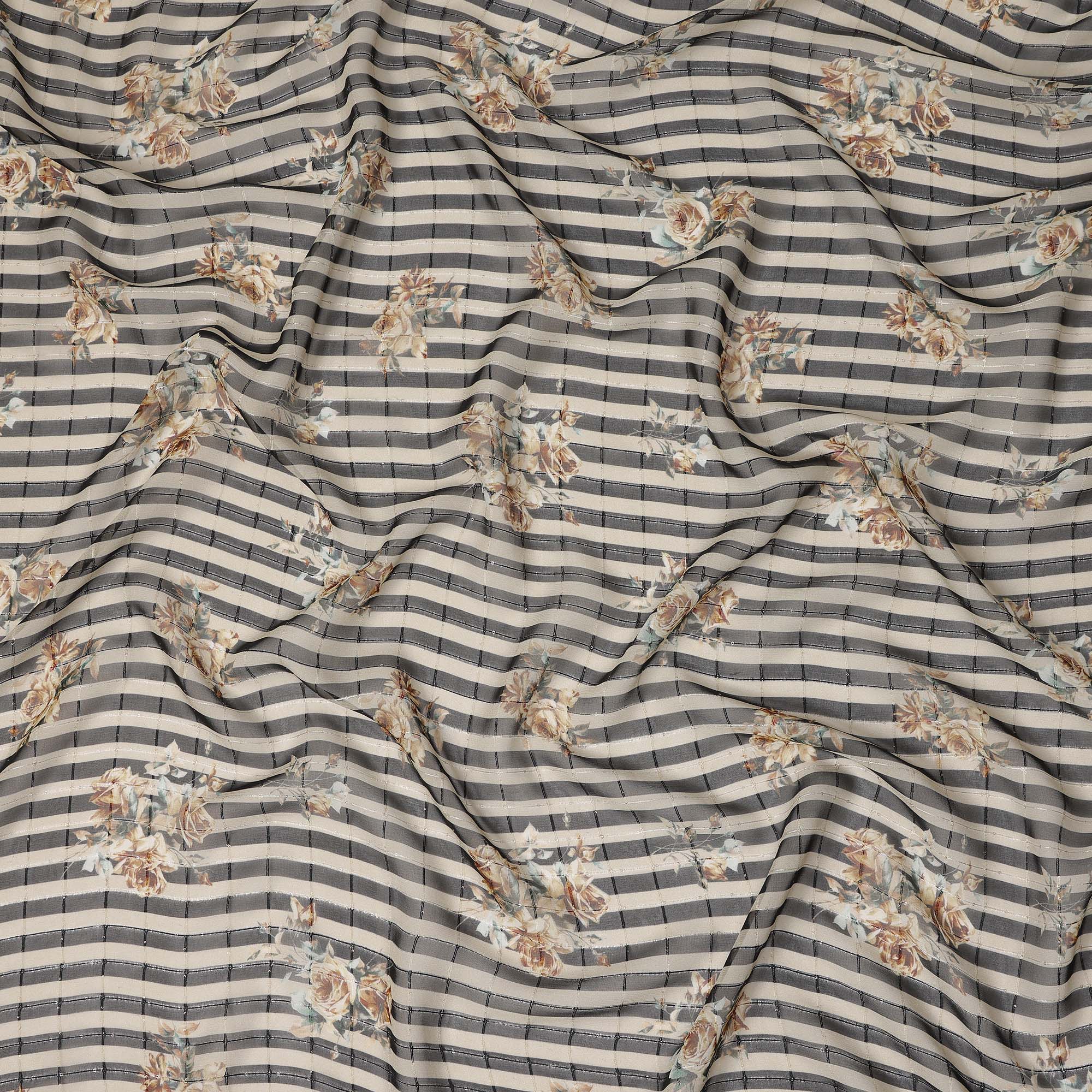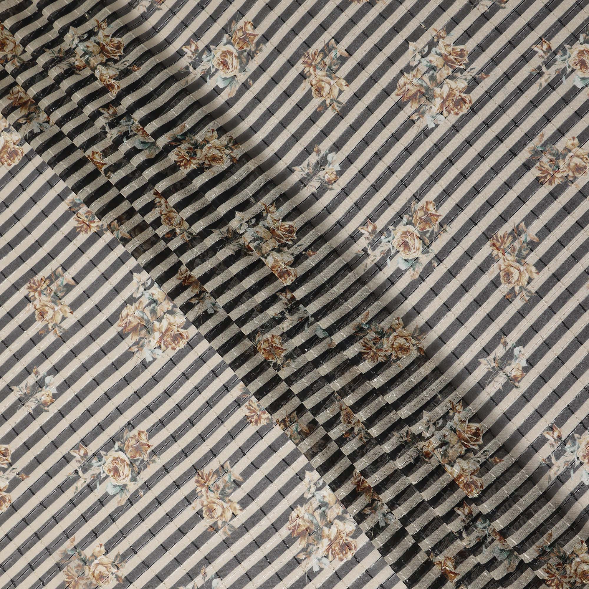 This Black beige striped floral rose print viscose georgette fabric is a lightweight and elegant material designed for stylish garments... Read more Read more