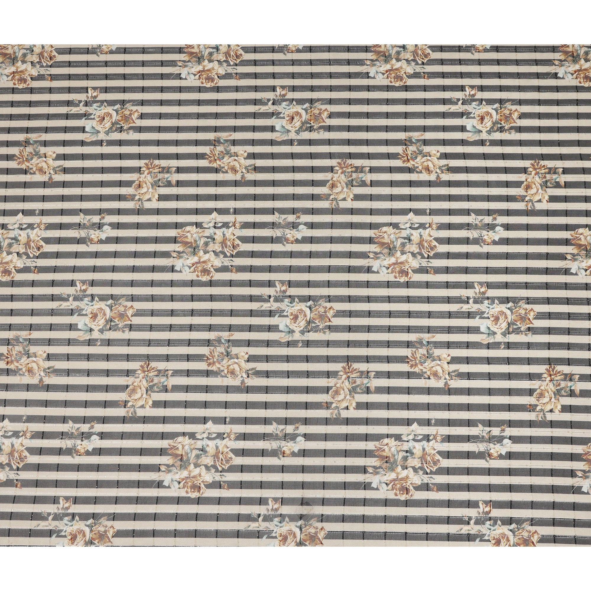This Black beige striped floral rose print viscose georgette fabric is a lightweight and elegant material designed for stylish garments and creative sewing projects. The fabric features a sophisticated combination of horizontal Black and beige stripes beautifully enhanced with delicate floral rose prints that add a soft vintage inspired charm. Crafted from viscose georgette, it offers a breathable texture with a smooth touch and graceful drape that flows naturally with garment designs. This makes it ideal for dresses, blouses, skirts, scarves, and layered fashion pieces that require fluidity and comfort. With a width of 110 cms, the fabric provides versatility for designers, tailors, and sewing enthusiasts working on modern or classic styles. The blend of striped structure and floral detailing creates a unique aesthetic that brings together elegance, softness, and timeless fashion appeal.