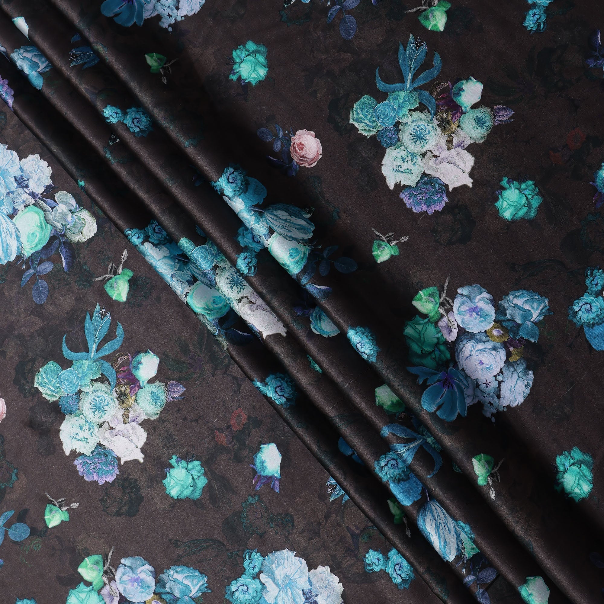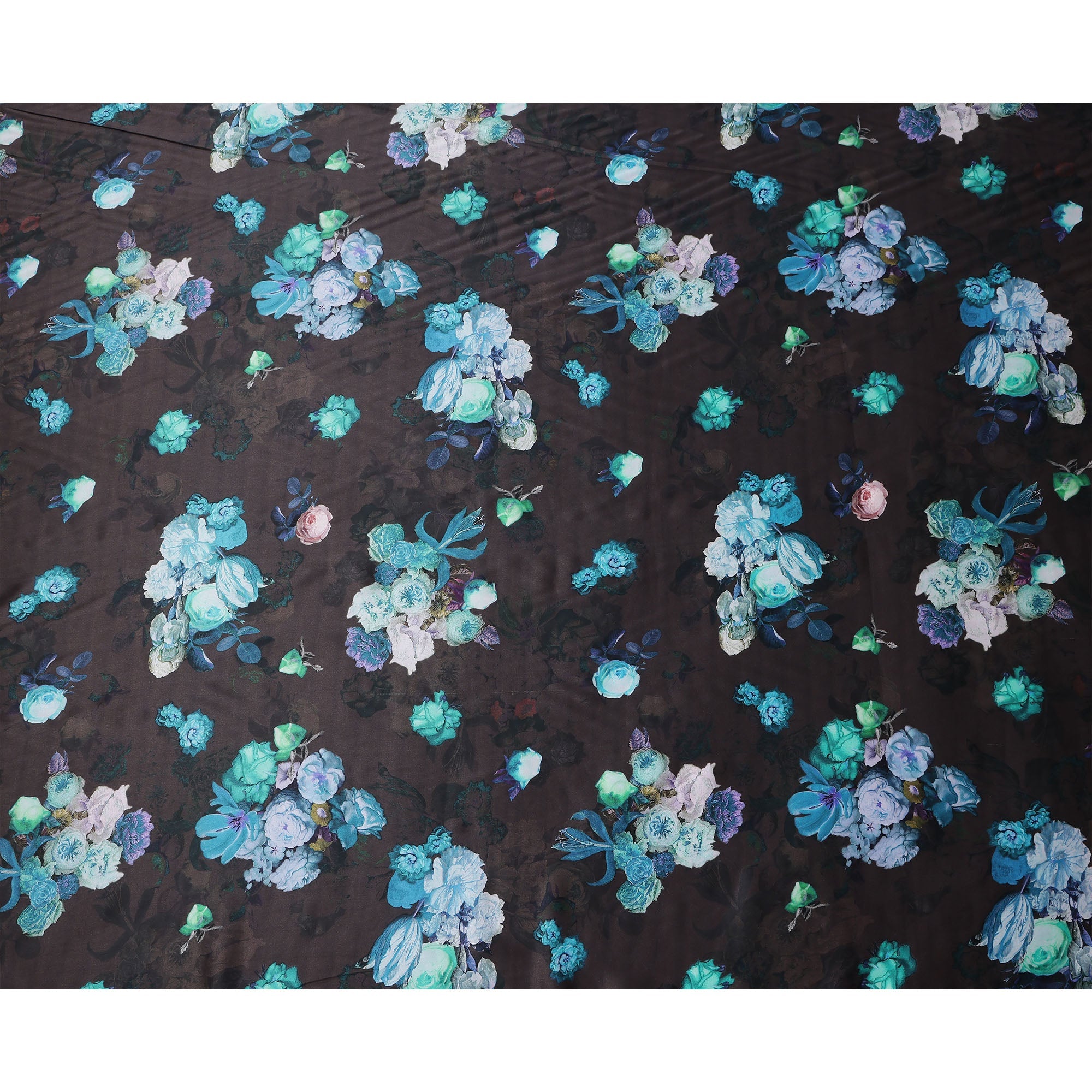 Black Blue Floral Print Synthetic Satin Fabric, 140 Cms Width, India-D25223