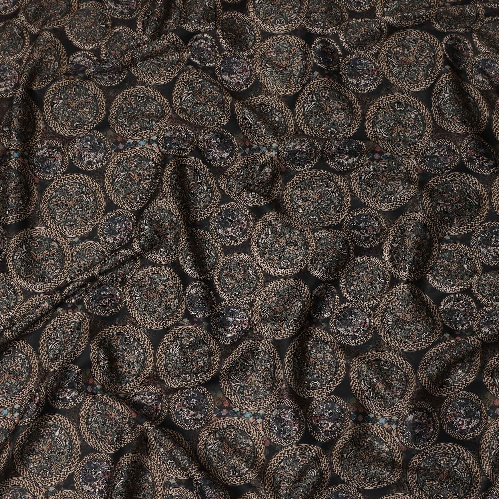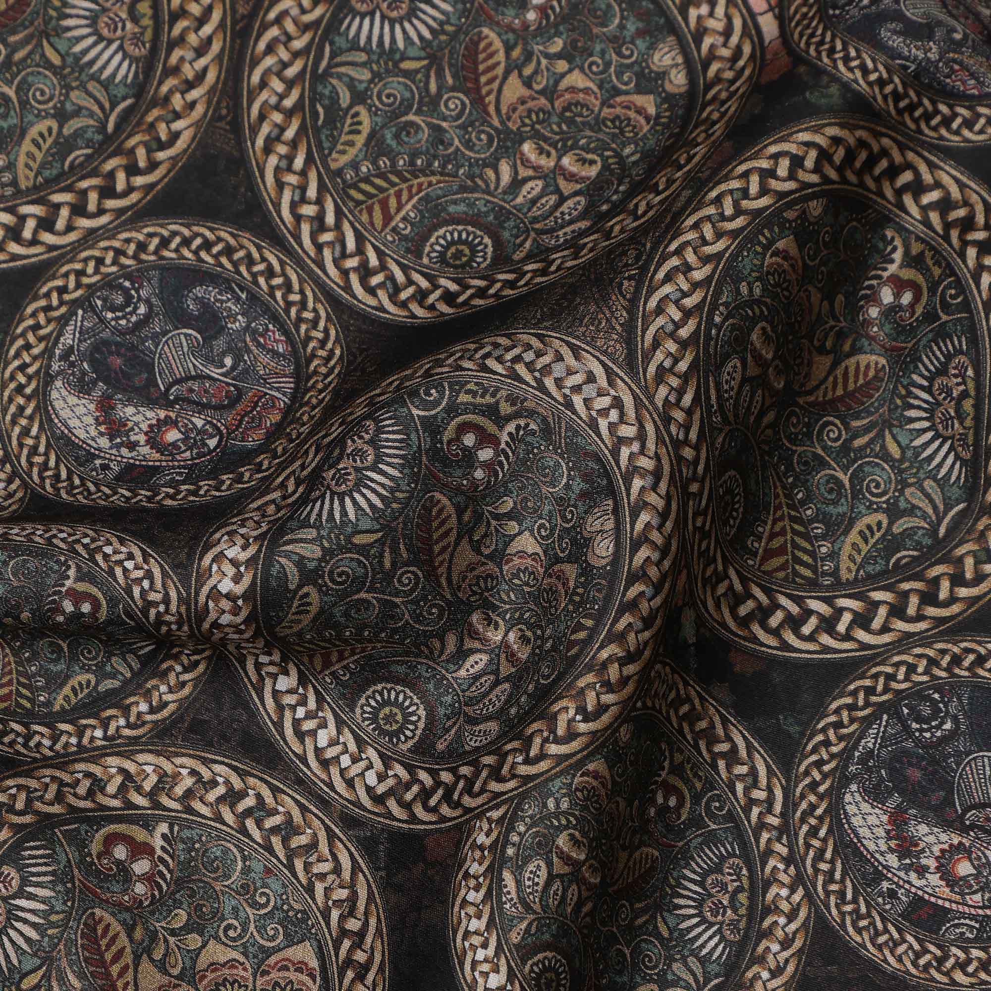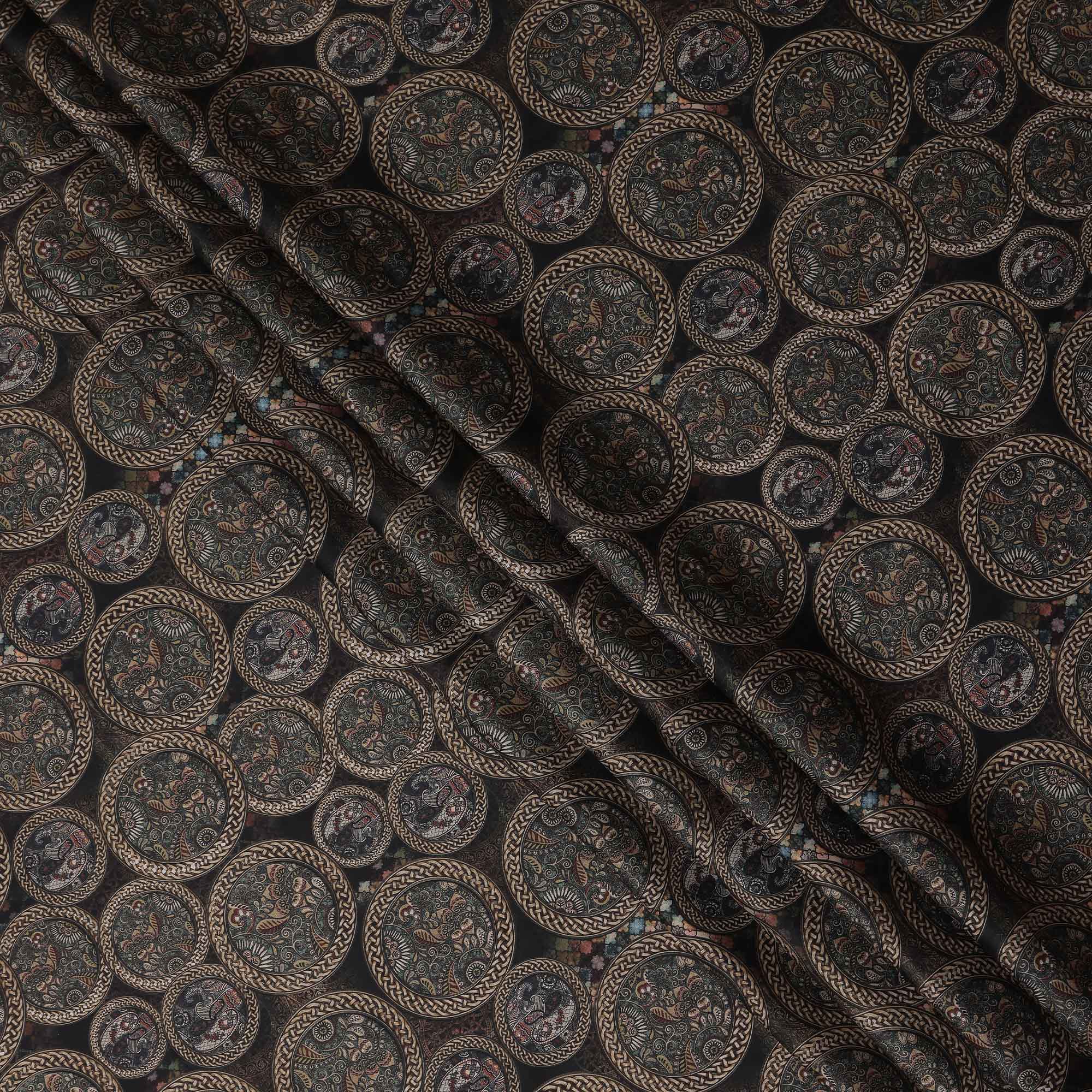 This black brown paisley coin printed cotton satin fabric features a deep black base intricately decorated with circular coin motifs filled with detailed paisley and traditional patterns in rich shades of brown, beige, and muted earthy tones. The ornamental design creates a bold and heritage inspired look, making it ideal for statement garments and refined ethnic wear. Crafted from premium cotton satin, the fabric offers a smooth and silky surface with a soft natural sheen that enhances the depth and intricacy of the print. With a width of 110 cms, it provides versatility for creating dresses, kurtis, tops, skirts, and coordinated ensembles. The breathable cotton composition ensures comfortable all day wear, while the satin weave gives a graceful drape and polished finish, making it a perfect choice for designer garment creations from India.