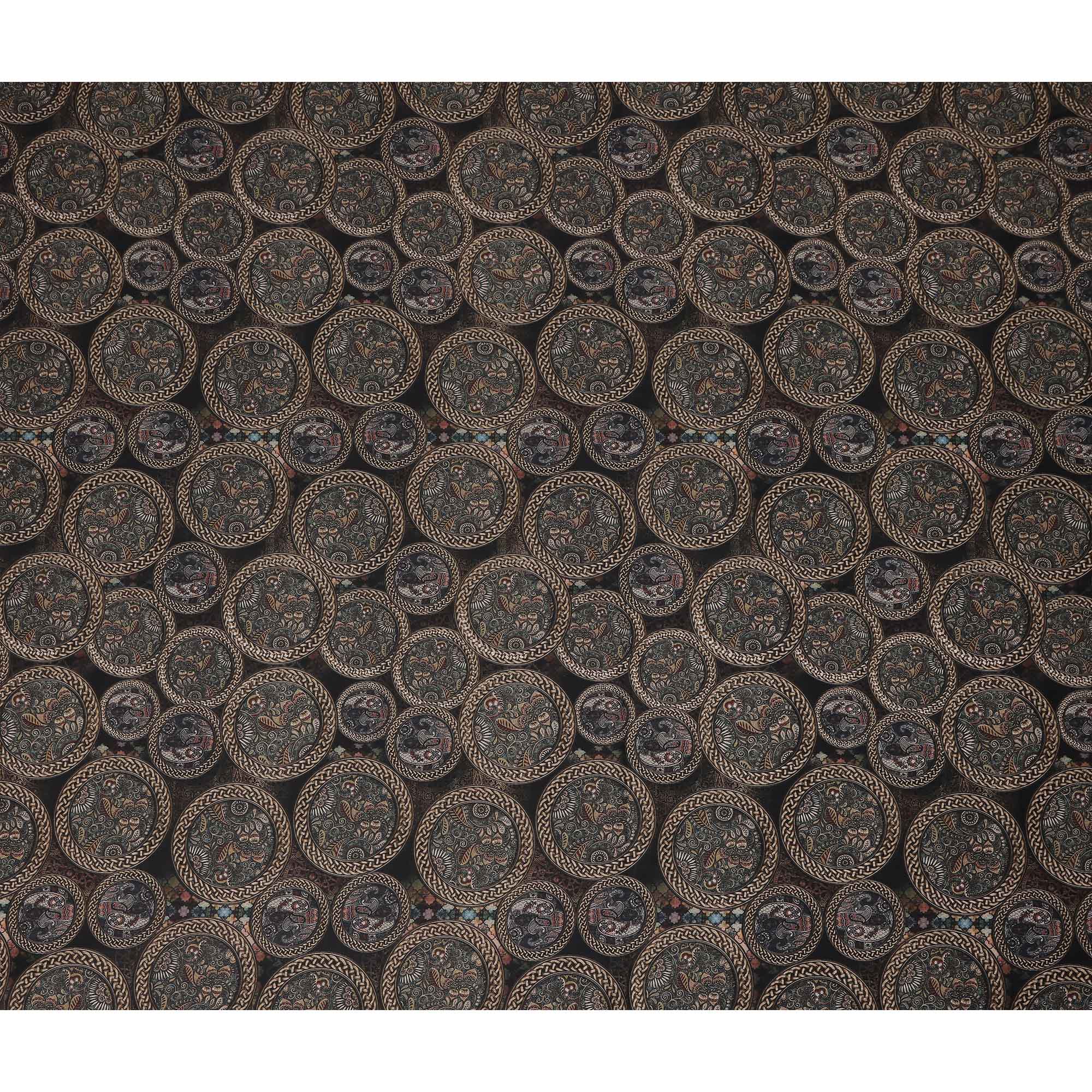 This black brown paisley coin printed cotton satin fabric features a deep black base intricately decorated with circular coin motifs... Read more Read more