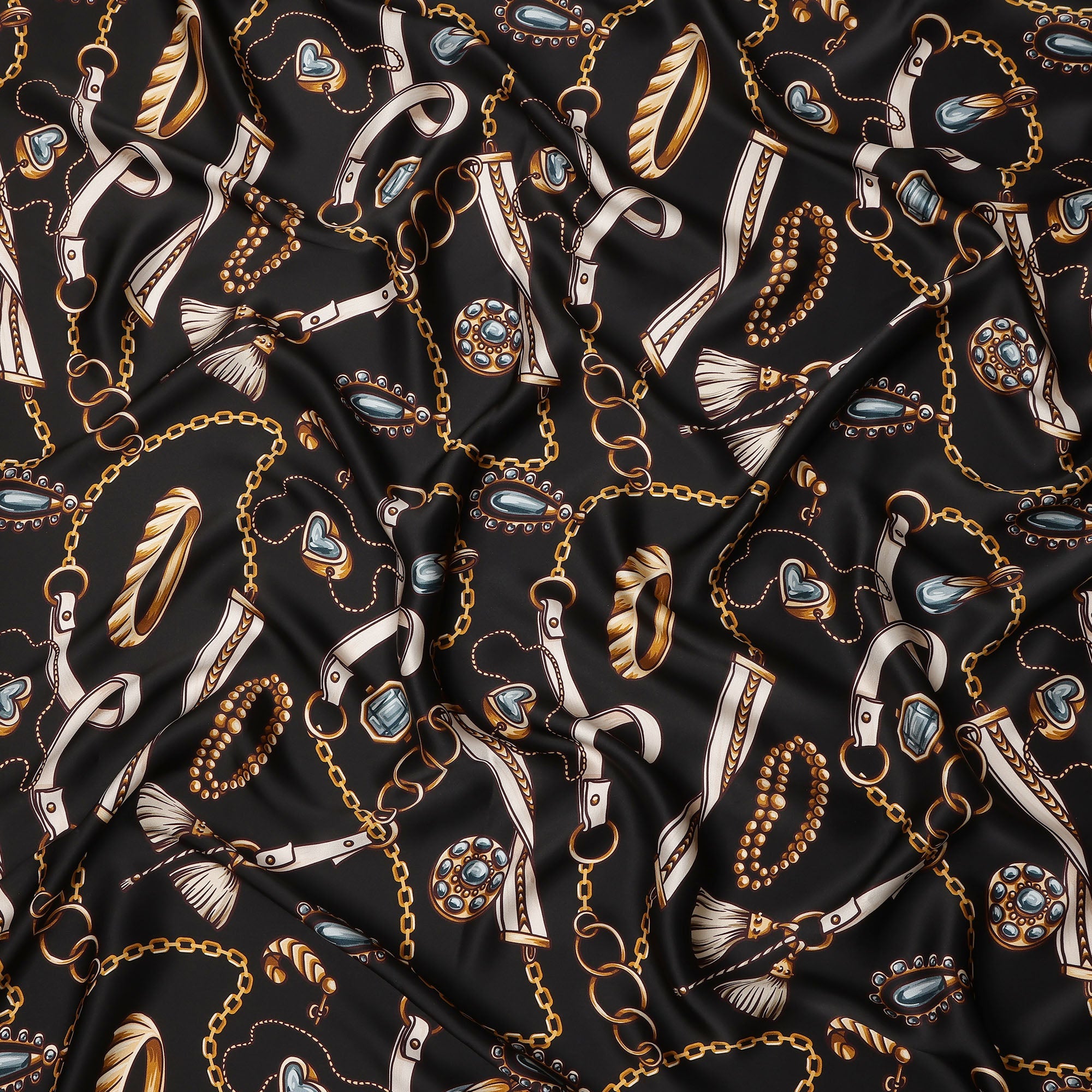 Black Chain Print Premium Pure Silk Satin Fabric Smooth Lustrous Designer Finish 140 Cms Width, 3.5 Mtrs Piece and Made in Italy-D27202