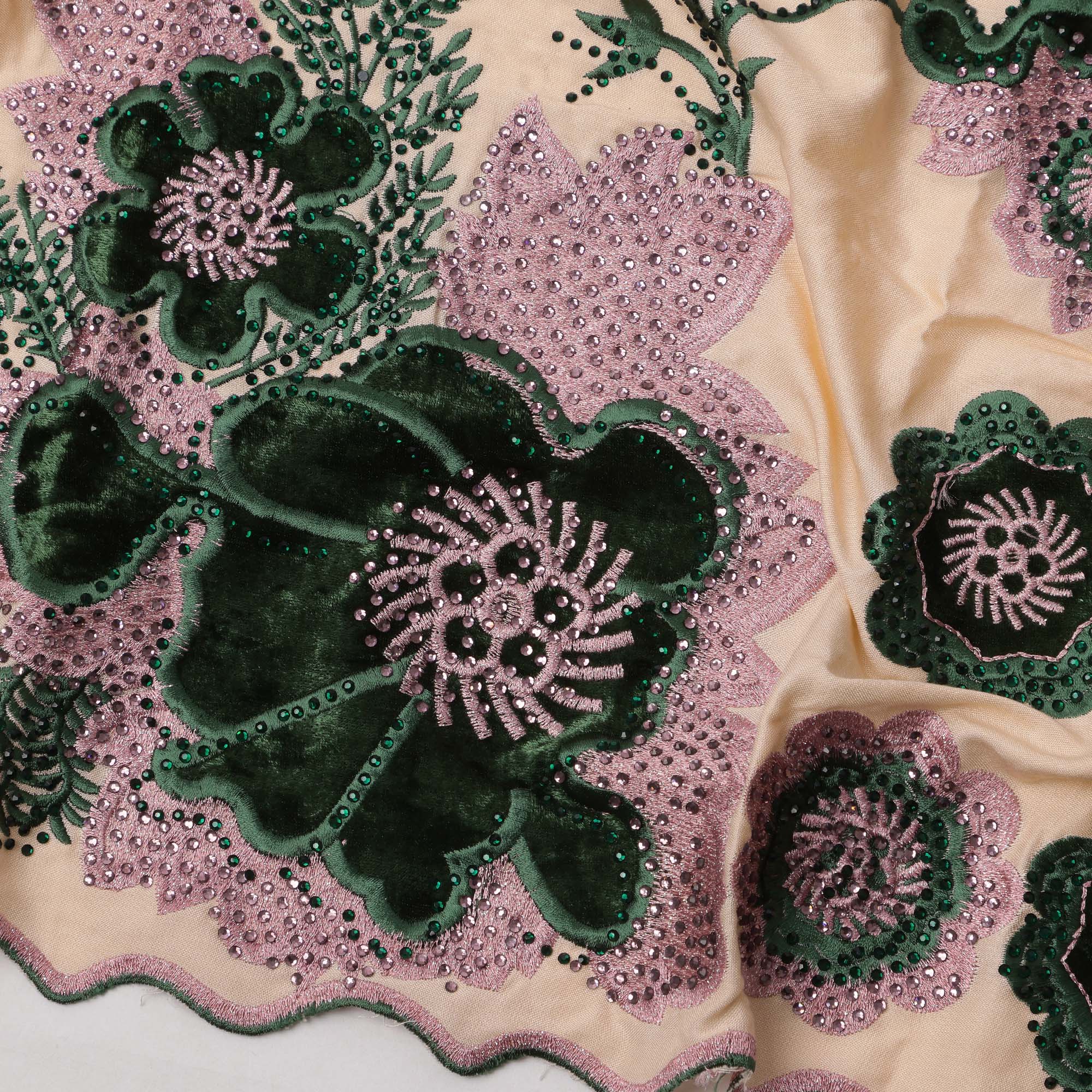 Intricate embroidery in golden and silver threads for a luxurious finish.
