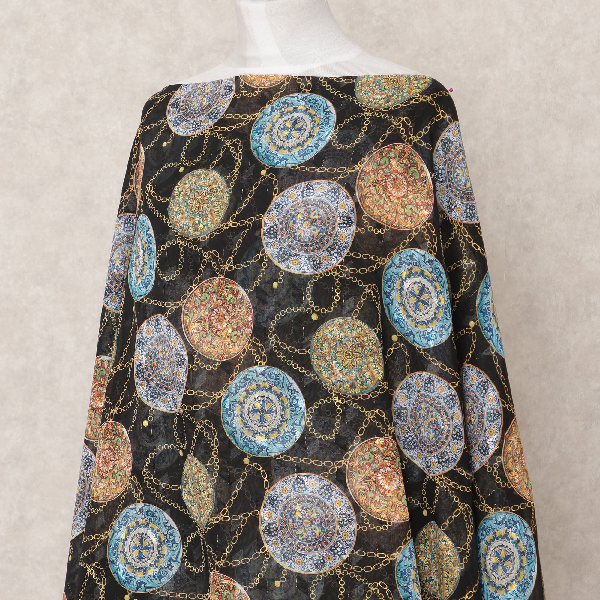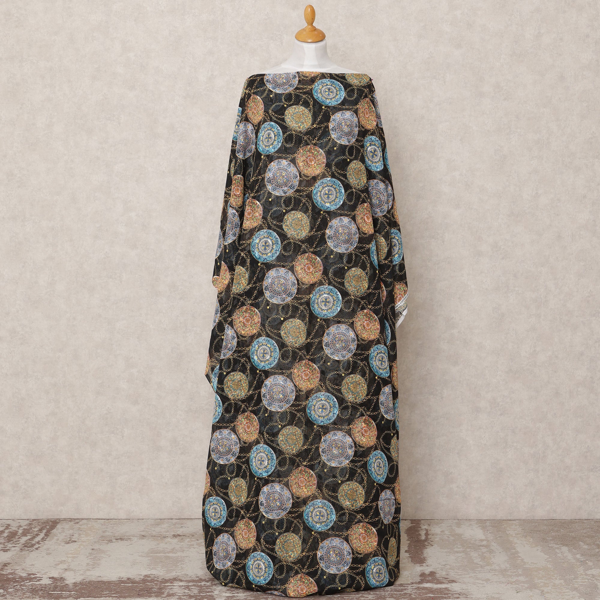 Bold black base with multicolor embroidered ethnic round motifs