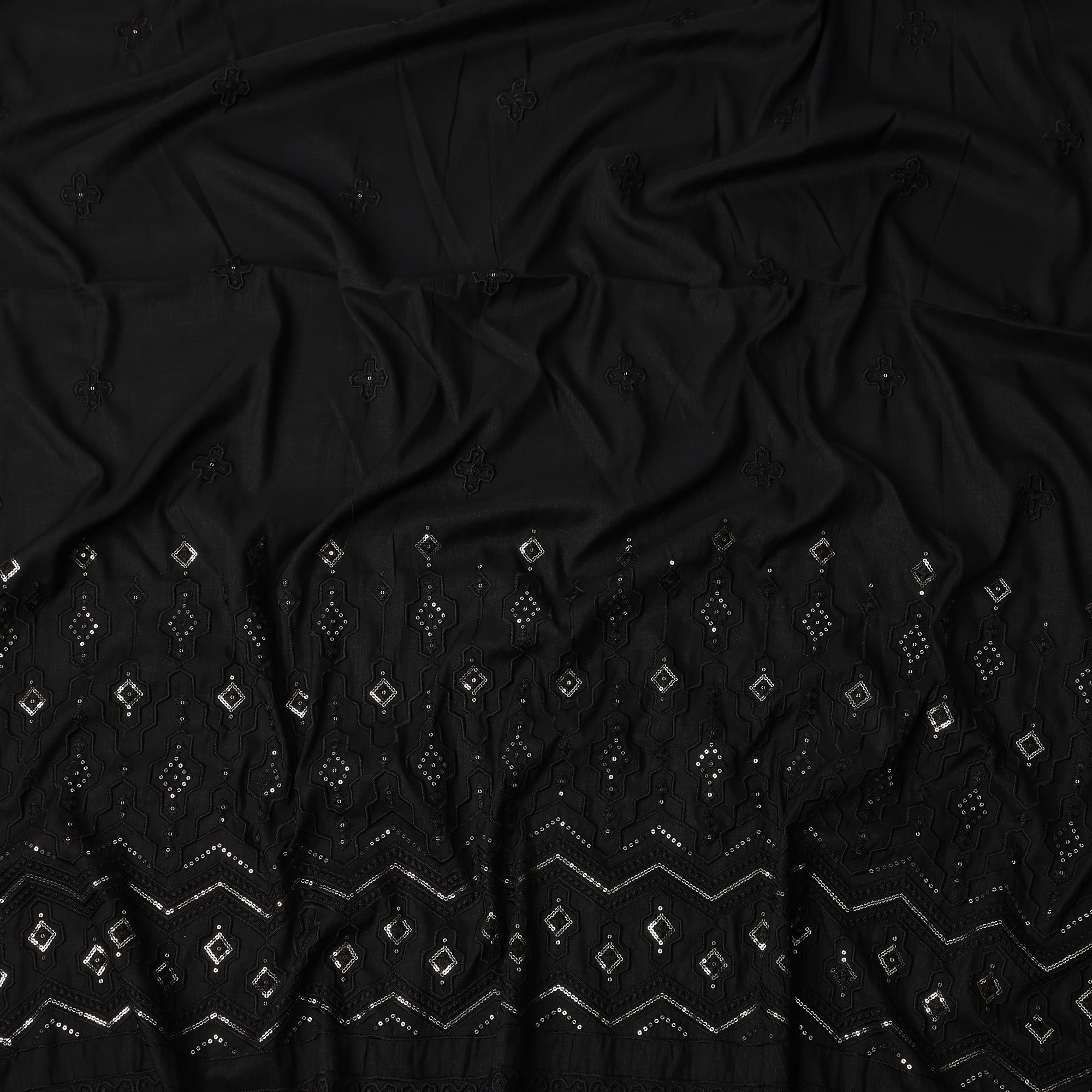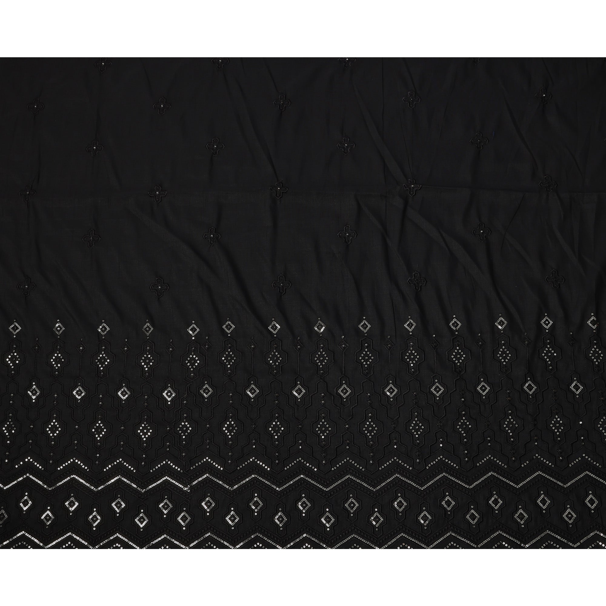 Black Embroidered with Mirror Work Border Synthetic Cotton Fabric, 140 Cms, India-D25390