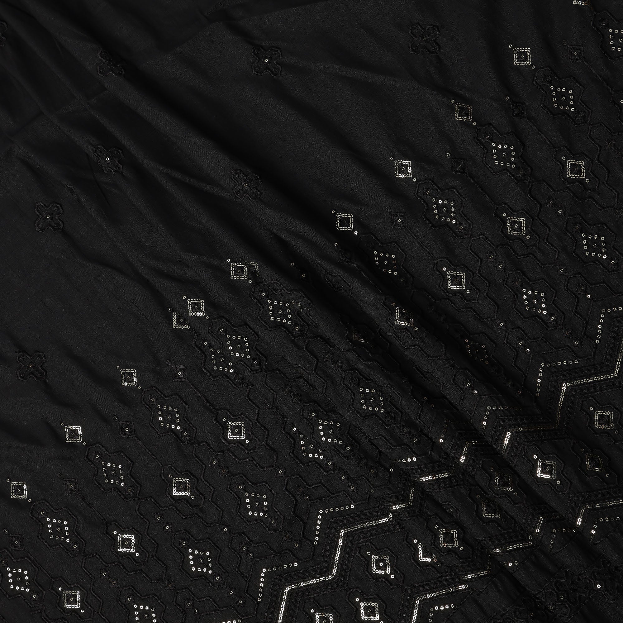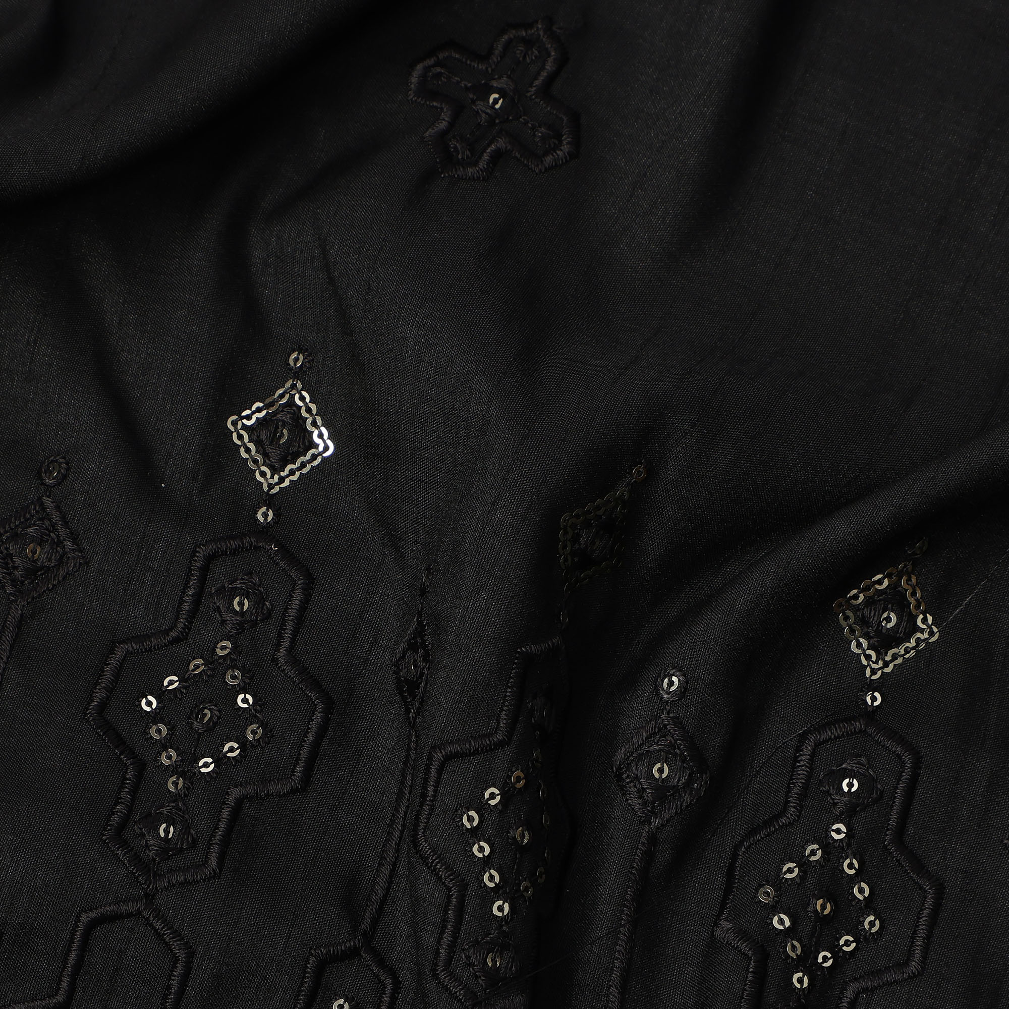 This black embroidered with mirror work border Synthetic Cotton fabric is an elegant and versatile choice for festive and evening wear. The deep black base is delicately enhanced with embroidered motifs scattered across the fabric, while the intricate border is richly decorated with mirror work and detailed embroidery, adding a subtle shimmer that elevates its luxurious appeal. Crafted from a high-quality cotton blend, this fabric ensures softness, breathability, and durability, offering comfort without compromising style. With its 140 cms width, it allows tailoring flexibility for slim-fit, regular, or contemporary shirt designs. The mirror work and embroidery together create a festive elegance, making it perfect for celebrations, weddings, and special gatherings. Proudly made in India, this fabric reflects expert craftsmanship and fine detailing. Easy to maintain, it retains its structure, embellishments, and finish even after multiple uses, ensuring it remains a timeless and fashionable addition to your wardrobe.