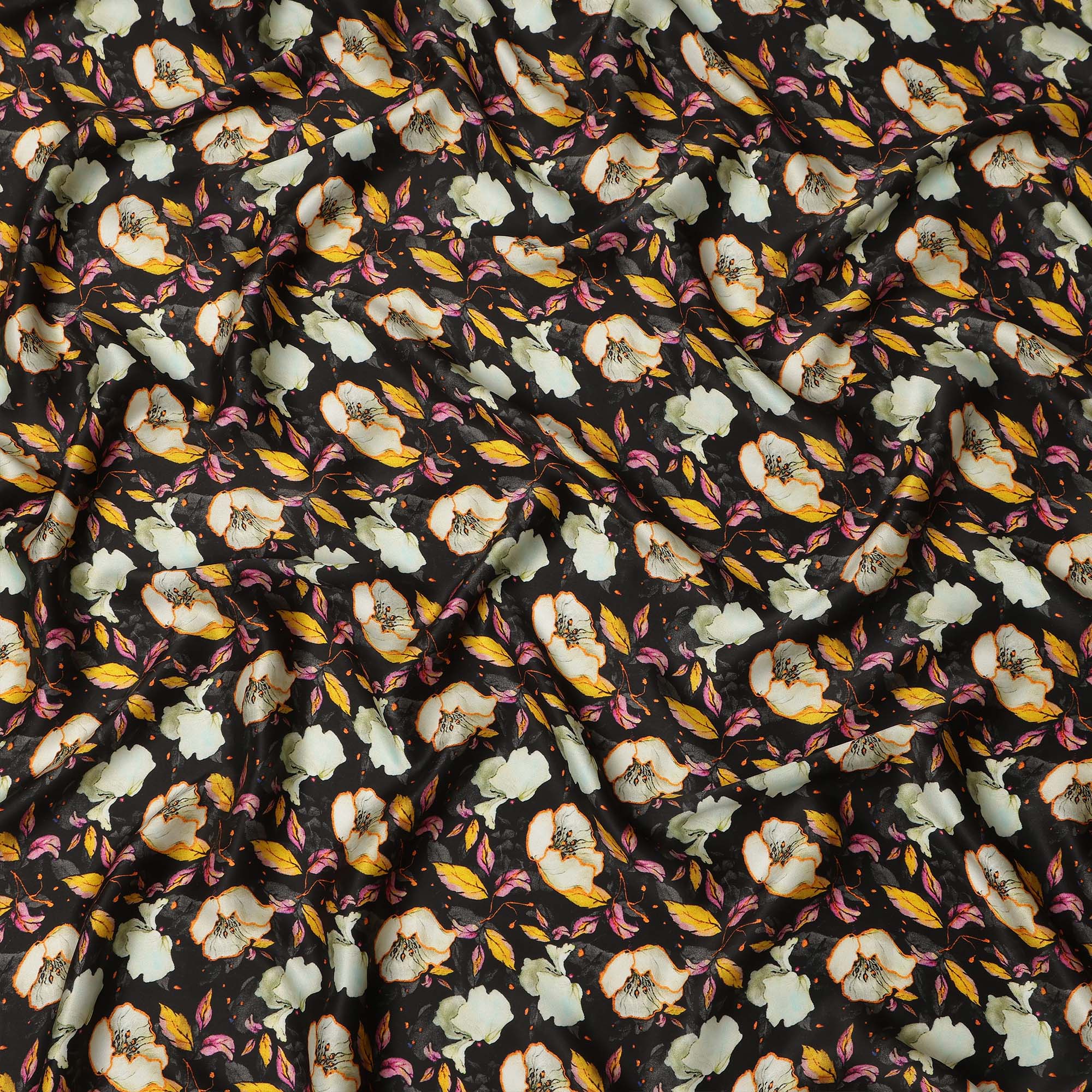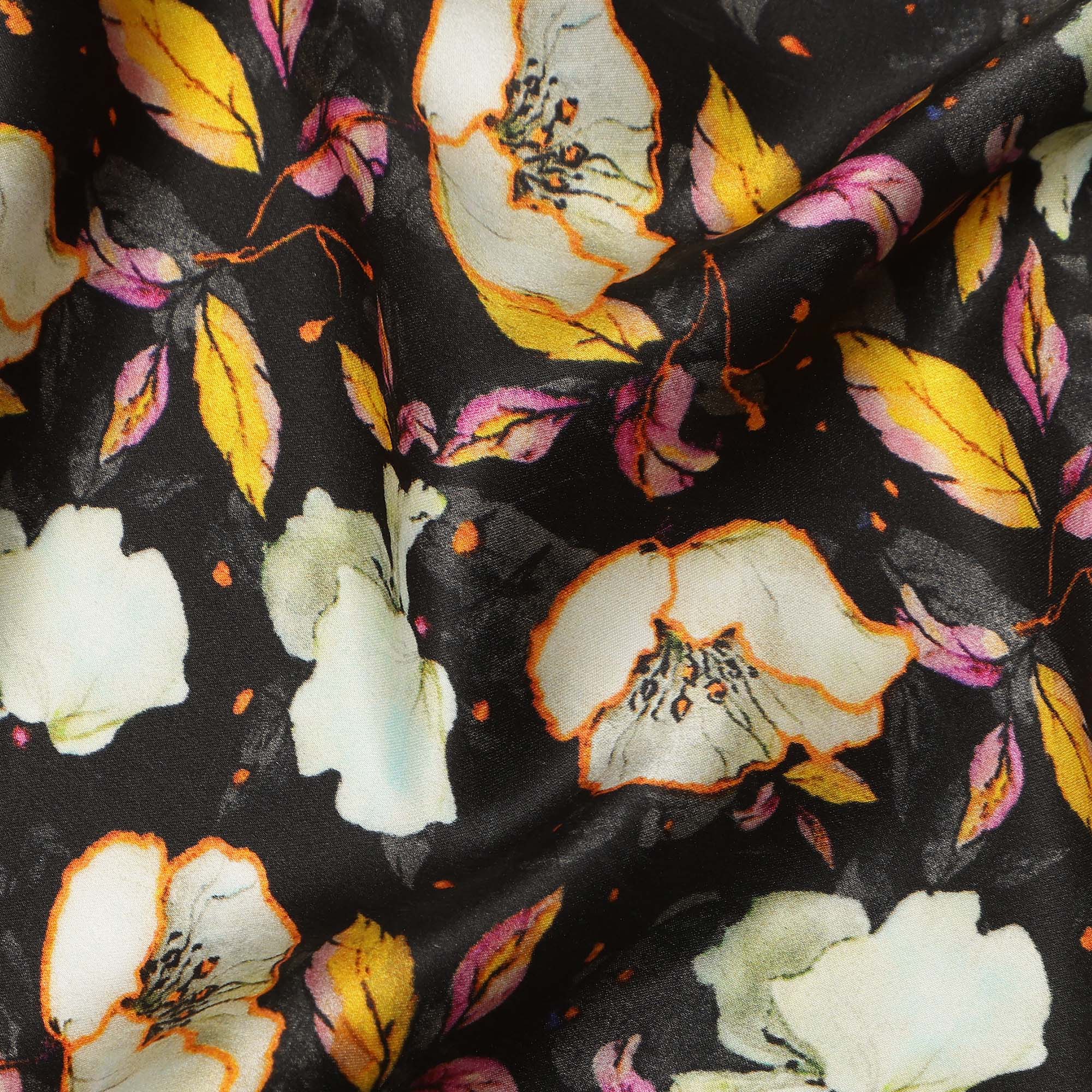 Black Floral Allover Printed Premium Pure Silk Satin Fabric, 110 Cms, India-D27075