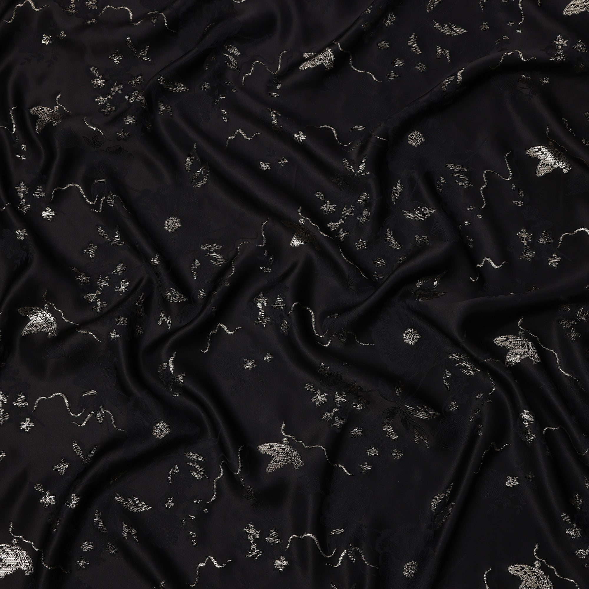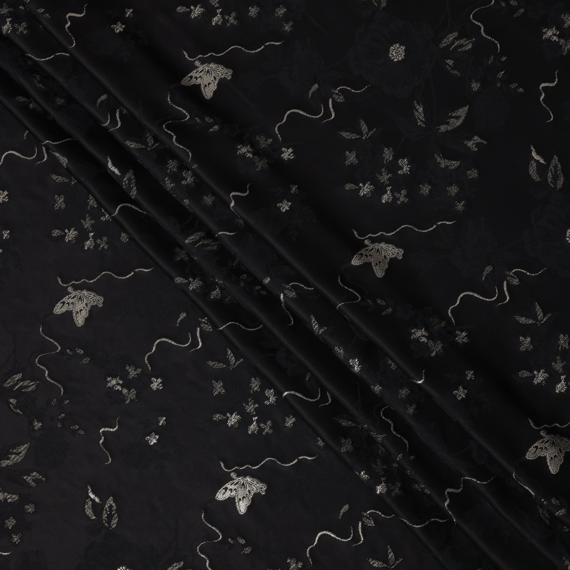Black Floral and Butterfly Pattern Silk Satin Fabric 110 Cms Width India-D24988