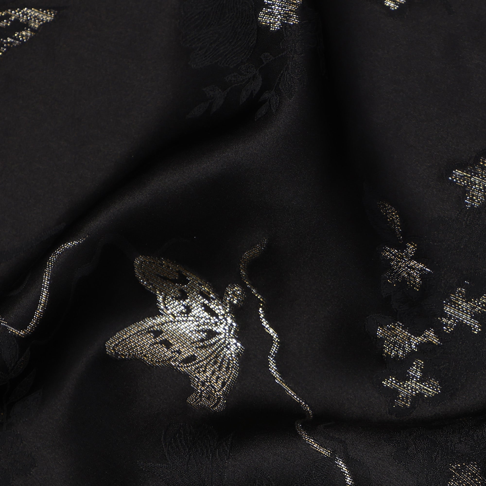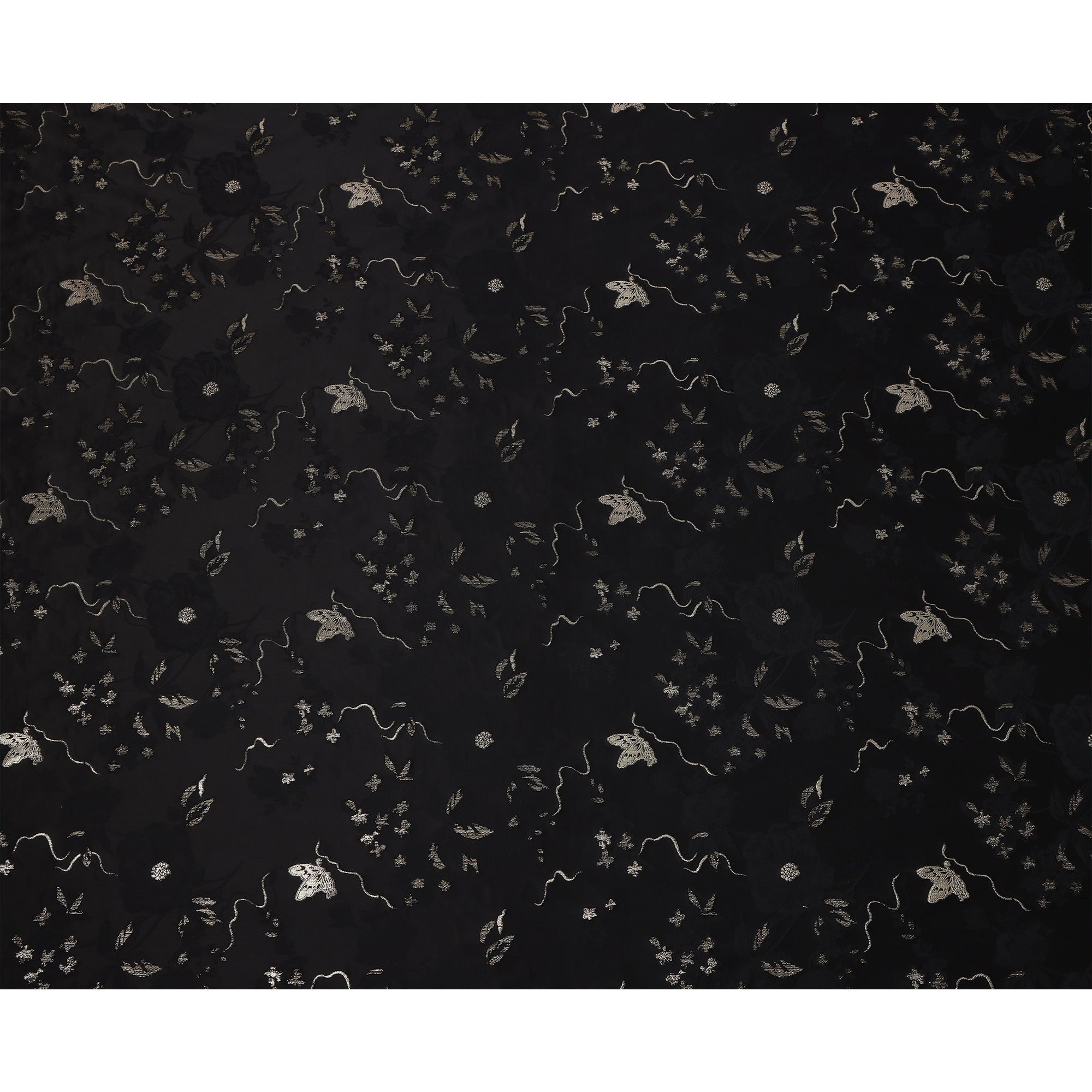 This Black Floral and Butterfly Pattern Silk Satin Fabric from India is the epitome of elegance and luxury, crafted to bring timeless sophistication to your wardrobe. The deep black base is beautifully enhanced with delicate floral and butterfly motifs, woven with finesse to add subtle texture and refinement. Made from premium silk satin, the fabric features a lustrous finish and smooth, soft touch, offering both comfort and high-end appeal. Its lightweight yet durable composition provides an exquisite drape, making it ideal for evening gowns, sarees, blouses, and formal wear that require a graceful silhouette. With a width of 110 cms, it offers ample scope for versatile tailoring and creative styling. Renowned for its precision weaving, Indian craftsmanship ensures long-lasting durability and superior quality. This fabric is perfect for festive occasions, elegant soirées, or designer ensembles where style meets tradition. To preserve its sheen and intricate woven design, dry cleaning is recommended, ensuring it retains its beauty for years.