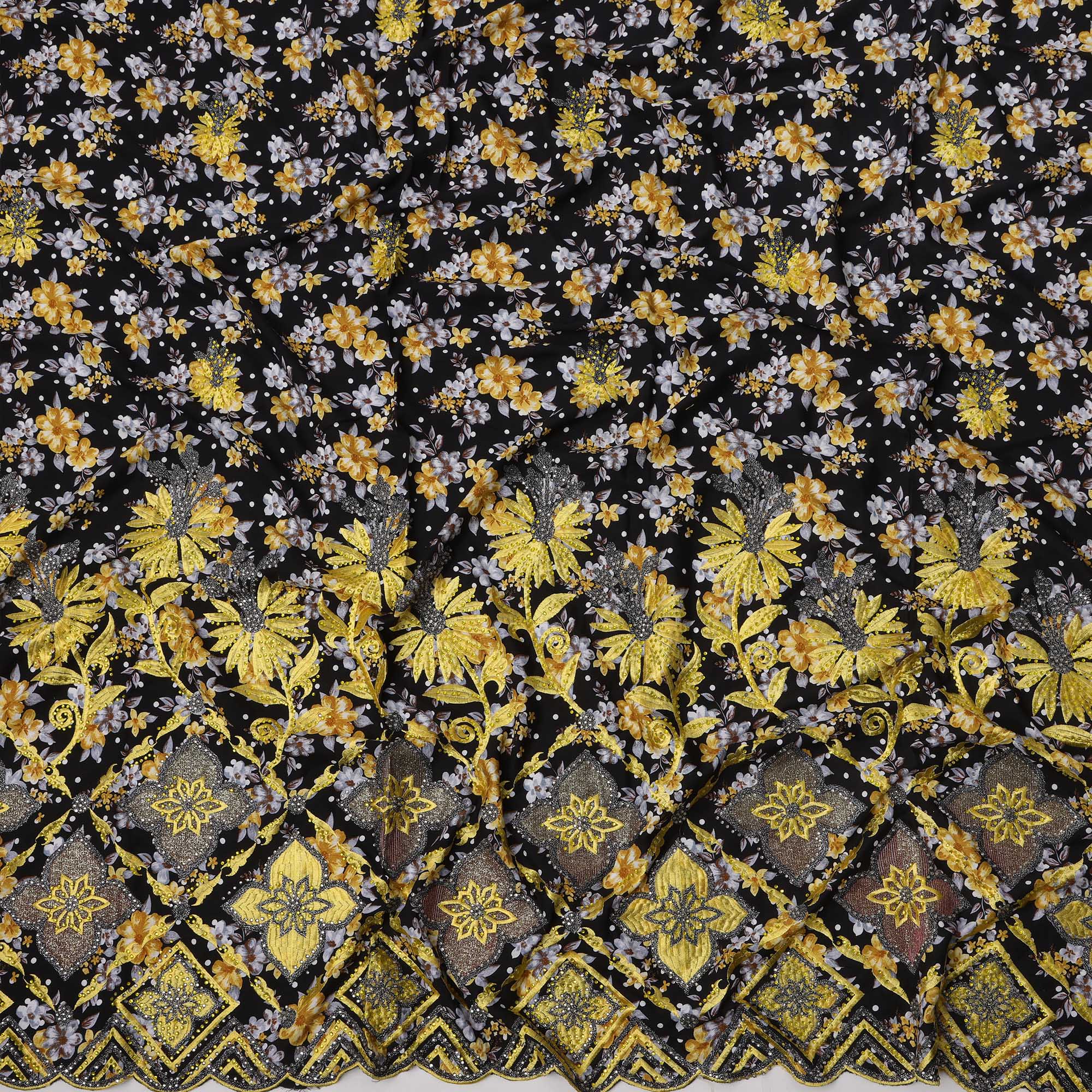 Black base cotton fabric enriched with vibrant yellow floral print.
