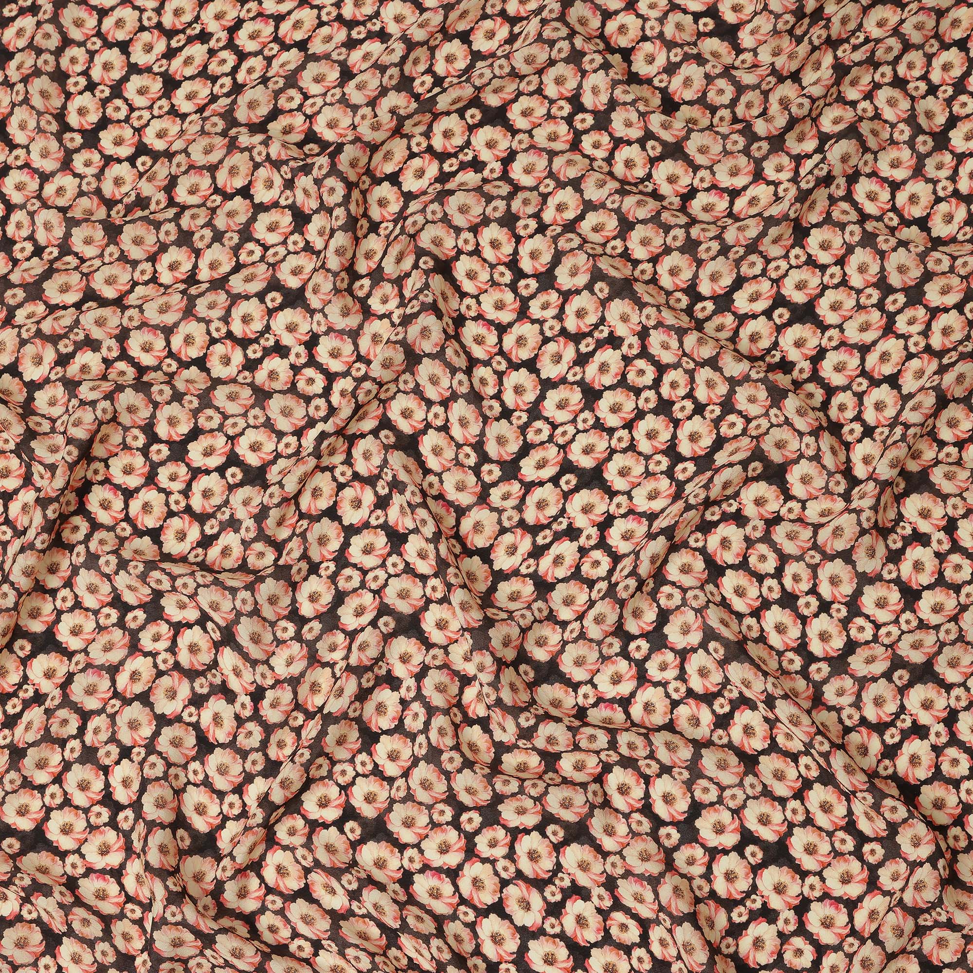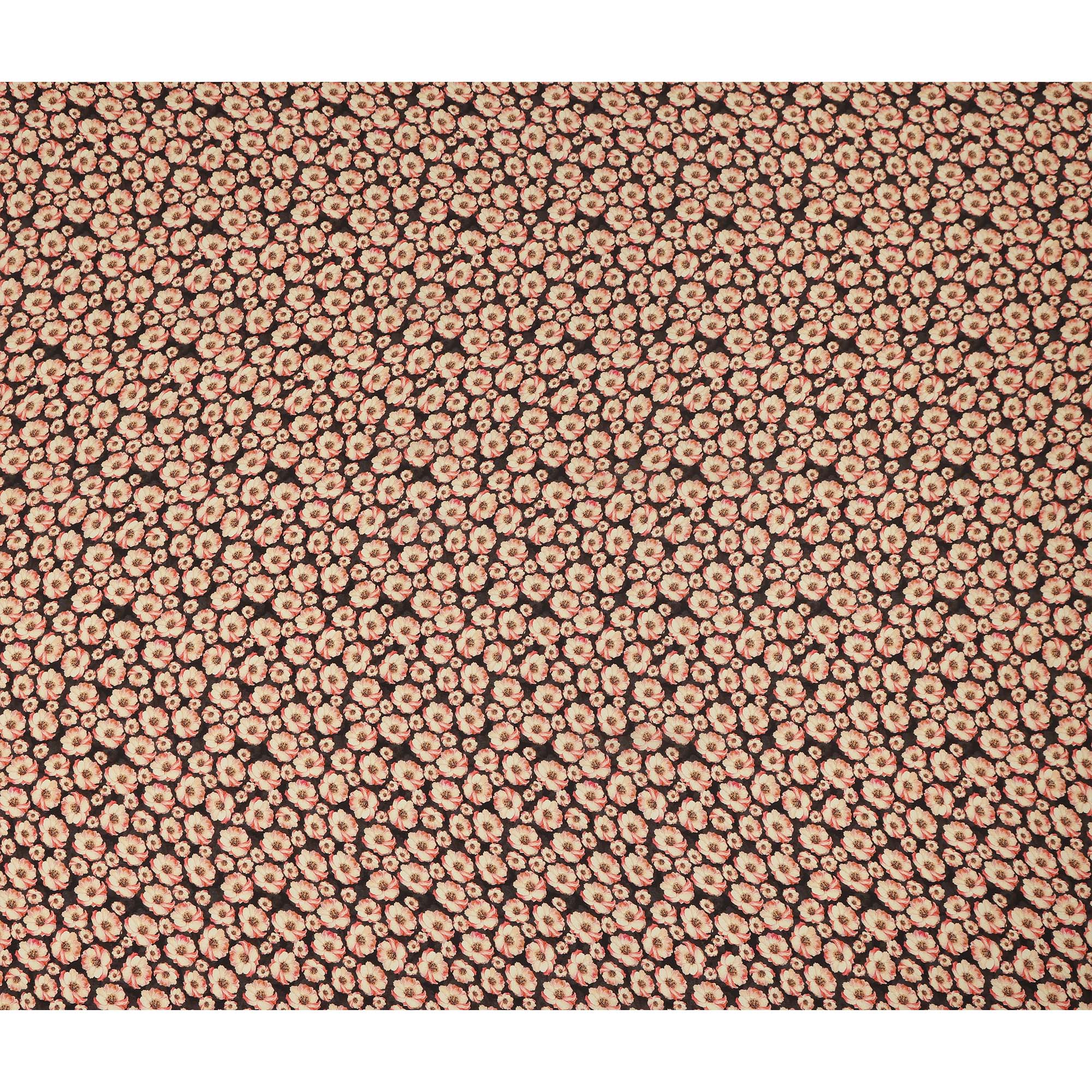 This black floral printed silk crepe fabric features a charming beige blossom garden design with soft peach and subtle earthy... Read more Read more