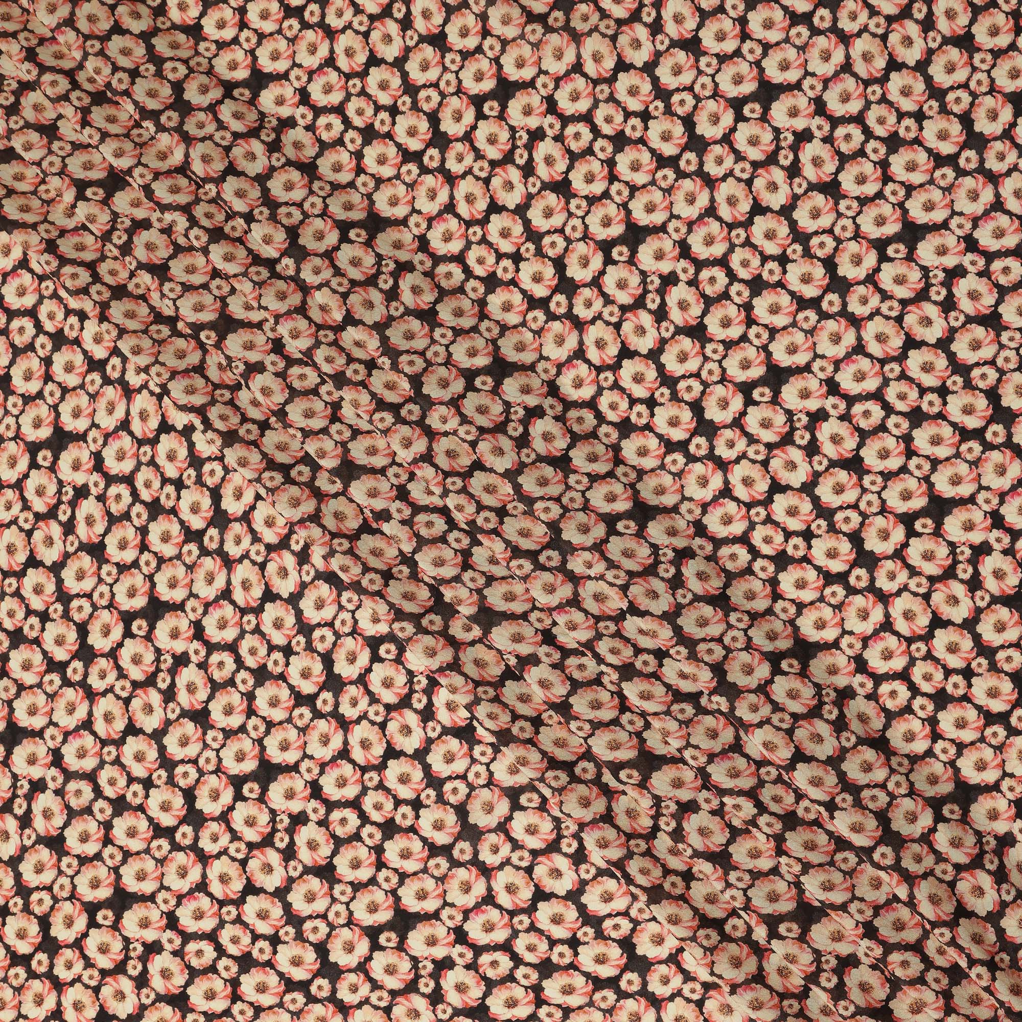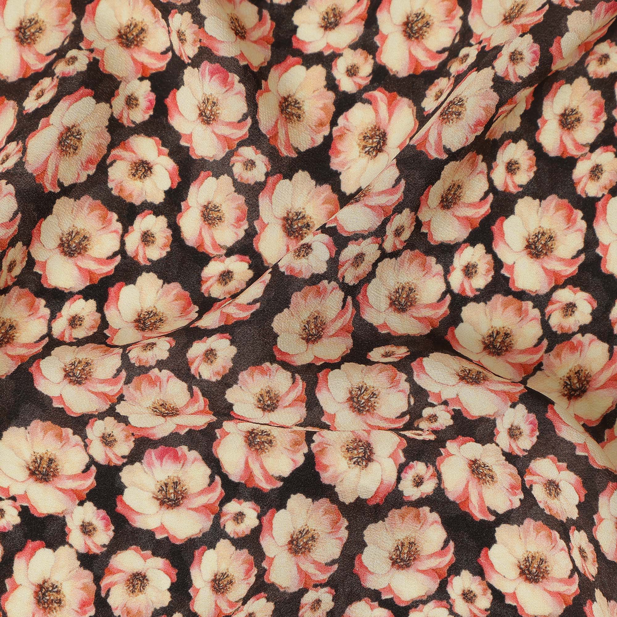 Black Floral Printed Premium Pure Silk Crepe Fabric Beige Blossom Garden Design Soft Lightweight Dress Material 110 Cms Width India-D28003
