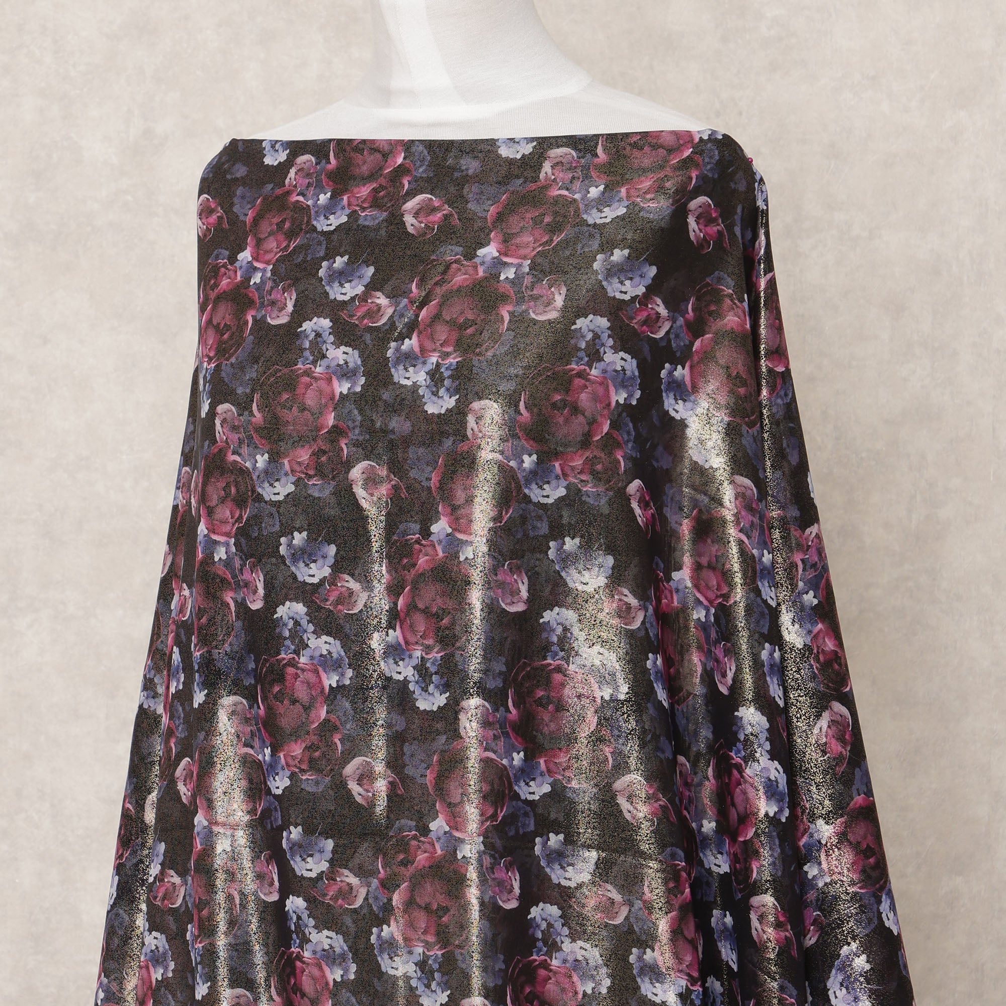 Deep black base with rich floral prints in wine, blue, and lilac