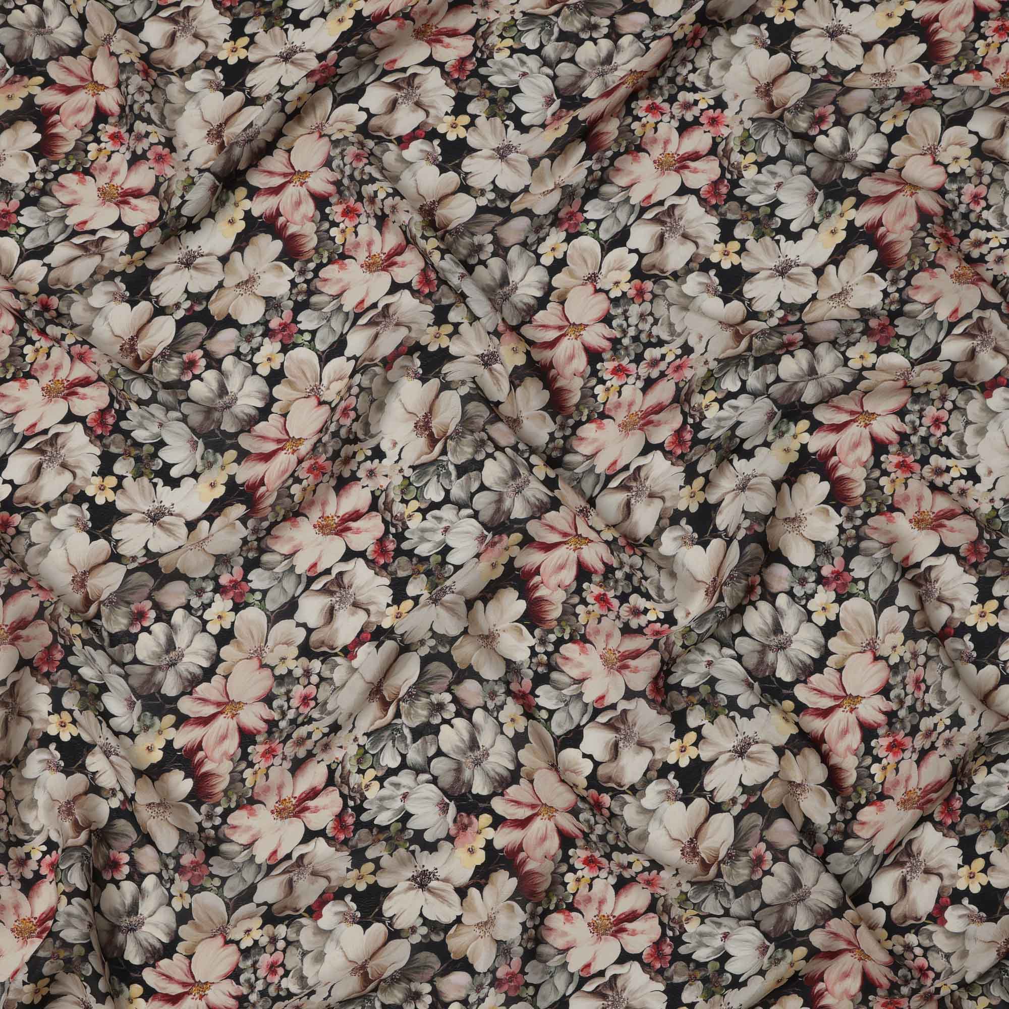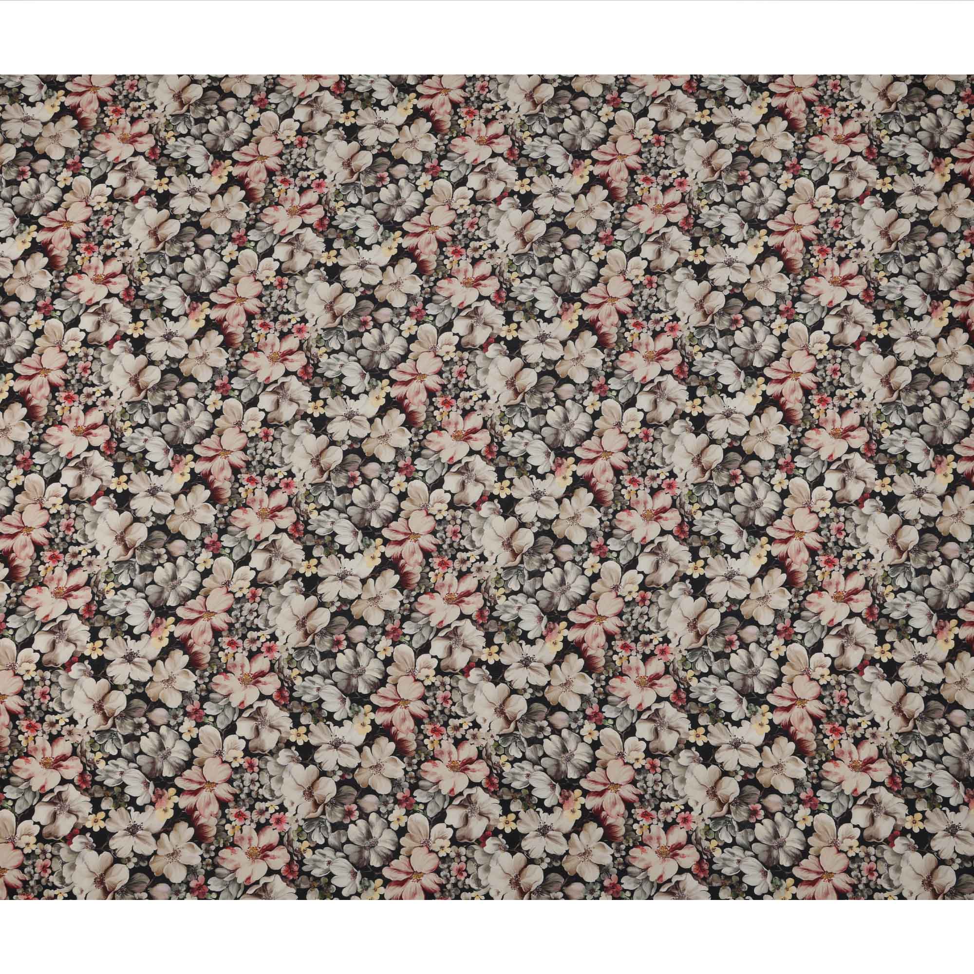 Black base with vintage-inspired floral bouquet print in soft hues