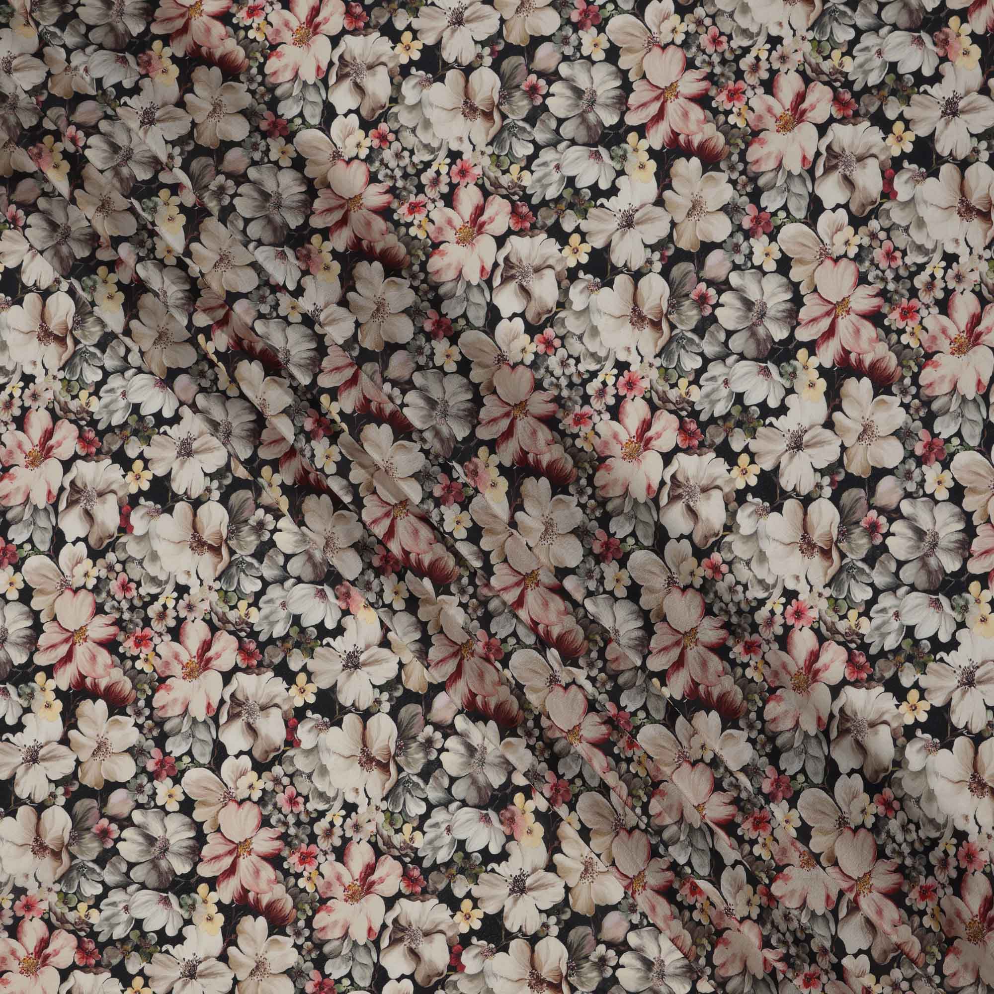 Black Floral Printed Viscose Crepe Fabric, All-Over Bloom Pattern, 110 Cms Width, Made in India-D23429