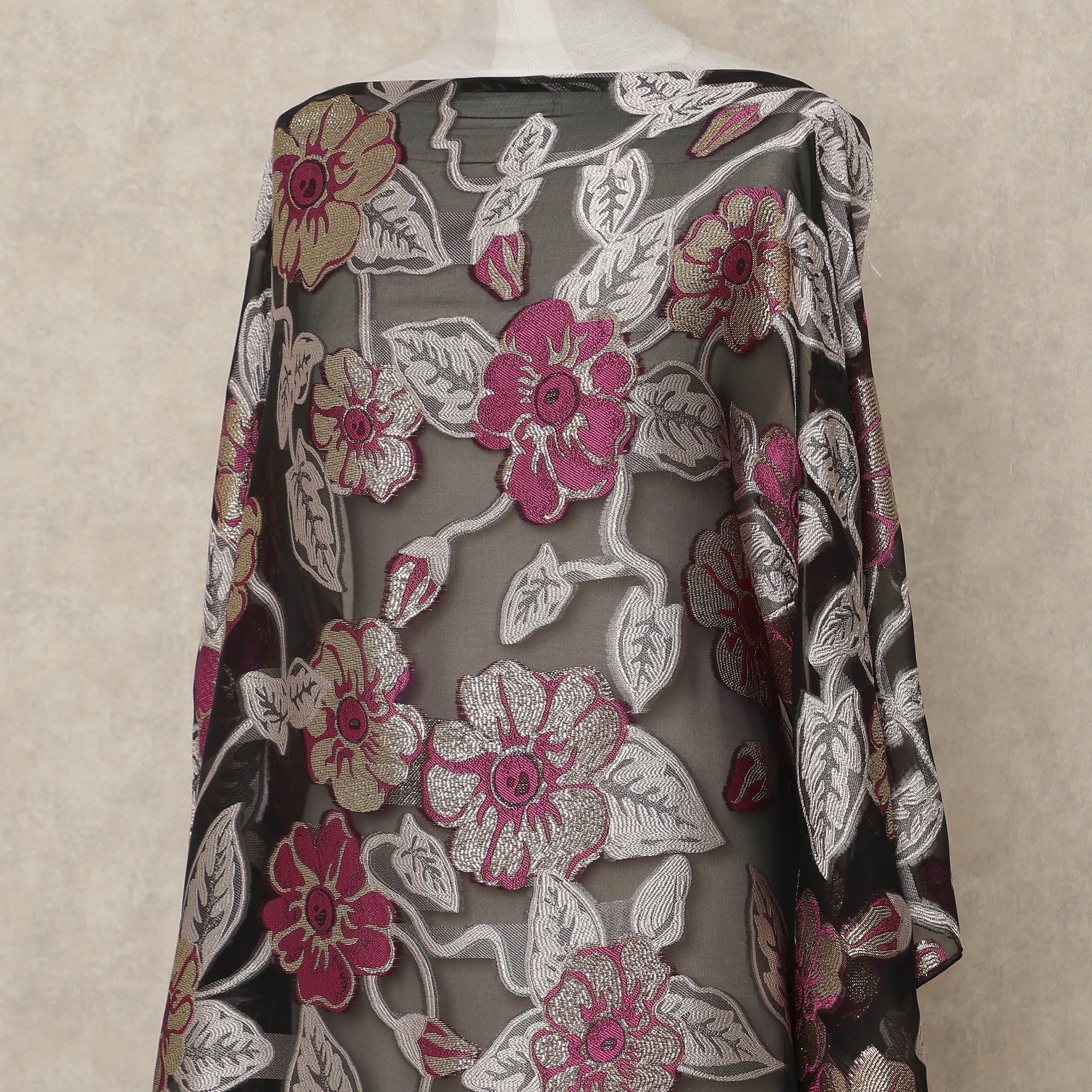 Classic black color enhanced with floral motifs and metallic lurex detailing