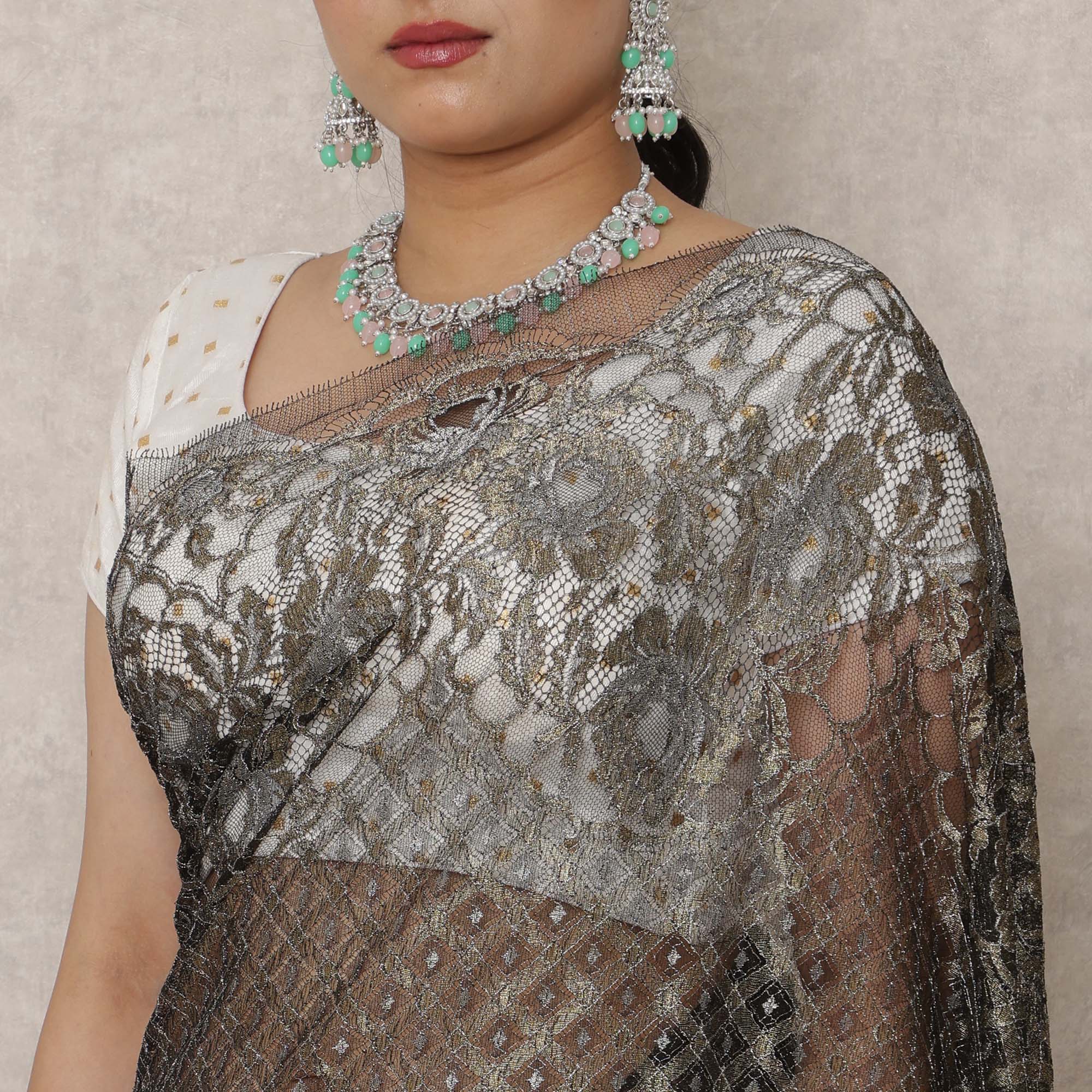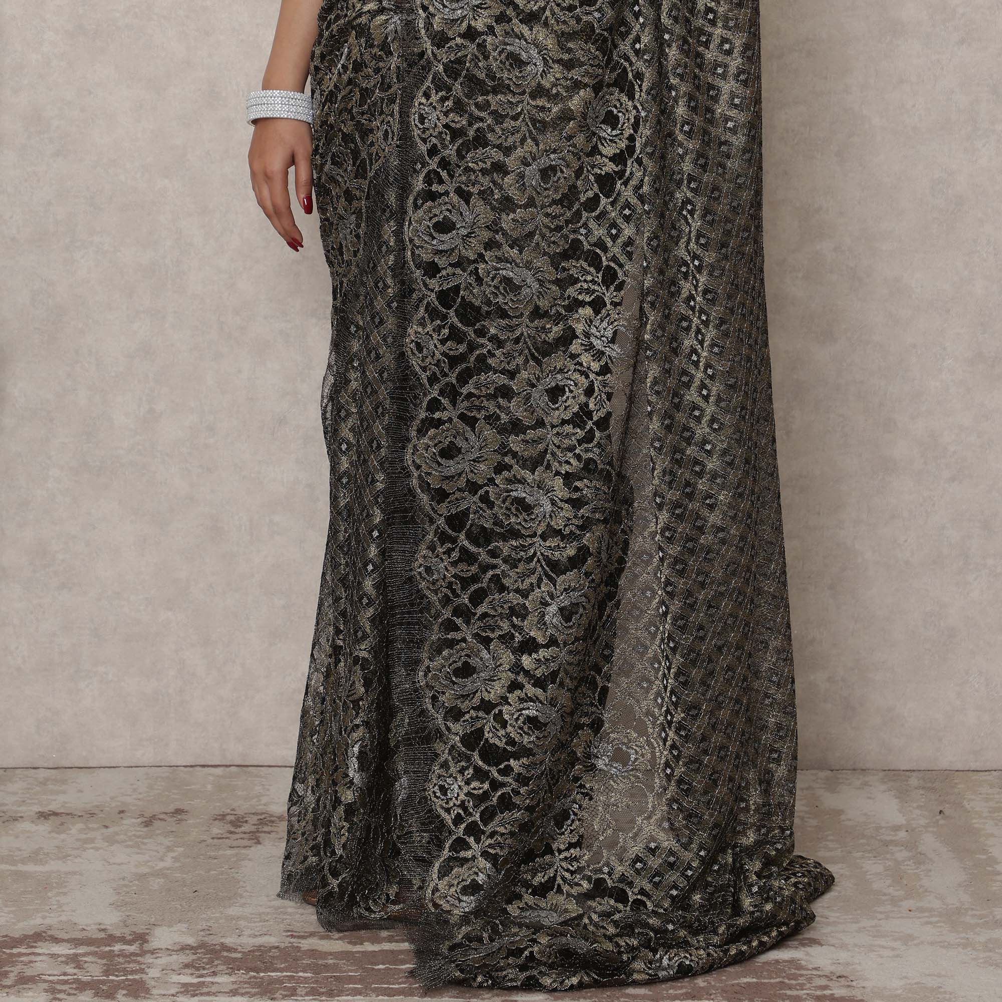 Drape yourself in the bold opulence of this Black Gold Premium French Metallic Chantilly saree lace, a luxurious piece measuring 5.5 meters in length and 110 cms in width. Crafted with intricate lace patterns in a captivating black base and shimmering antique gold highlights, this saree is a statement in regal fashion and French craftsmanship. The delicate floral and geometric weaving lends it a rich visual texture, perfect for high-end soirées, festive wear, and cocktail events. Made from premium Chantilly lace imported from France, it offers exceptional softness and elegance while maintaining a dramatic aesthetic. Its flowing drape ensures a graceful fall, enhancing every movement with subtle sheen. Blouse not included. Shop online now and add timeless European artistry to your ethnic wardrobe.
