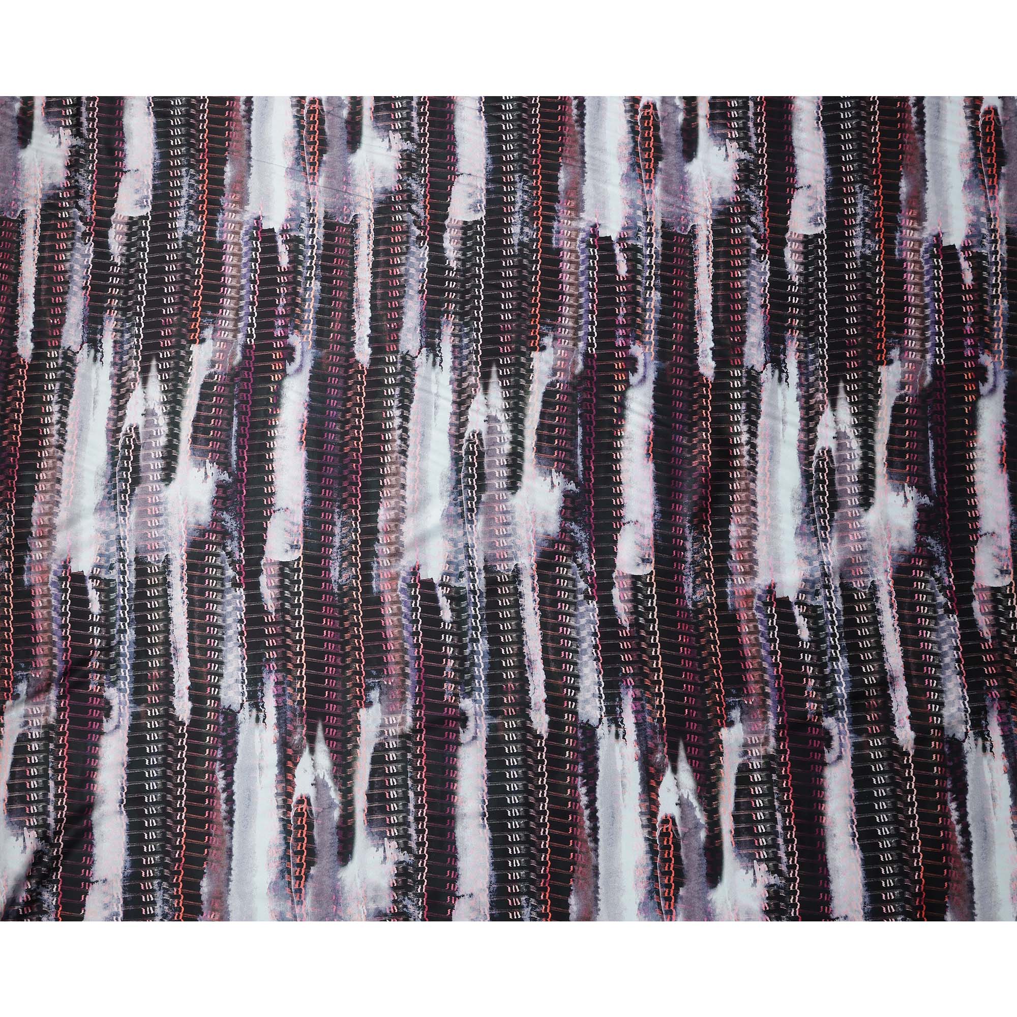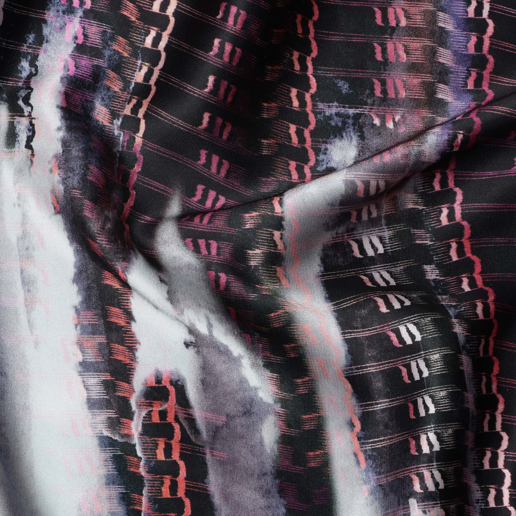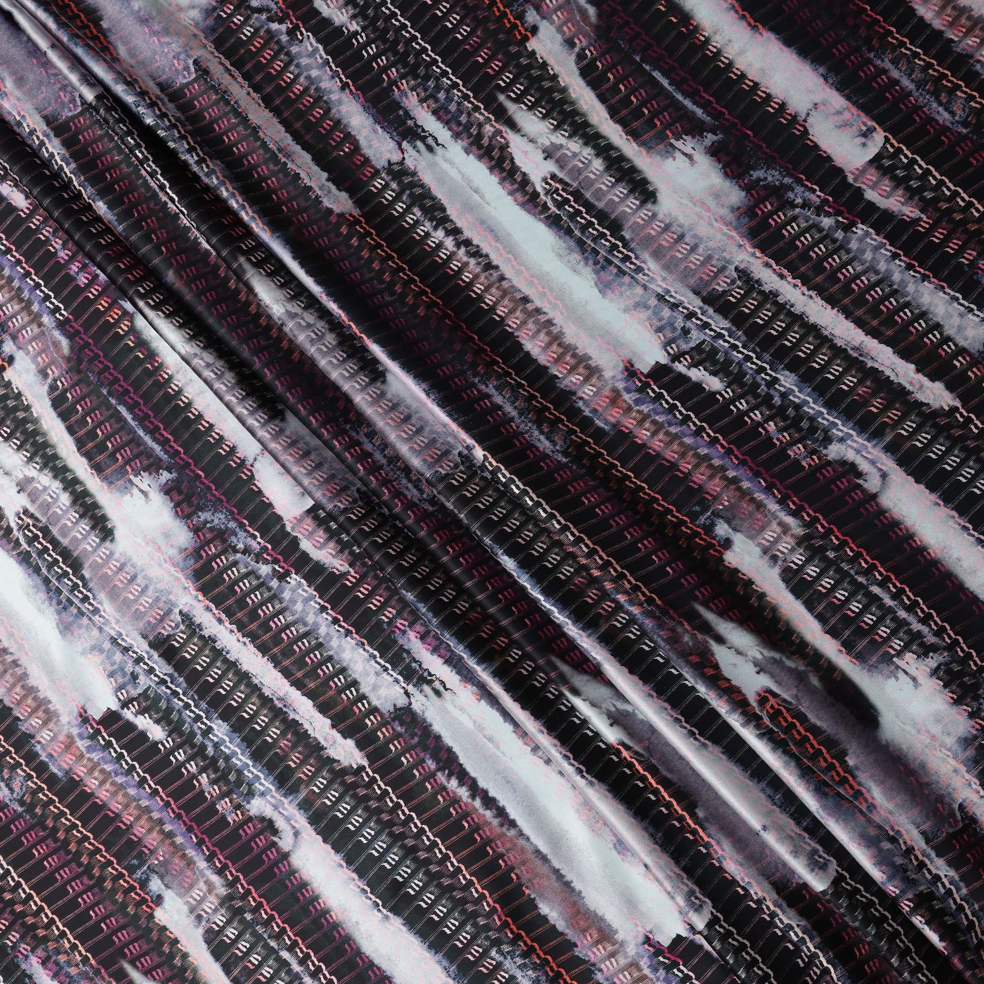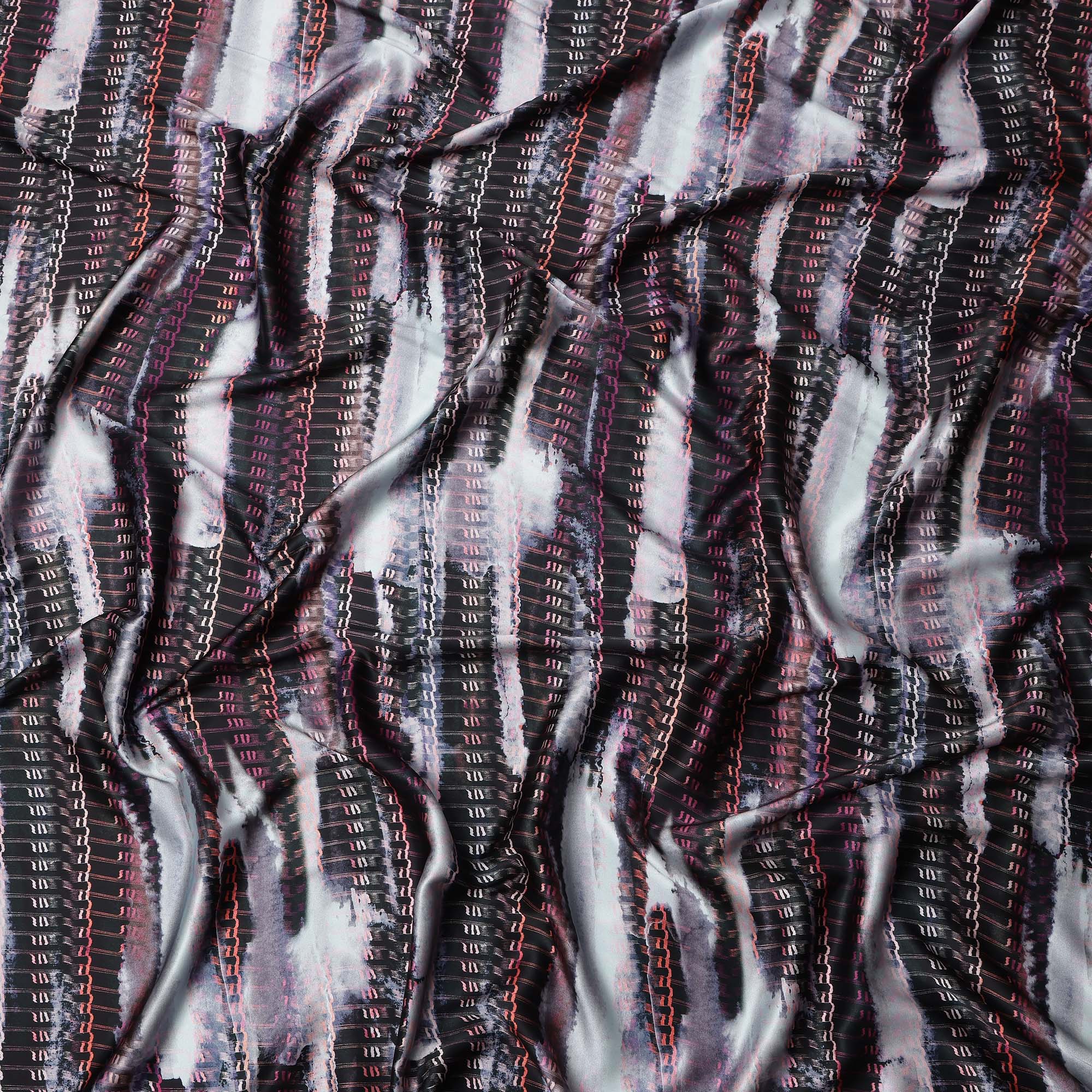 Black base with grey and white abstract striped print enhanced by red and mauve tones