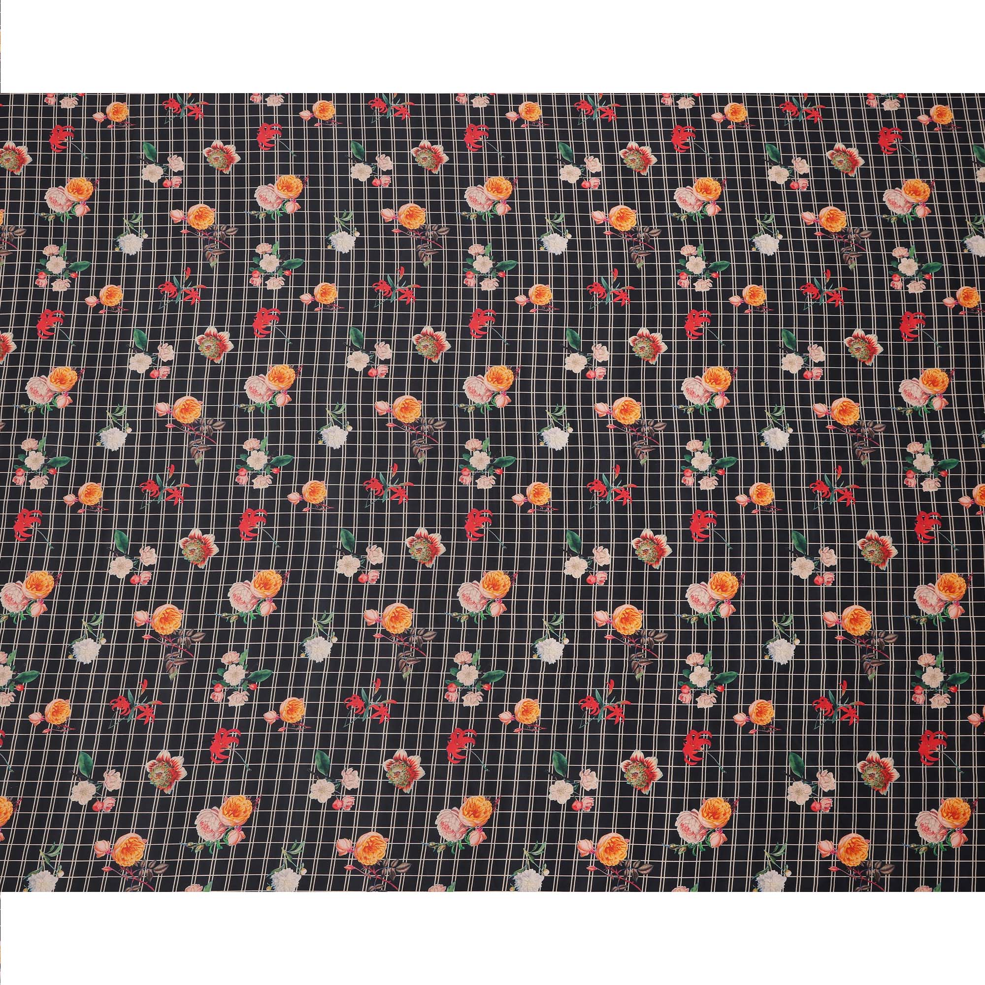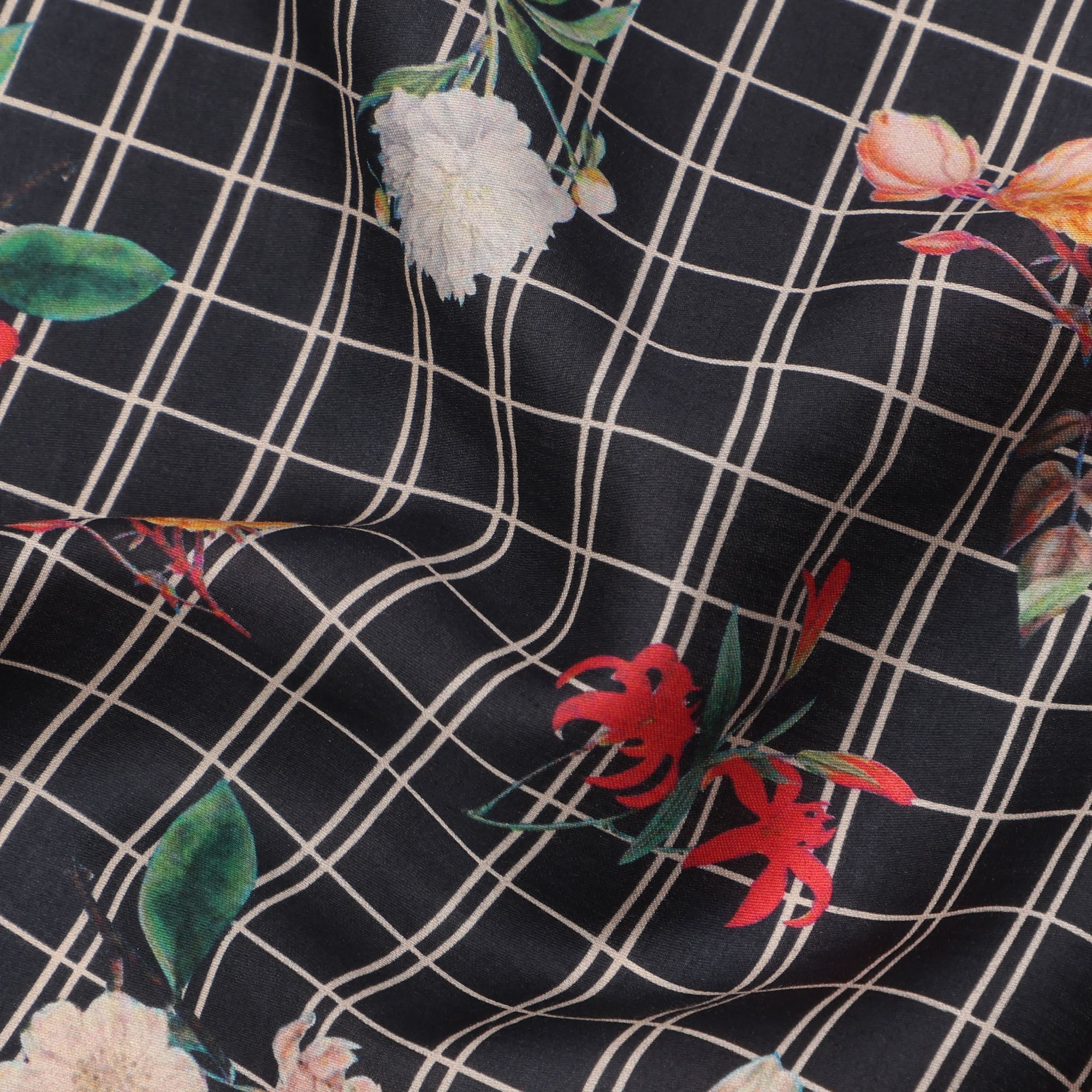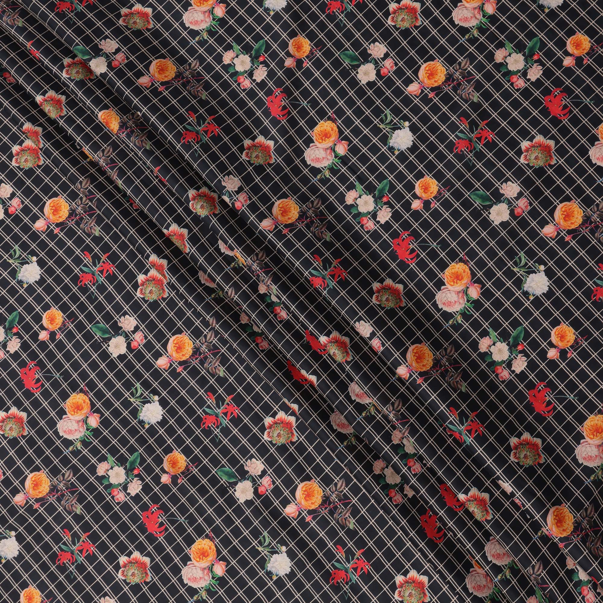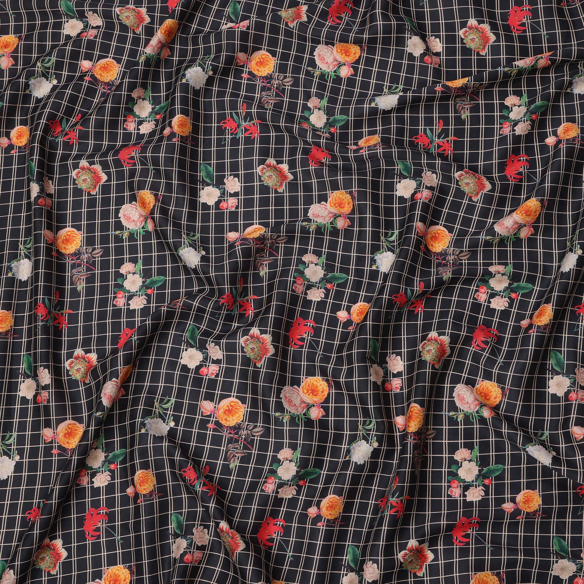 Black Grid Floral Printed Cotton Lawn Fabric with Rose and Marigold Motifs, 110 Cms Width, Made in India-D23952