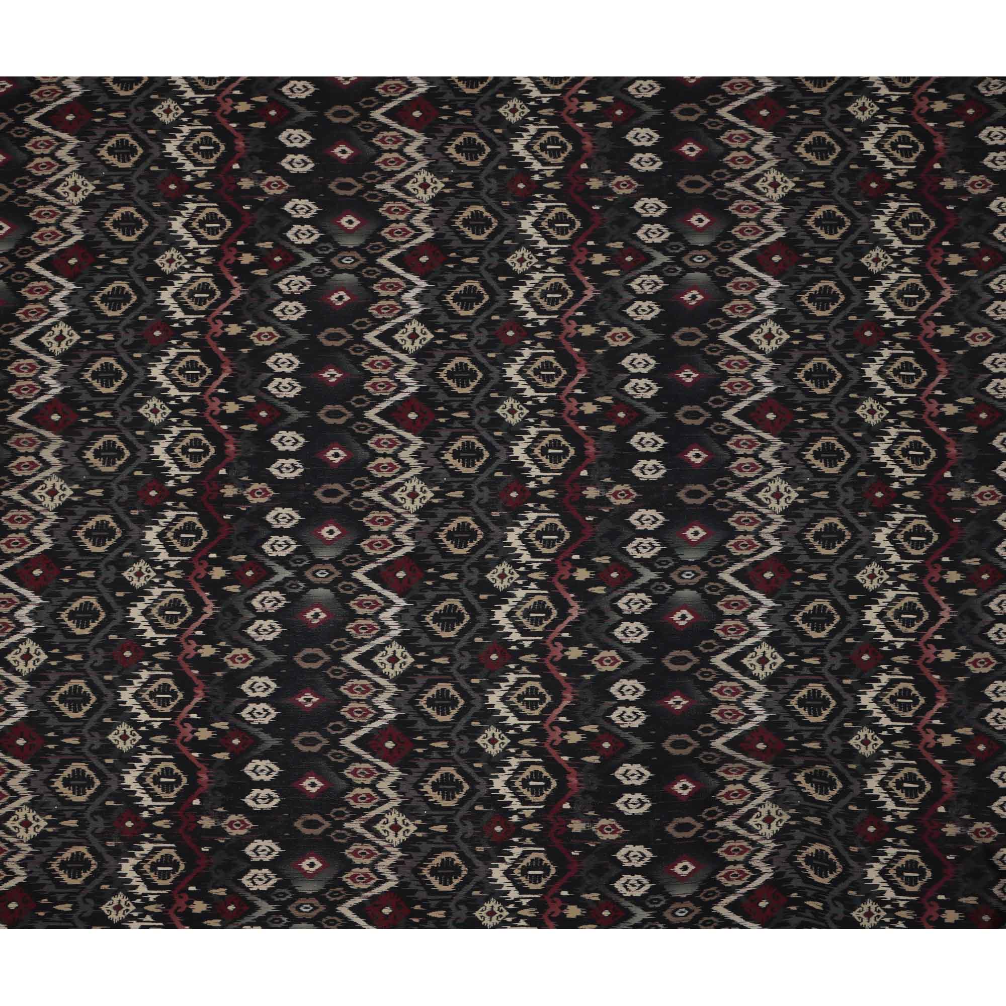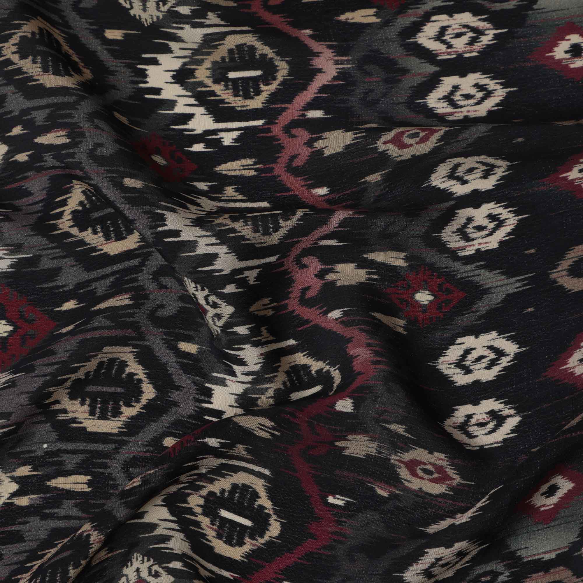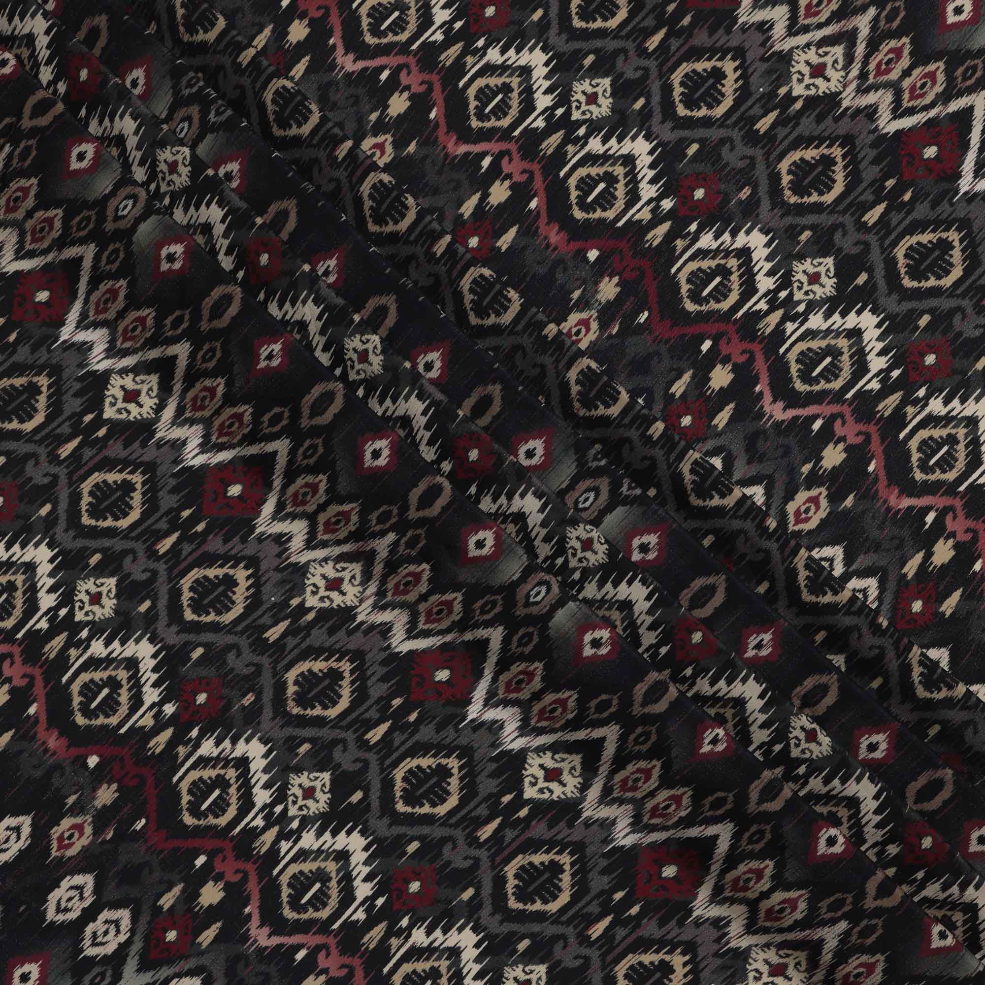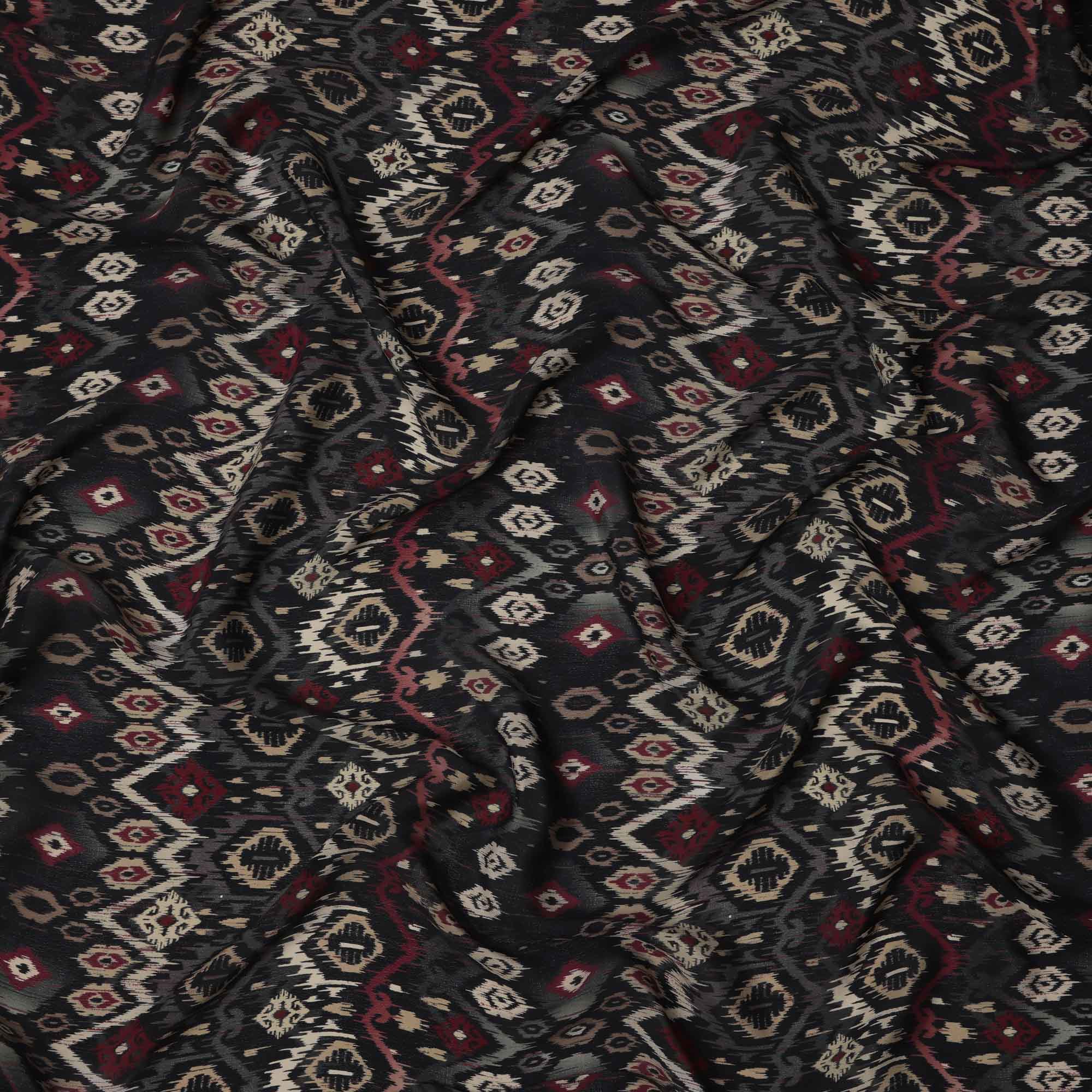 Black Maroon Ikat-Inspired Geometric Printed Viscose Crepe Fabric, Ethnic Fusion Pattern in Beige and Grey Accents, 110 Cms Width, Made in India-D23456