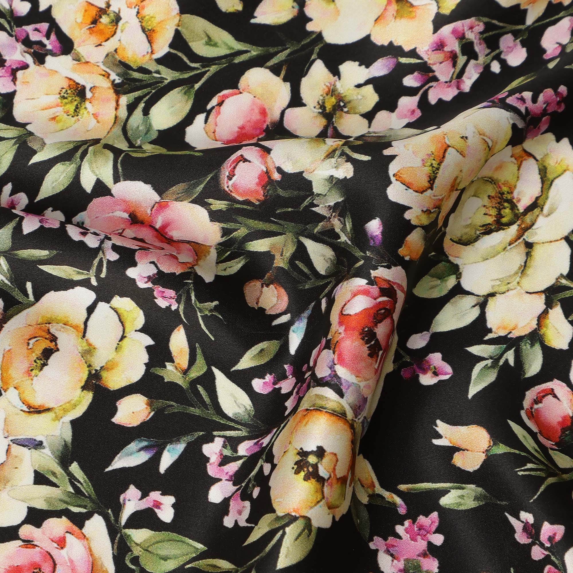 Black Multicolor Floral Allover Printed Premium Pure Silk Satin Fabric, 110 Cms, India-D27081
