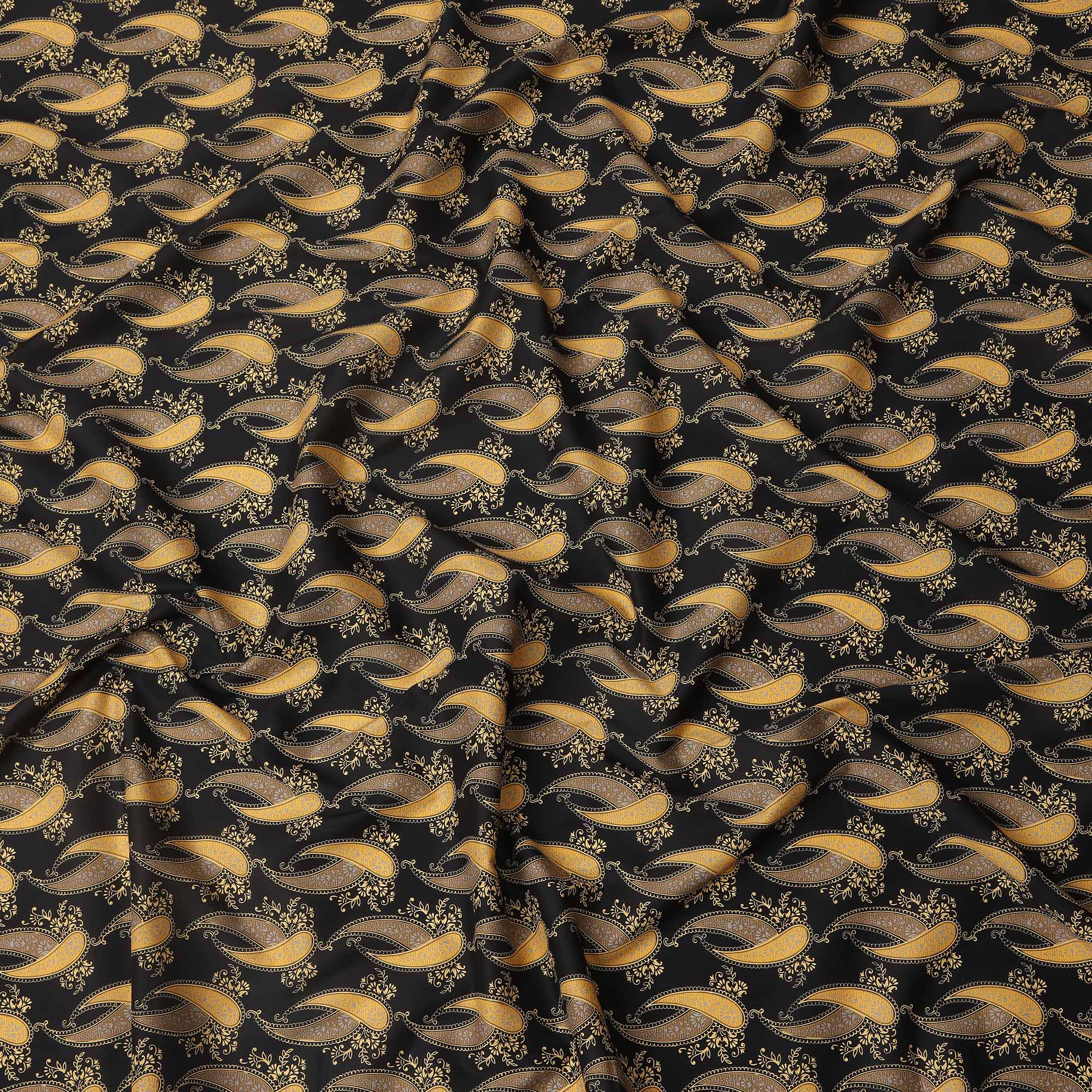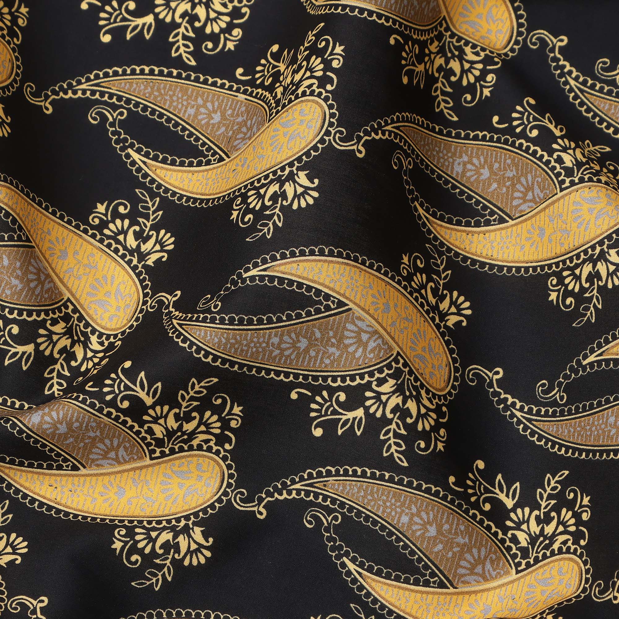 This black paisley printed cotton lawn fabric features a deep black base enriched with elegant mustard yellow and beige paisley... Read more Read more