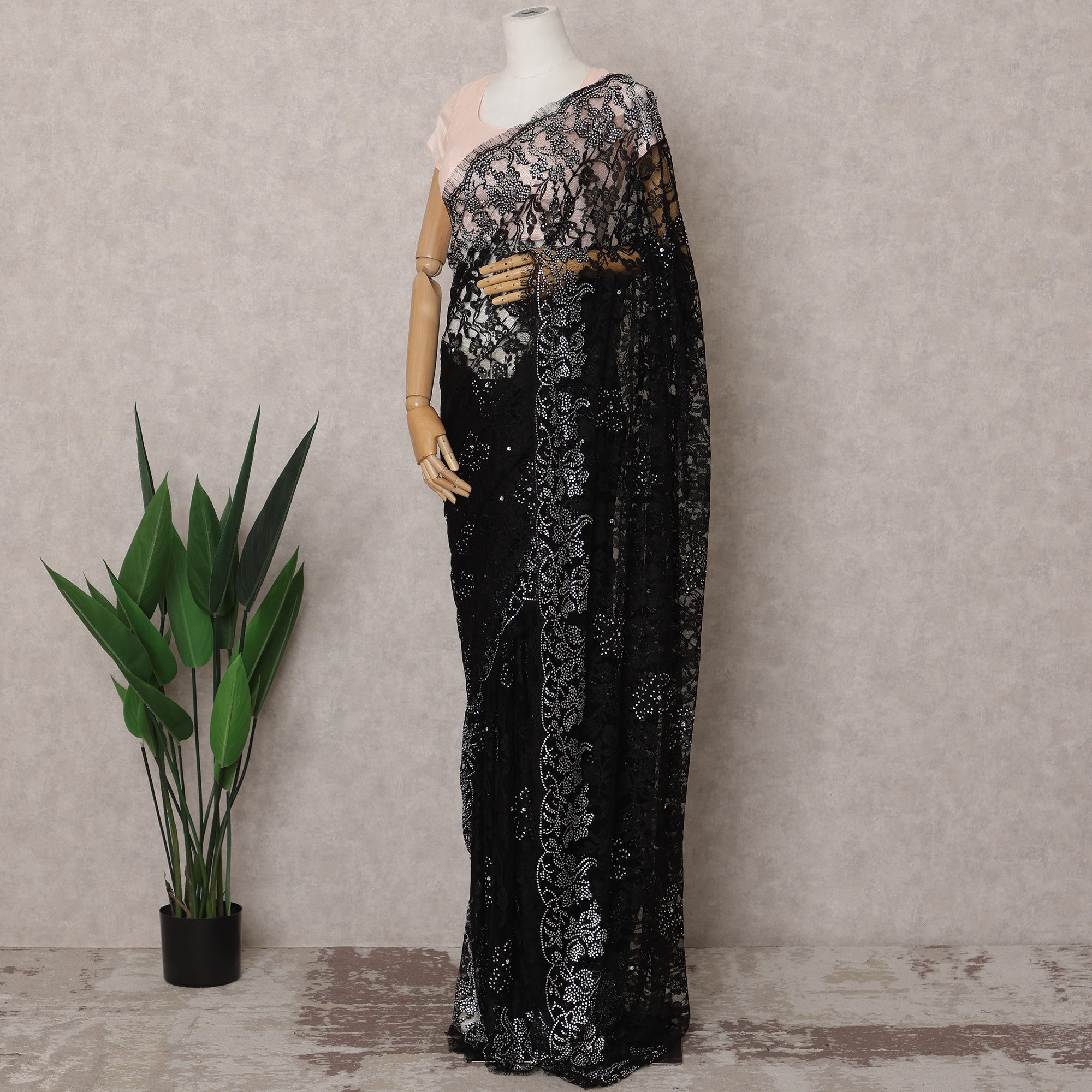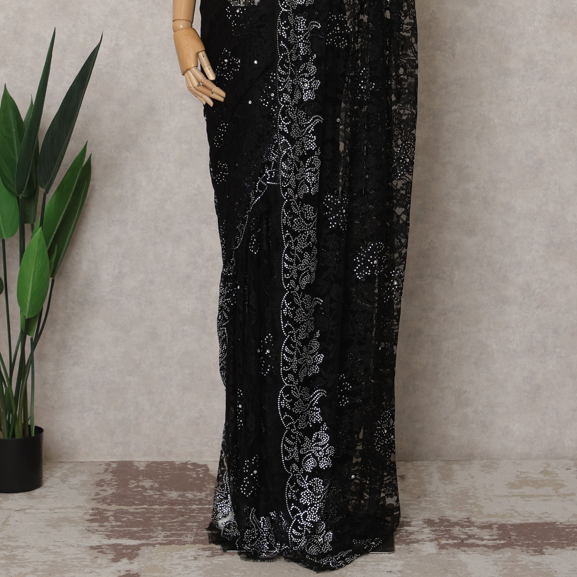 Unleash the timeless charm of black elegance with this Black Premium French Chantilly Lace saree fabric, meticulously crafted in France for those who admire classic sophistication with a couture edge. This 5.5-meter-long and 110 cm wide unstitched saree lace features an intricate floral design woven into sheer Chantilly lace, enhanced by graceful scalloped borders and hand-applied stone work that adds subtle sparkle and depth. The luxurious black base serves as a perfect canvas for the shimmering silver-toned details, creating a high-contrast, striking visual impact ideal for evening wear, receptions, or formal ethnic events. Lightweight and airy, the fabric drapes beautifully, offering both comfort and style in every pleat. Its delicate craftsmanship and imported quality make it a standout piece for creating personalized designer sarees. Blouse piece is not included. To maintain the finesse and shimmer, dry cleaning is recommended. Shop online now to bring home the elegance and allure of French lace with this bold and beautiful black saree fabric.